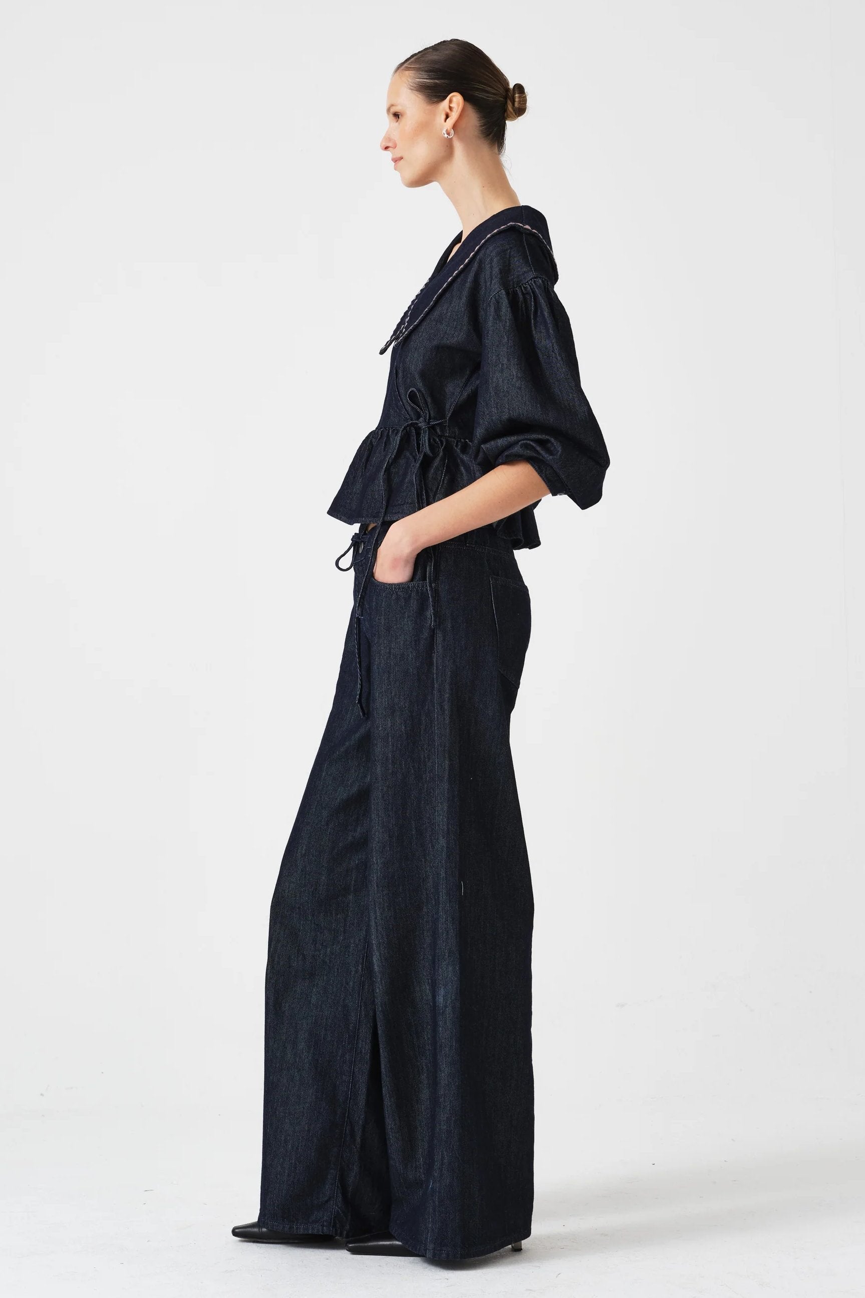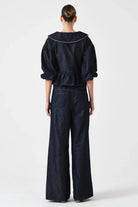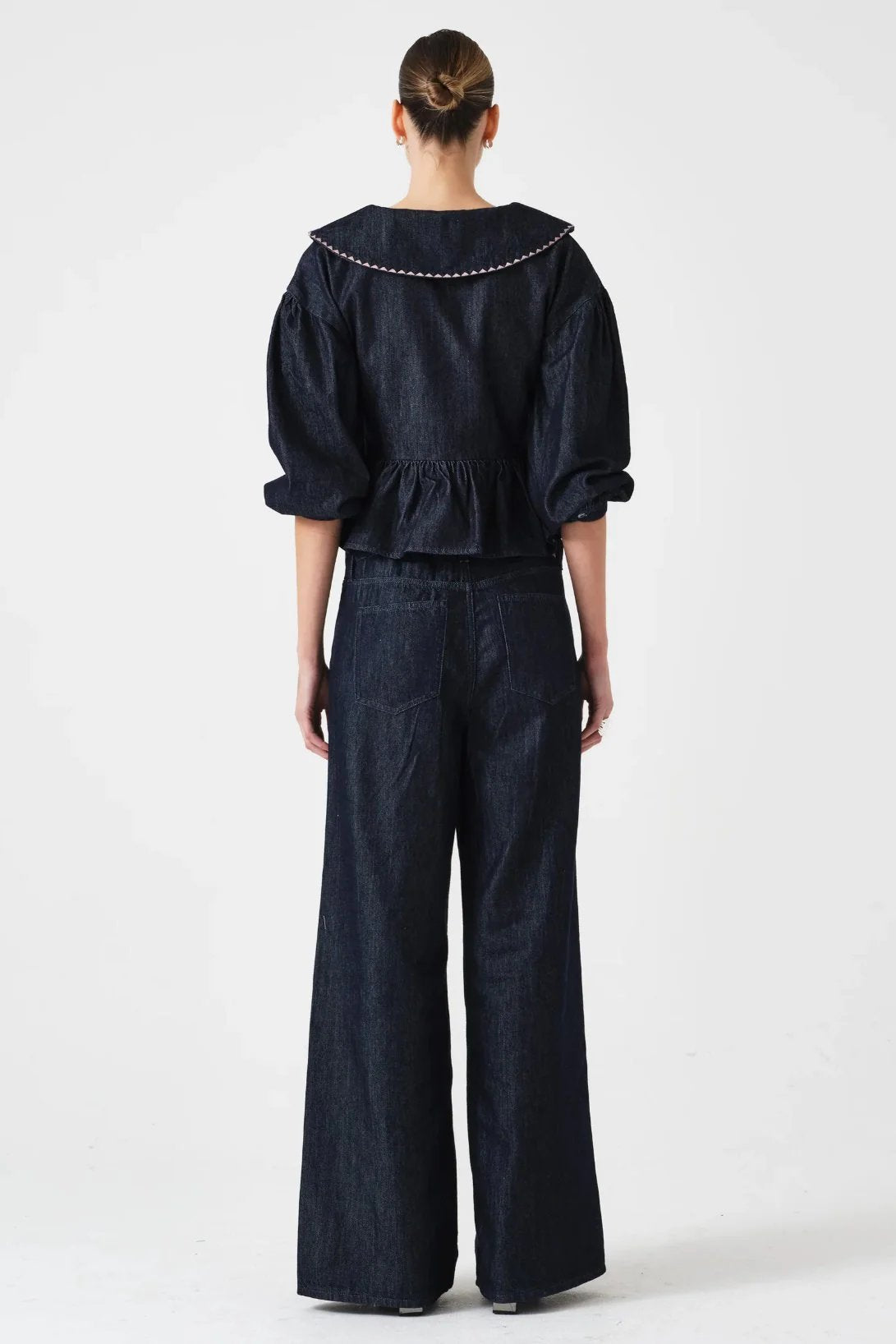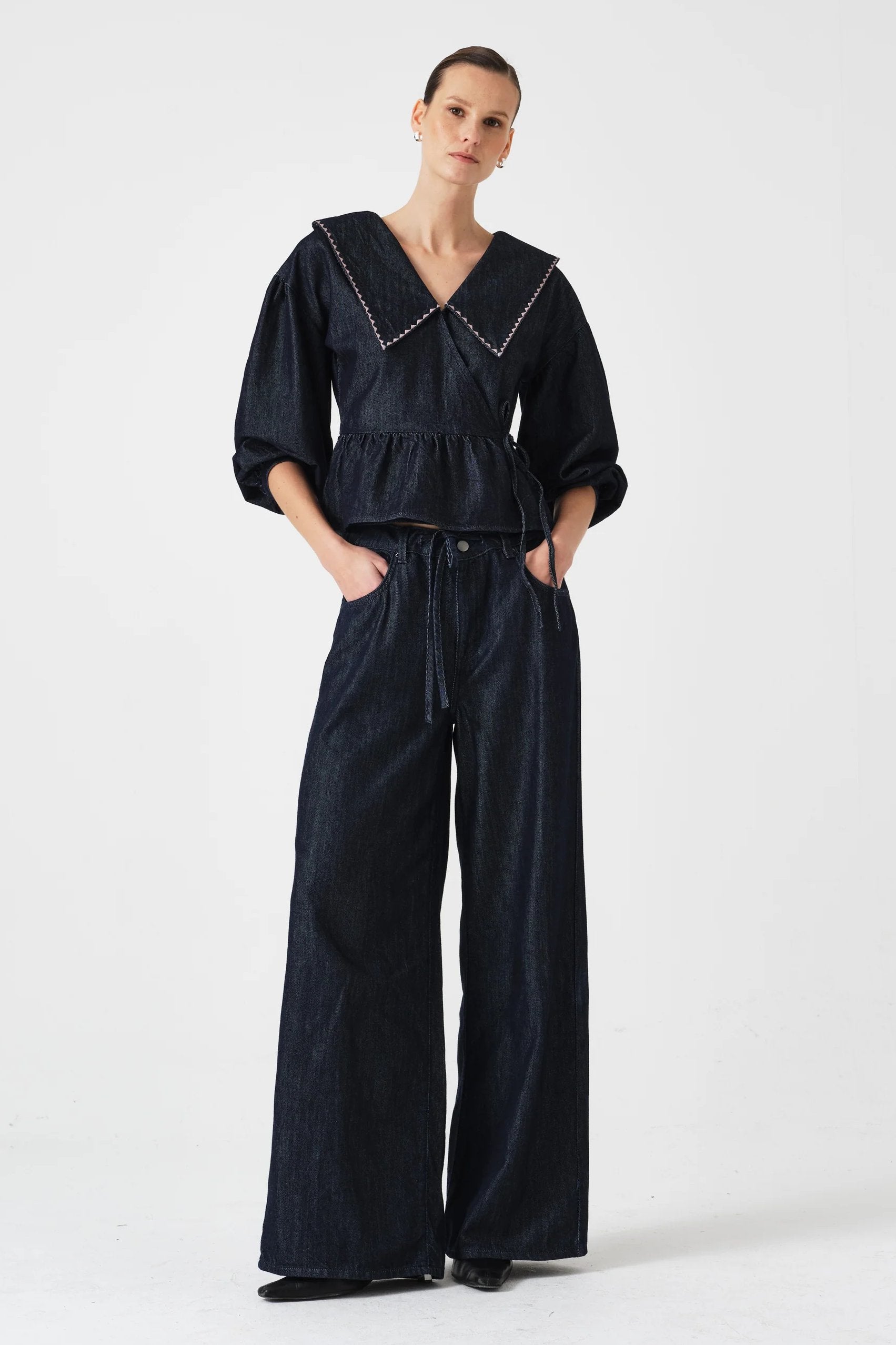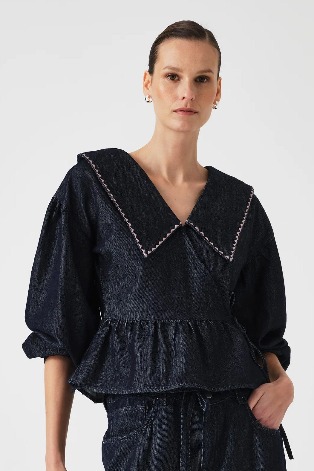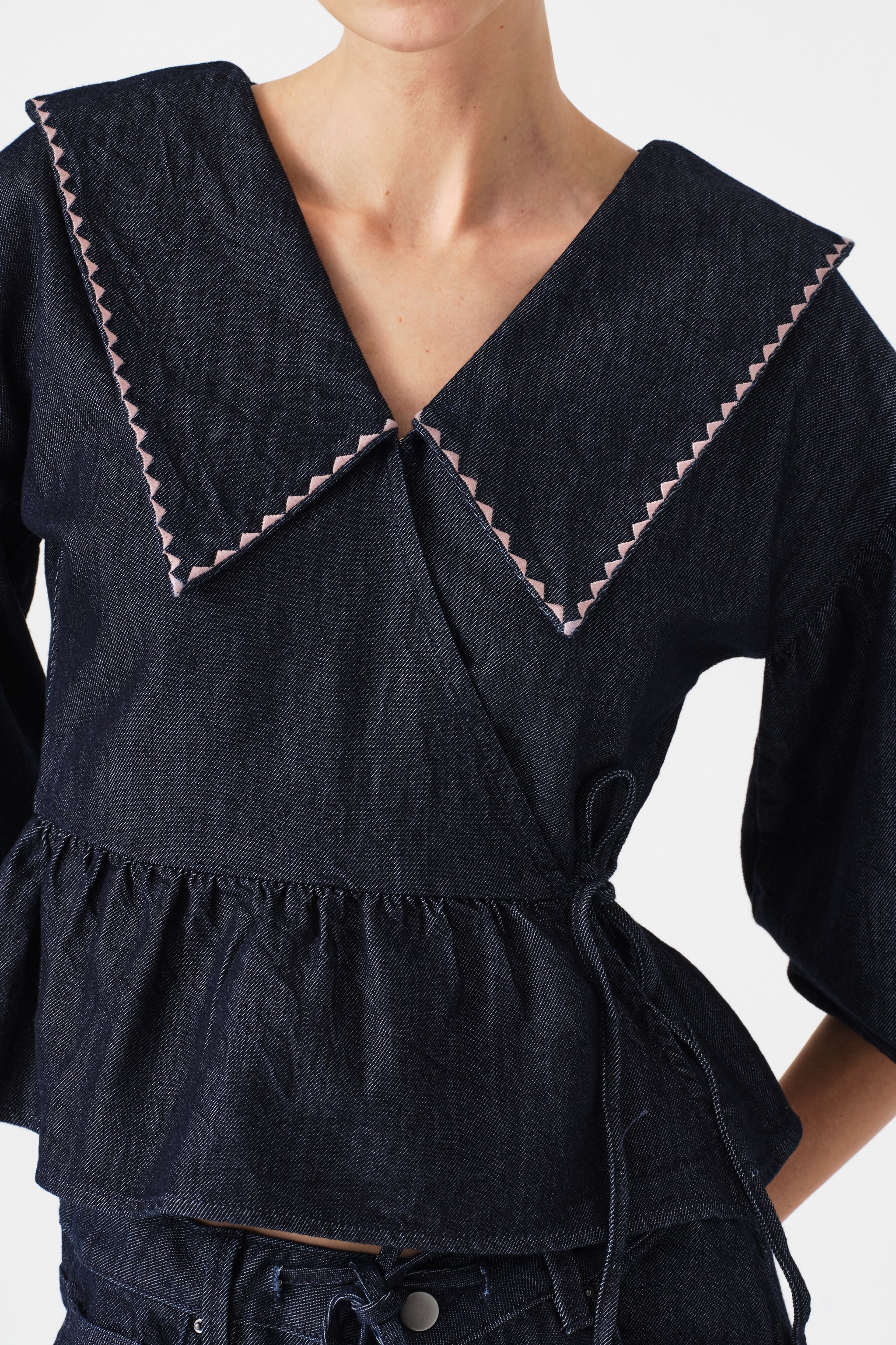 A lightweight denim wrap blouse - effortlessly chic with a playful twist. Featuring a flattering wrap silhouette and feminine peplum hem. The statement oversized collar is finished with soft blush pink embroidery for a subtle pop of contrast.