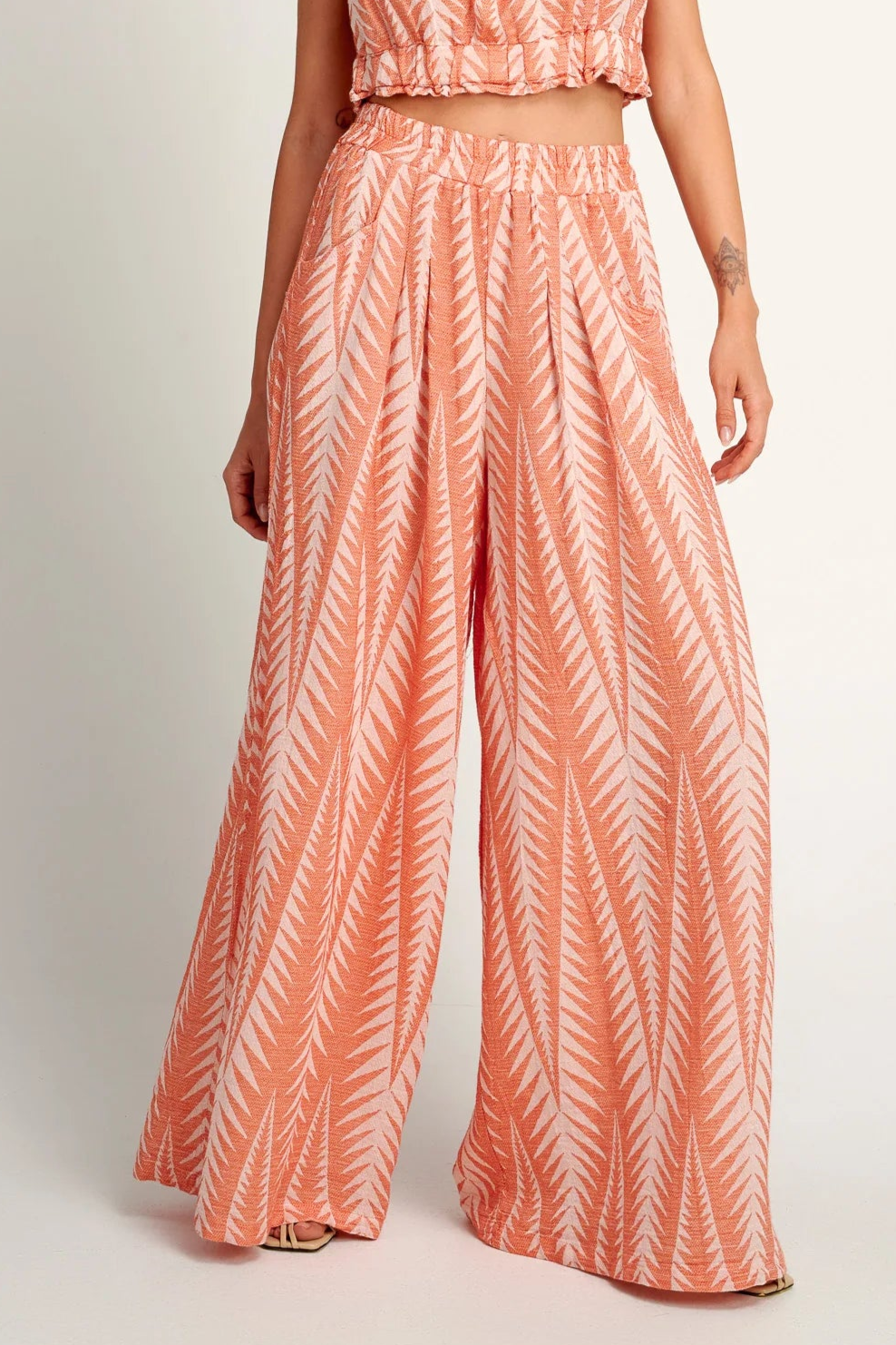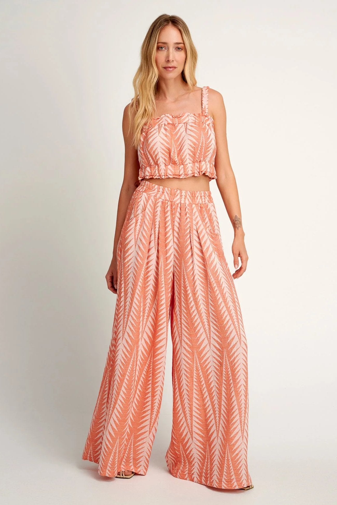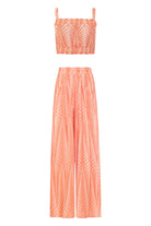 The Finikas Mandarin Zakar Set by Pearl & Caviar is an ode to effortless resort dressing, combining the cropped top and wide-leg pant in a vibrant, artisan-woven jacquard. Crafted in Greece from a breathable cotton–silk blend, this matching set strikes the perfect balance between relaxed ease and elevated style. The cropped top’s soft, romantic sleeves and tie-back detail pair seamlessly with the high-waisted, fluid pants, creating a coordinated look that moves beautifully from day to night. Whether worn together for head-to-toe impact or styled separately, this is a versatile, timeless duo that embodies laid-back luxury.