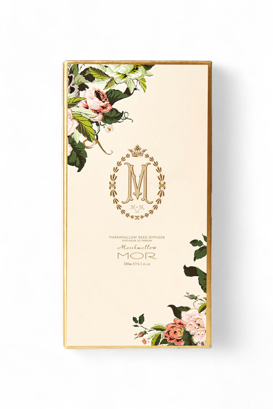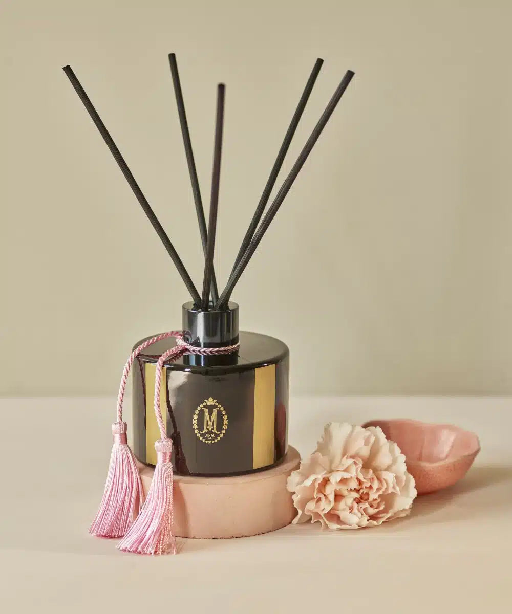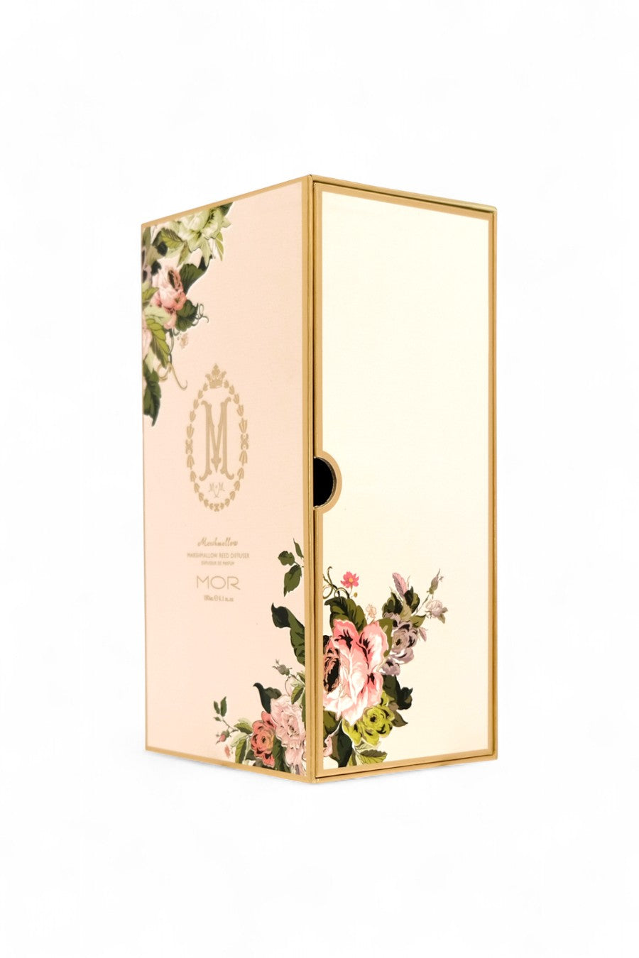 The Marshmallow textured linen box is decorated with a floral pattern, inspired by a classical beautiful English Rose Garden with a touch of Victoriana, and gold foiled for a luxurious feel. The luxe reed vessel is decorated with a gold foil label and features black Reeds for opulence.