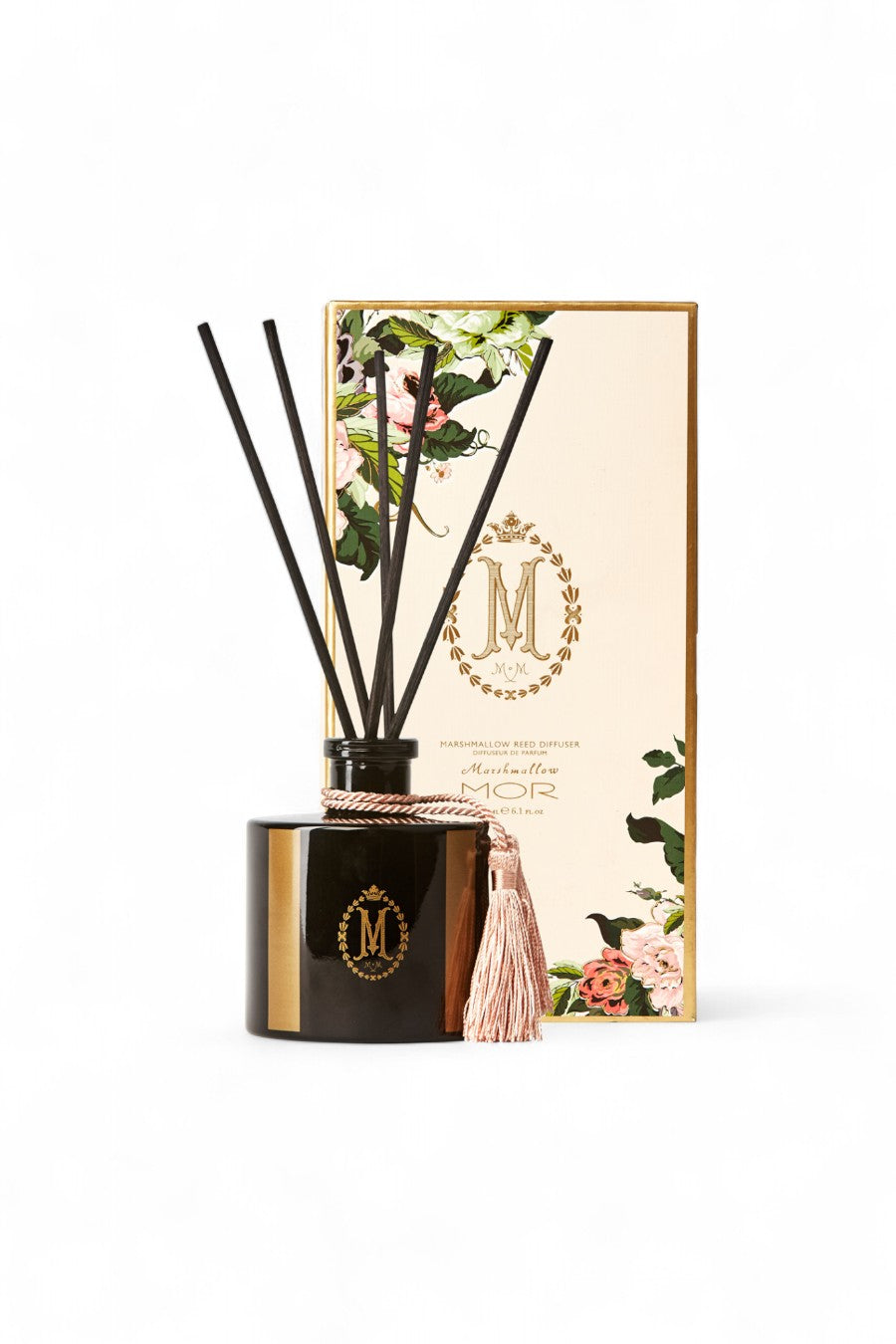 Opulent floral decadence entwined with the elegance of English Rose and Snow Musk exudes from this exquisite mini Reed Diffuser. Complete with Black Reeds and adorned with a tassel, let the mesmerising scent of Marshmallow gloriously rapture and add a nostalgic ambience to any space.