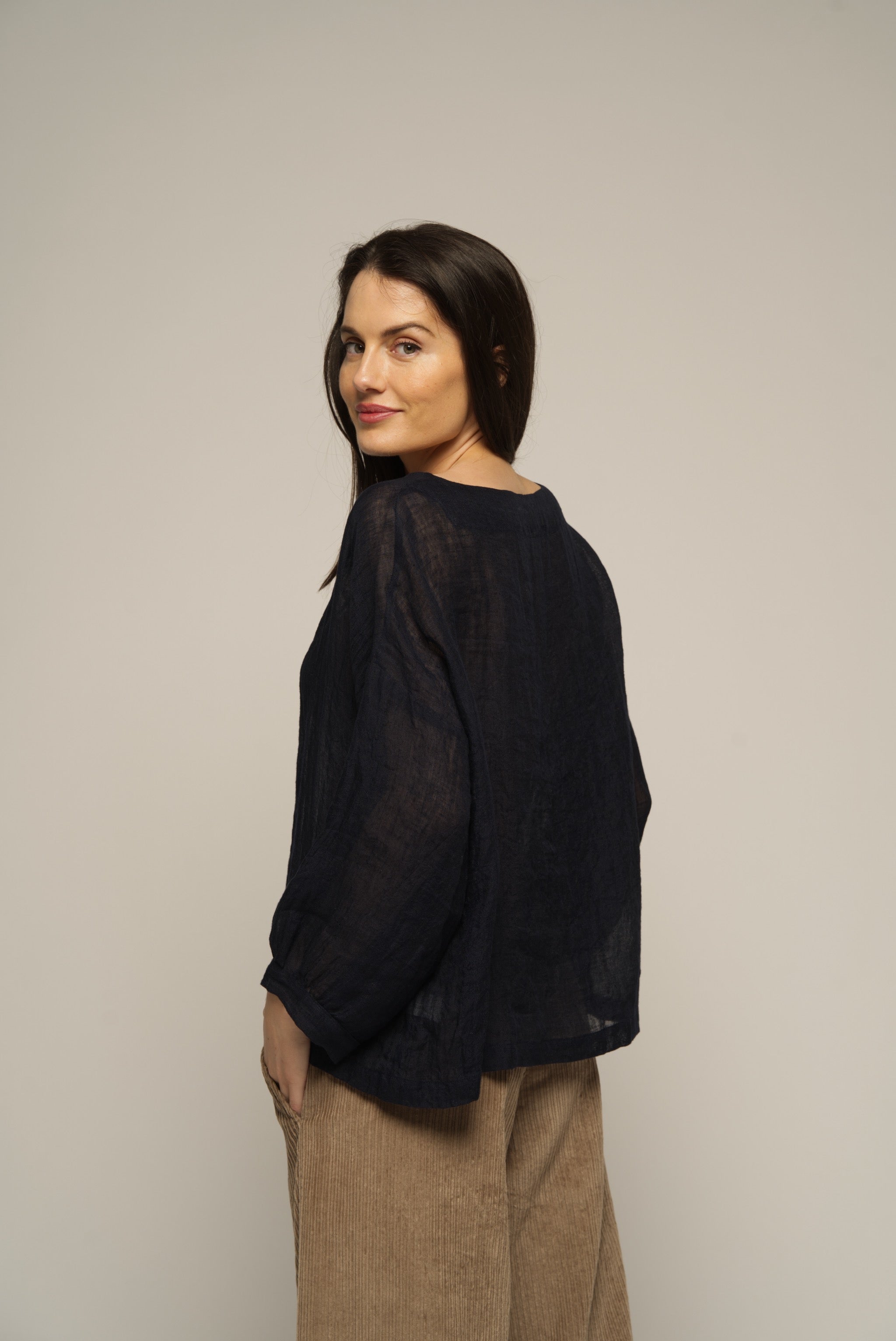 The Cora Top features a relaxed fit, 3/4 sleeve with gathered cuff and round neckline. Made from soft, light linen fabric, this is the perfect piece to wear on its own or layer with your favourite jacket or vest as the weather gets cooler.  Designed to seamlessly pair with your favourite pieces from past collections.