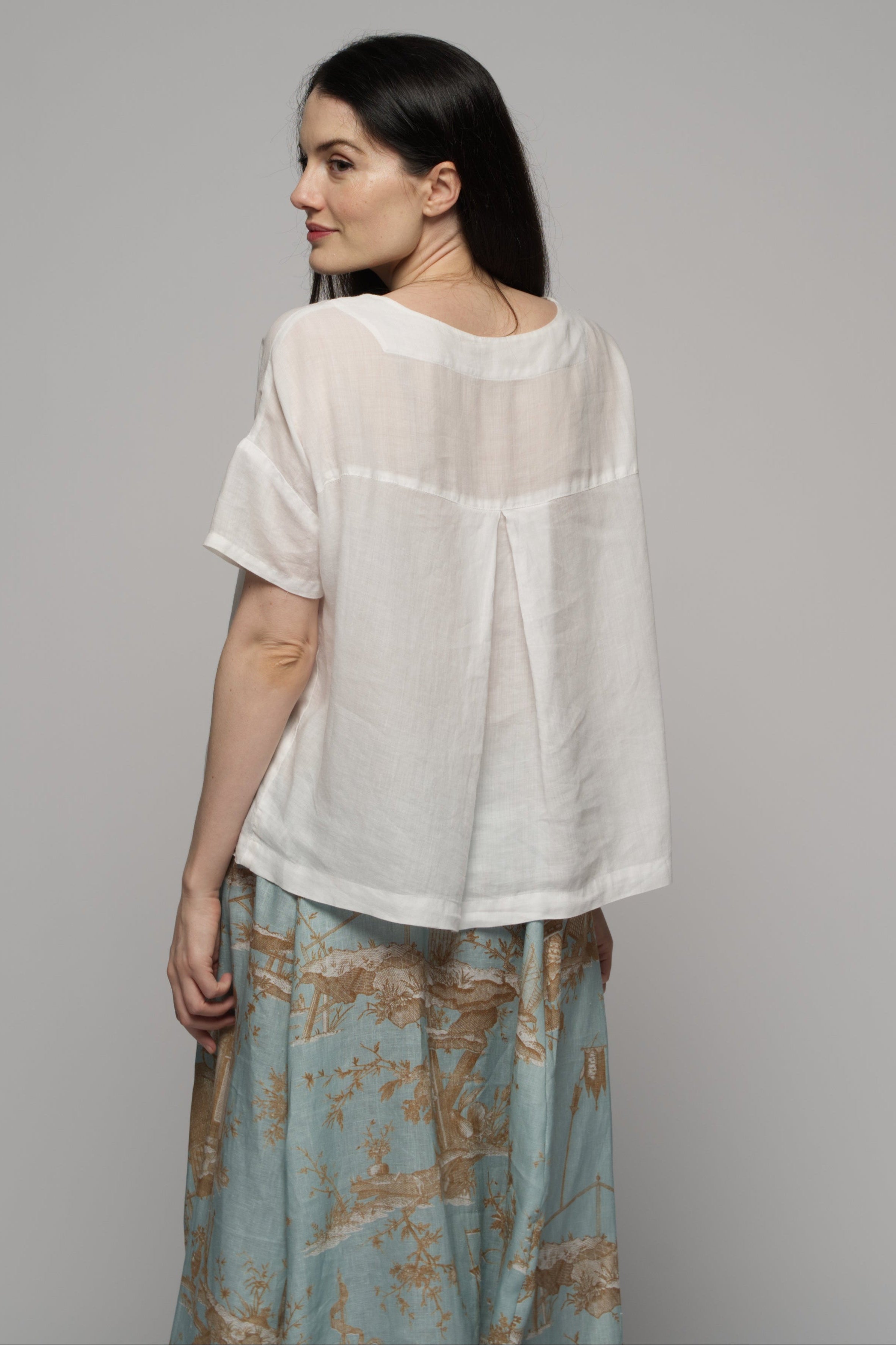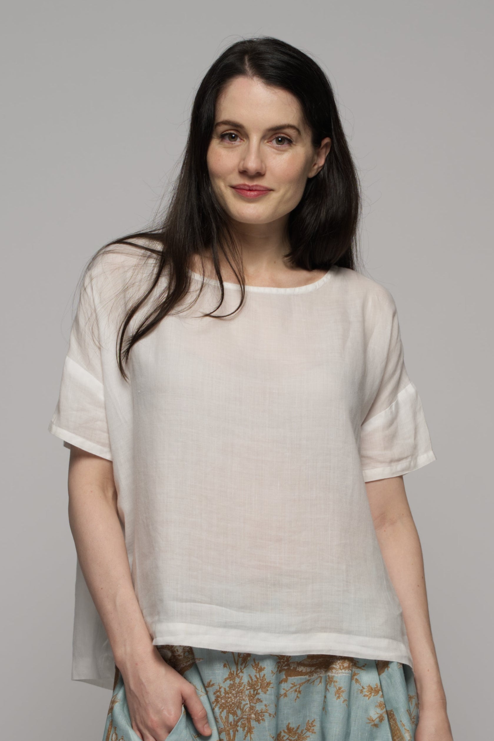 This linen top has a delicate boat neckline and relaxed drop shoulder sleeves. It's made from a slightly sheer linen fabric that is lightweight in feel, and has a subtle dropped back hem and shoulder with a feature pleat mid shoulders. Made in Australia.