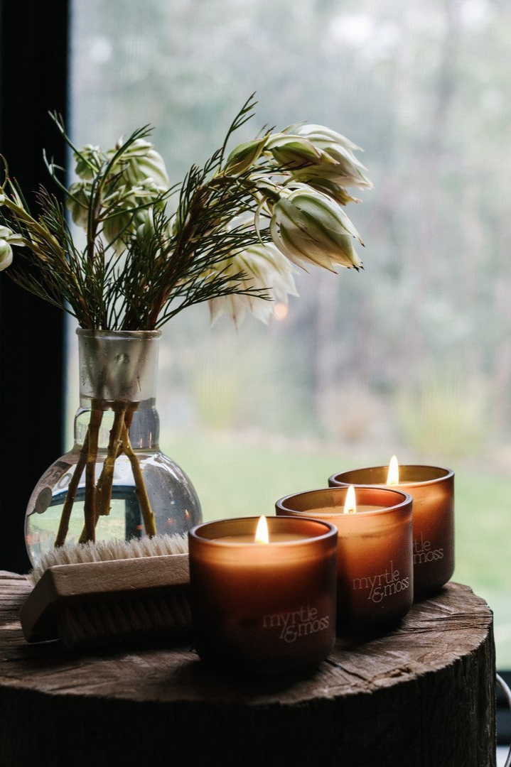 We have poured our signature essential oil blends into three delightful Mini Soy Wax Candles. The candles can be burnt together or separately, filling the home with the superlative scents of Myrtle & Moss.