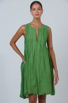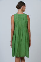 Feels like your own kind of quiet luxury. This sleeveless dress features a notched neckline with button accents and soft pleats that flow into a relaxed A-line silhouette. The artfully gathered 100% crinkle cotton creates natural texture and movement, offering a perfect balance of refined style and all-day comfort.