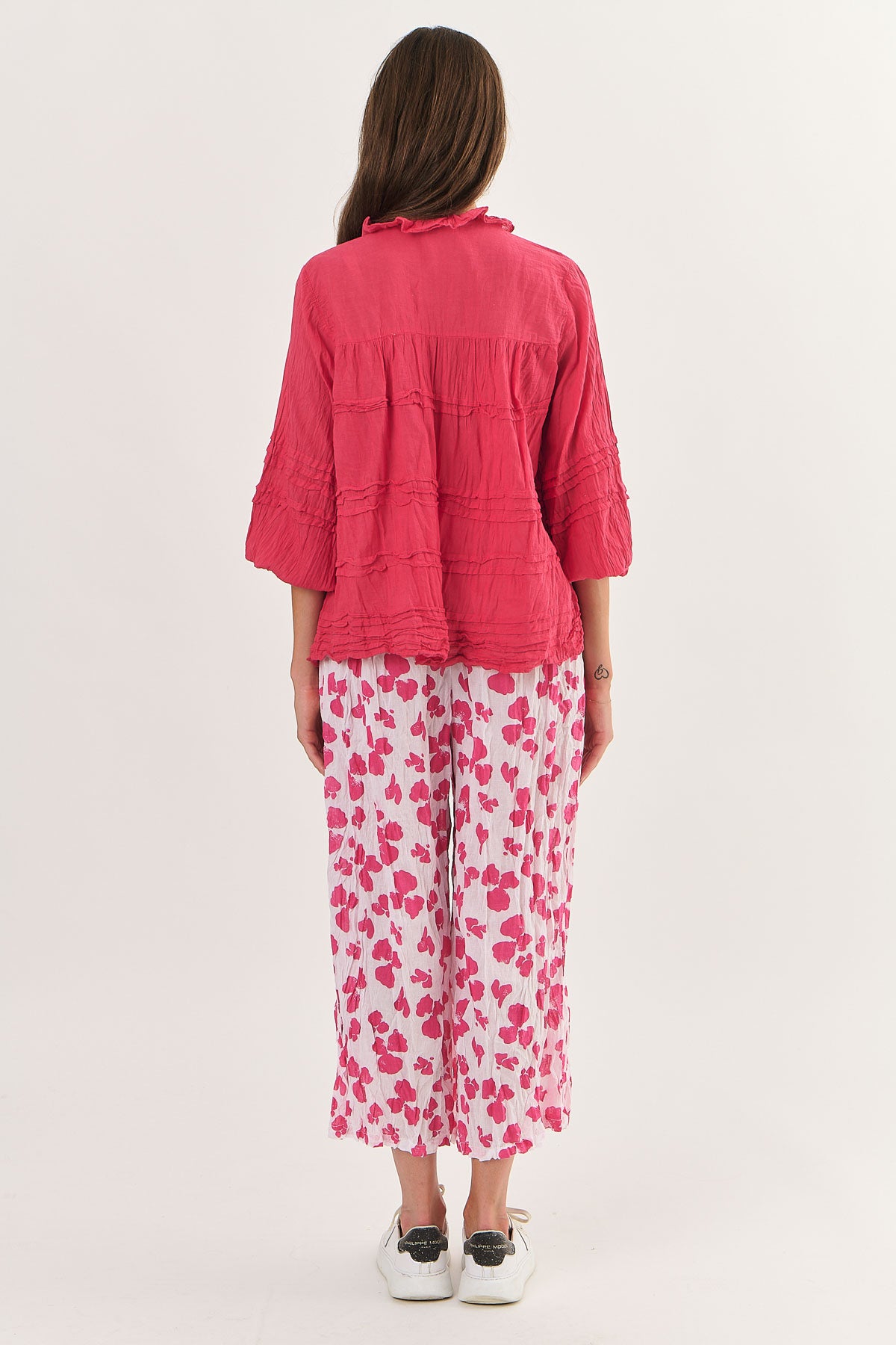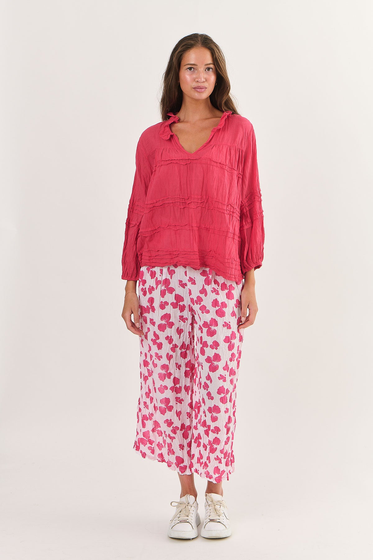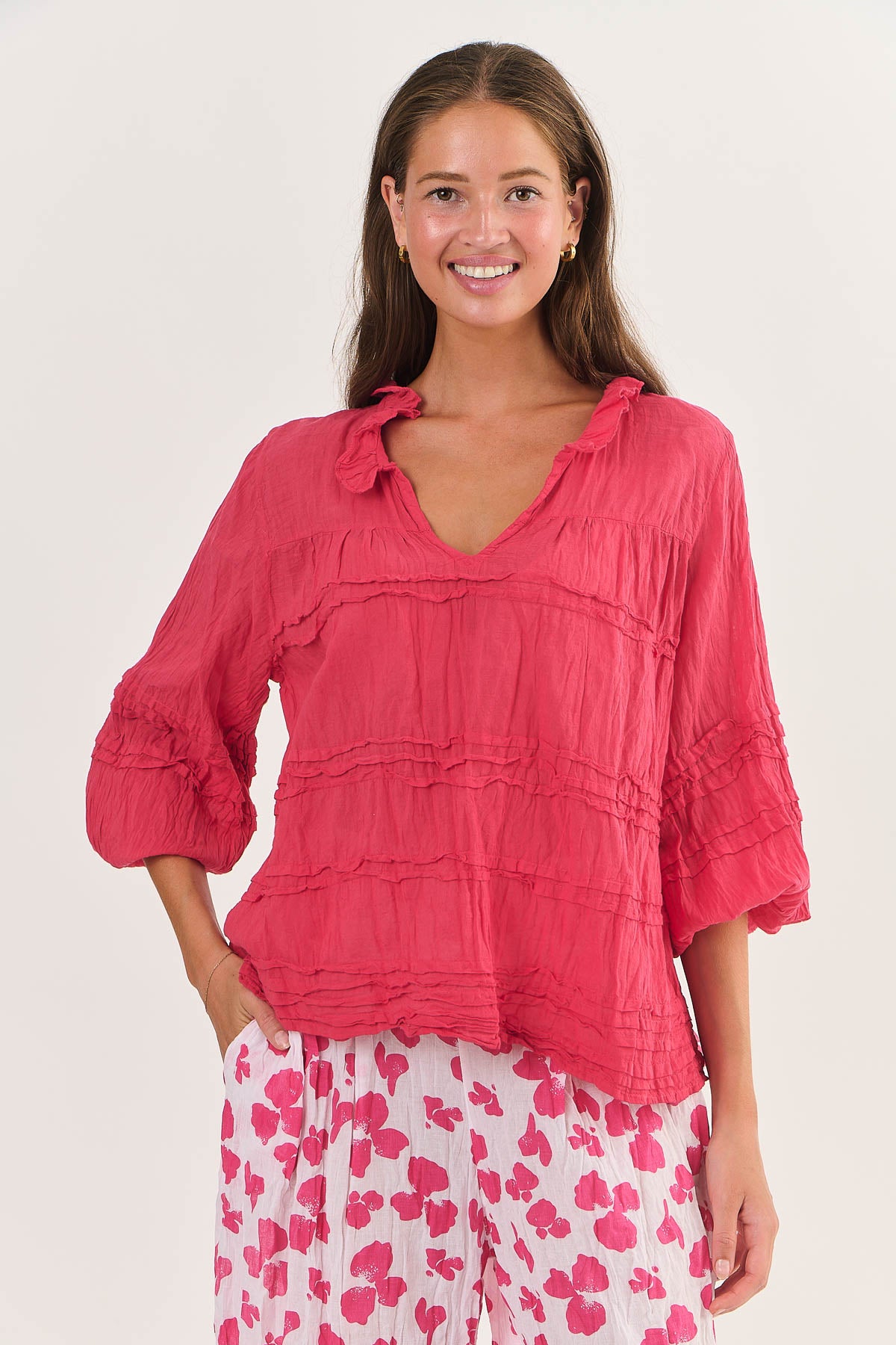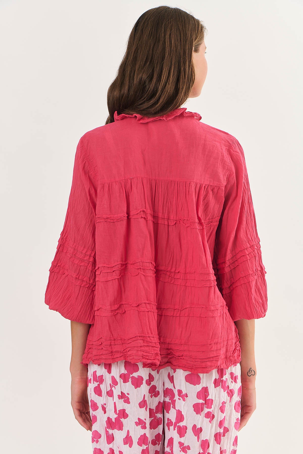 Featuring a V-neckline with a loosely ruffled collar, P92 is a relaxed, long-sleeve top made from 100% crinkle cotton. Layers of pintucking design, across the bodice and sleeves, offer subtle texture.