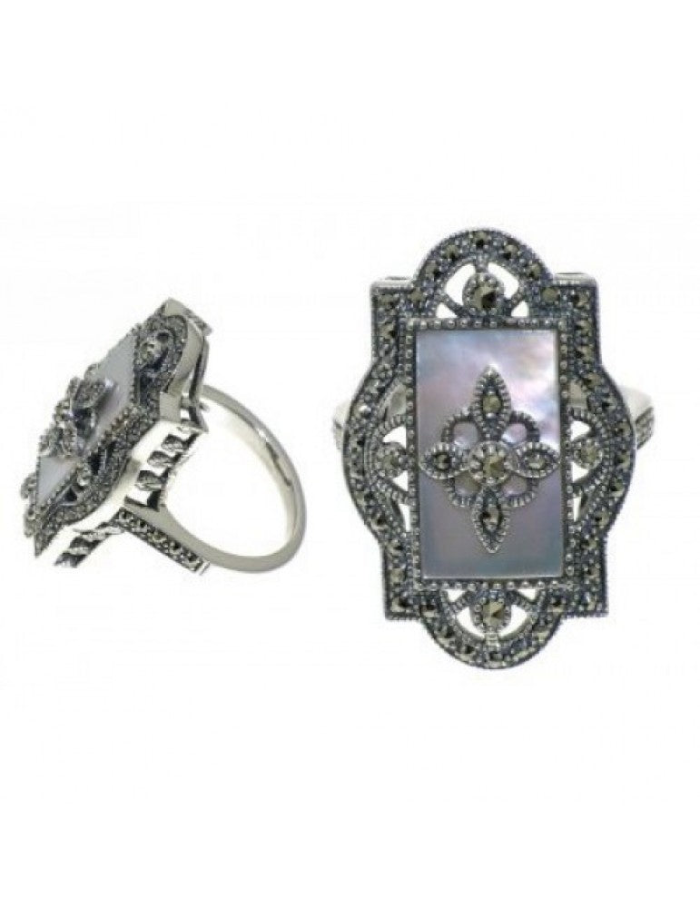 Sterling silver Art Deco Style ring. Hand set marcasite. Features mother of pearl in centre. Top measures 29mm x 19mm