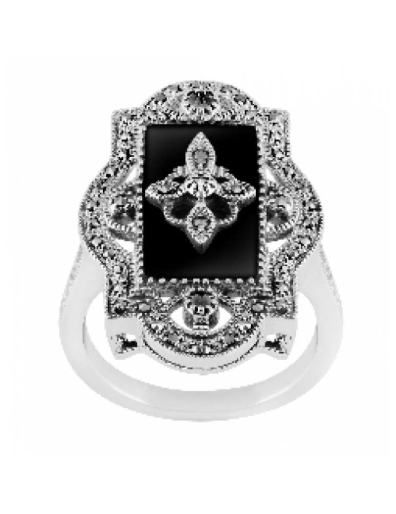 Sterling silver Art Deco Style ring. Hand set marcasite. Features onyx in centre. Top measures 29mm x 19mm