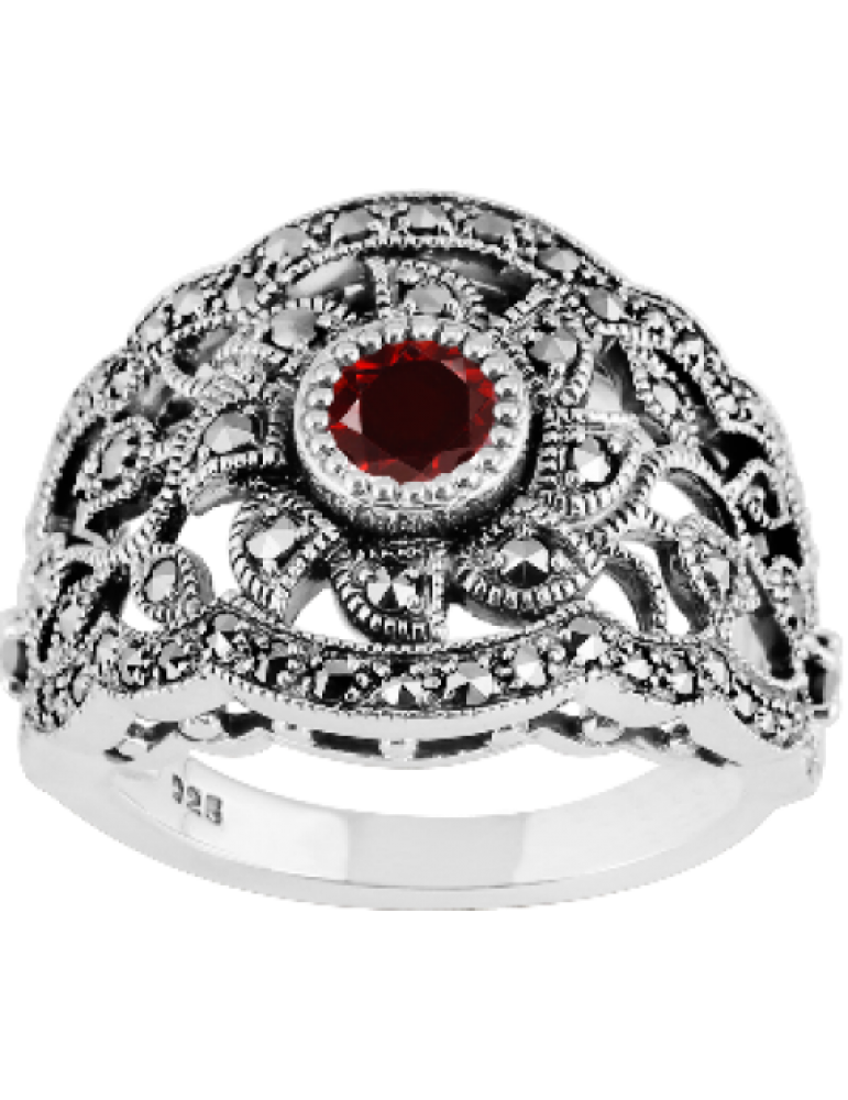Sterling silver floral style ring. Hand set with marcasite. Features 5mm faceted garnet in centre natural seed pearl accents. Top measures 17mm wide