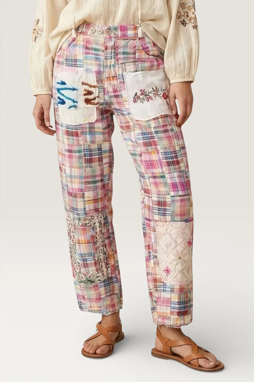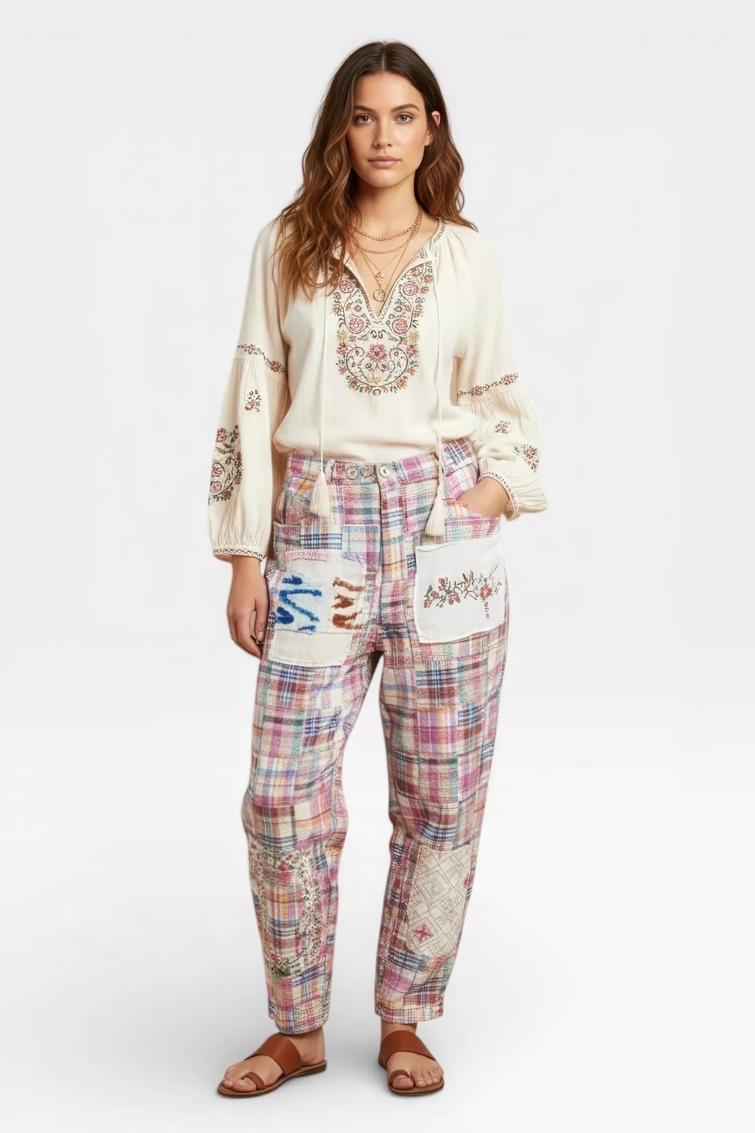 - Front loop button closures and tie closure at neckline