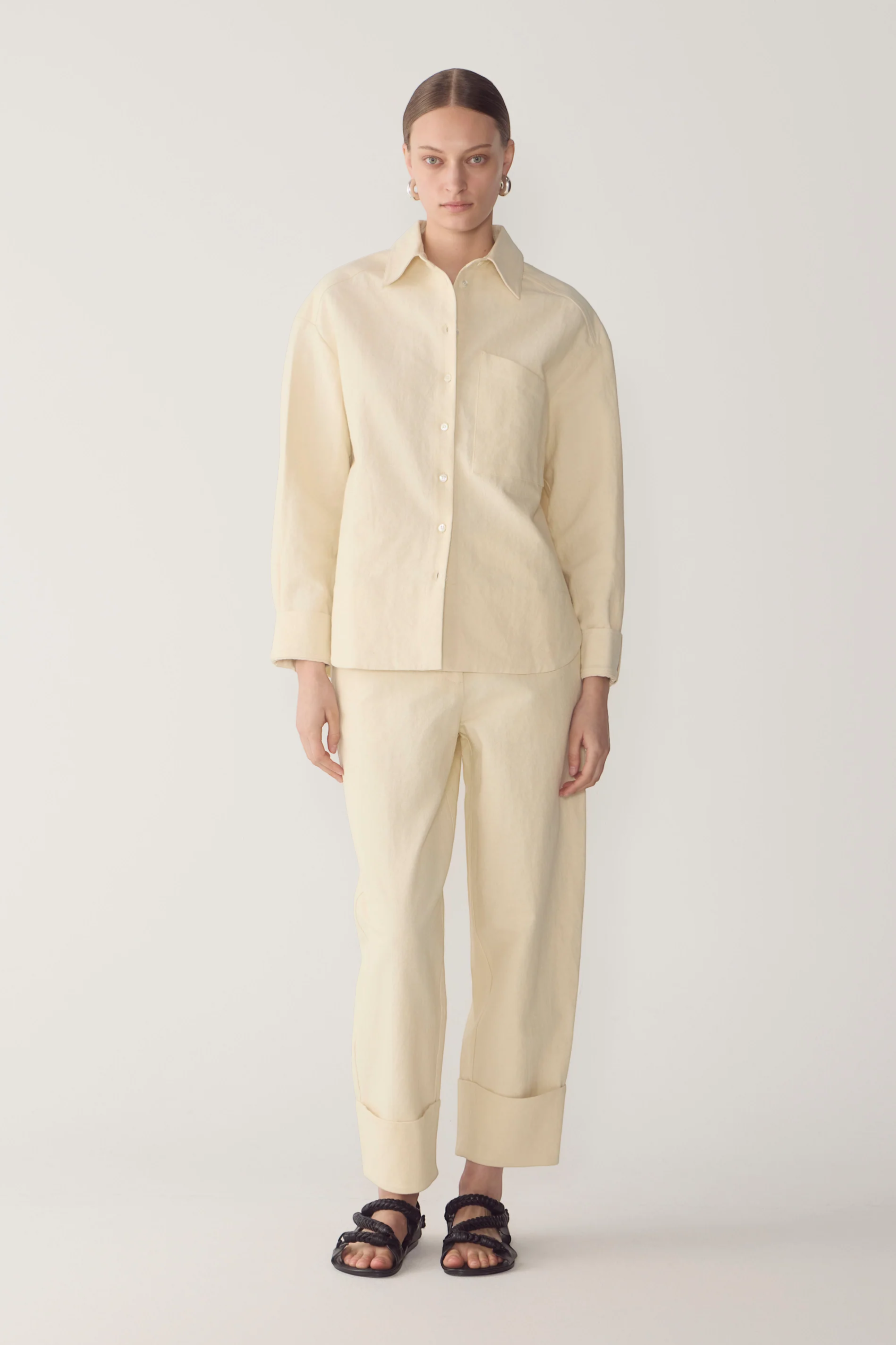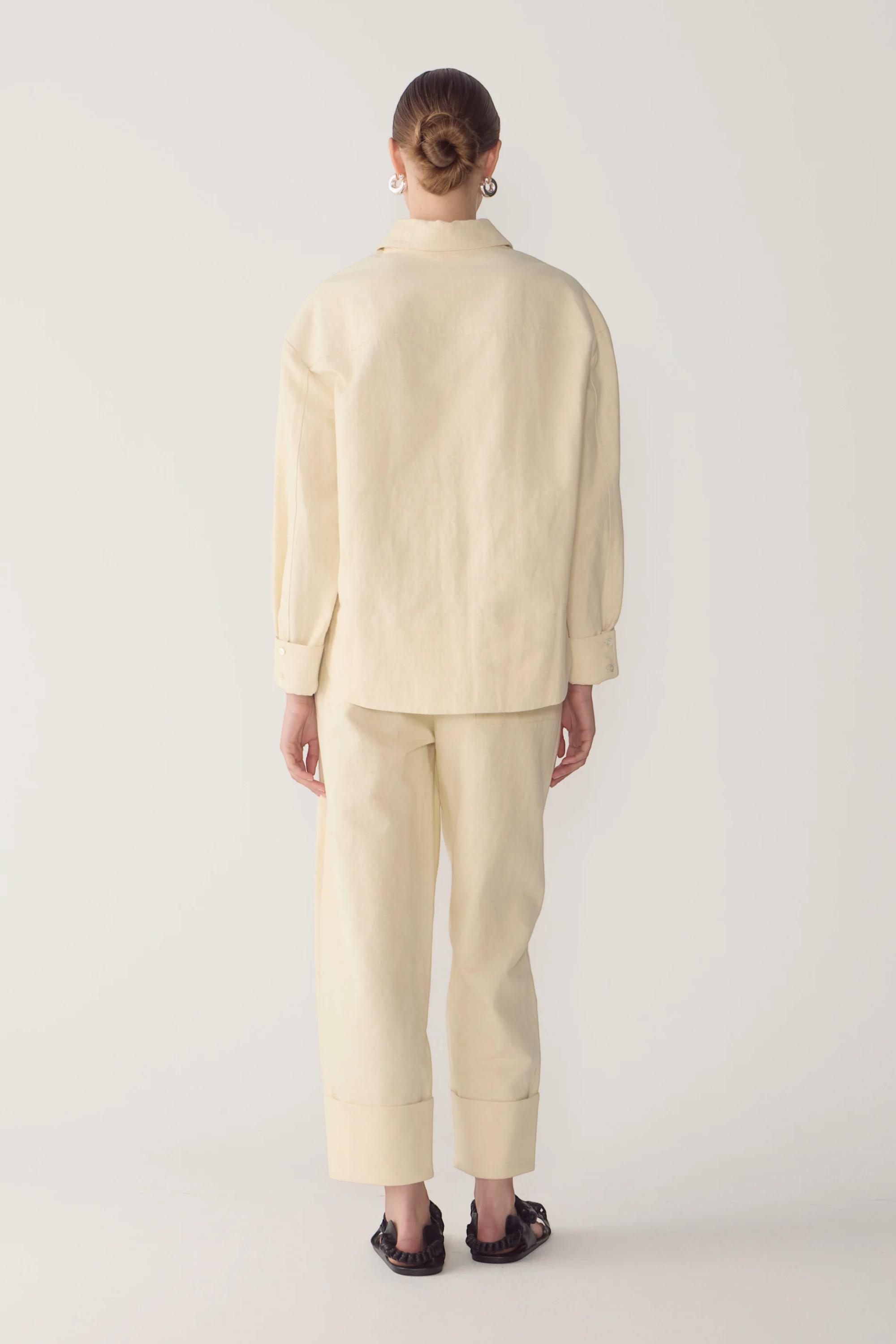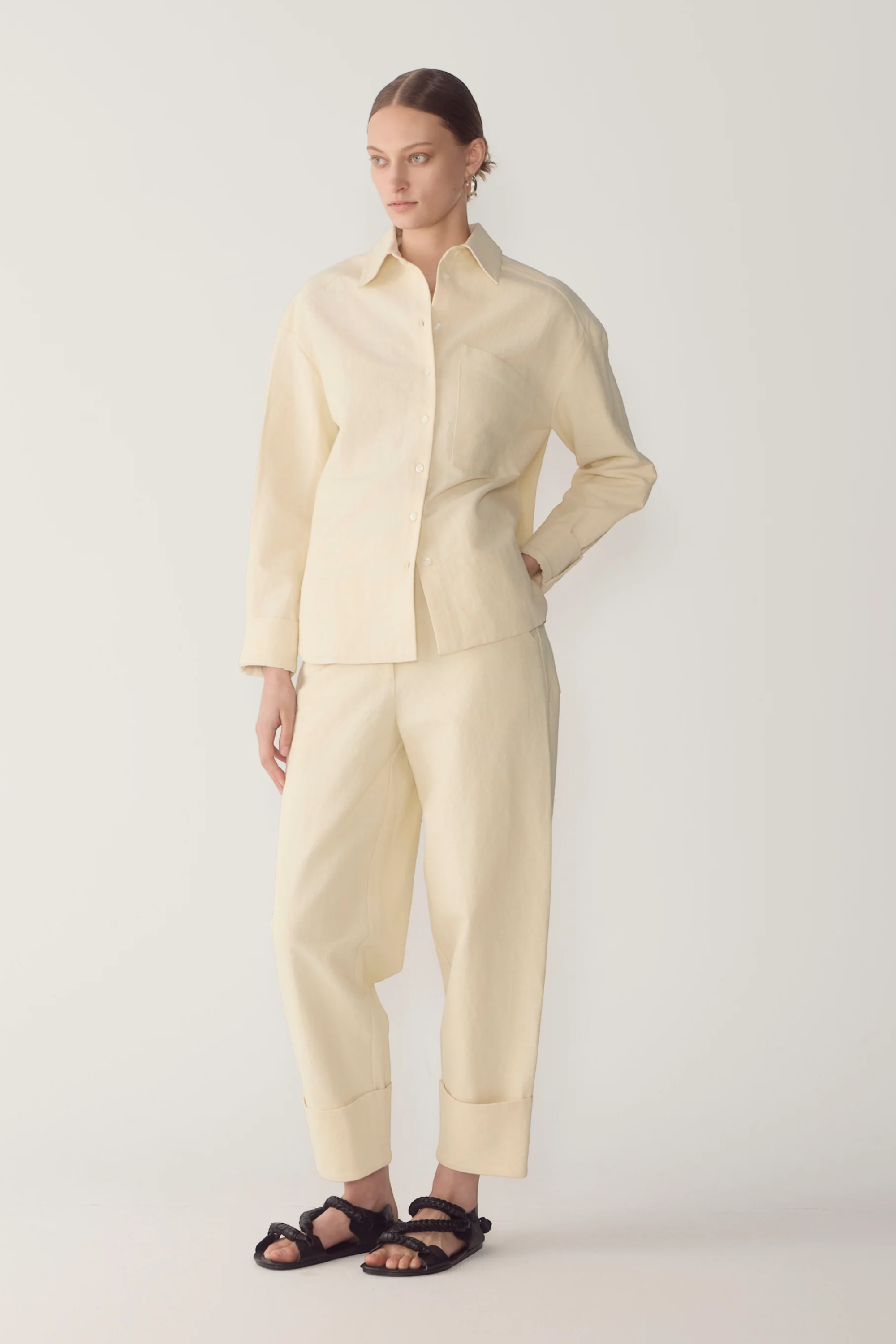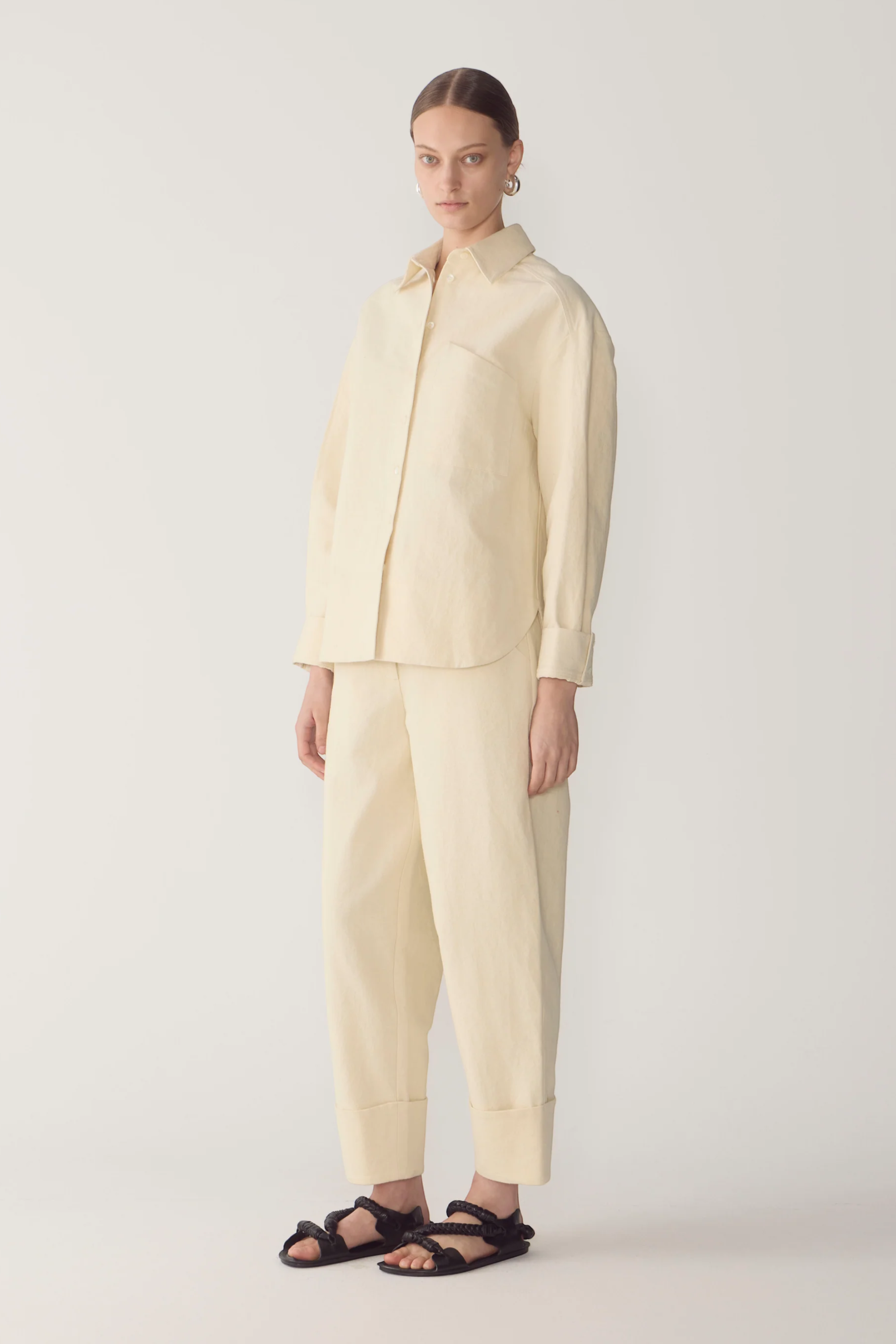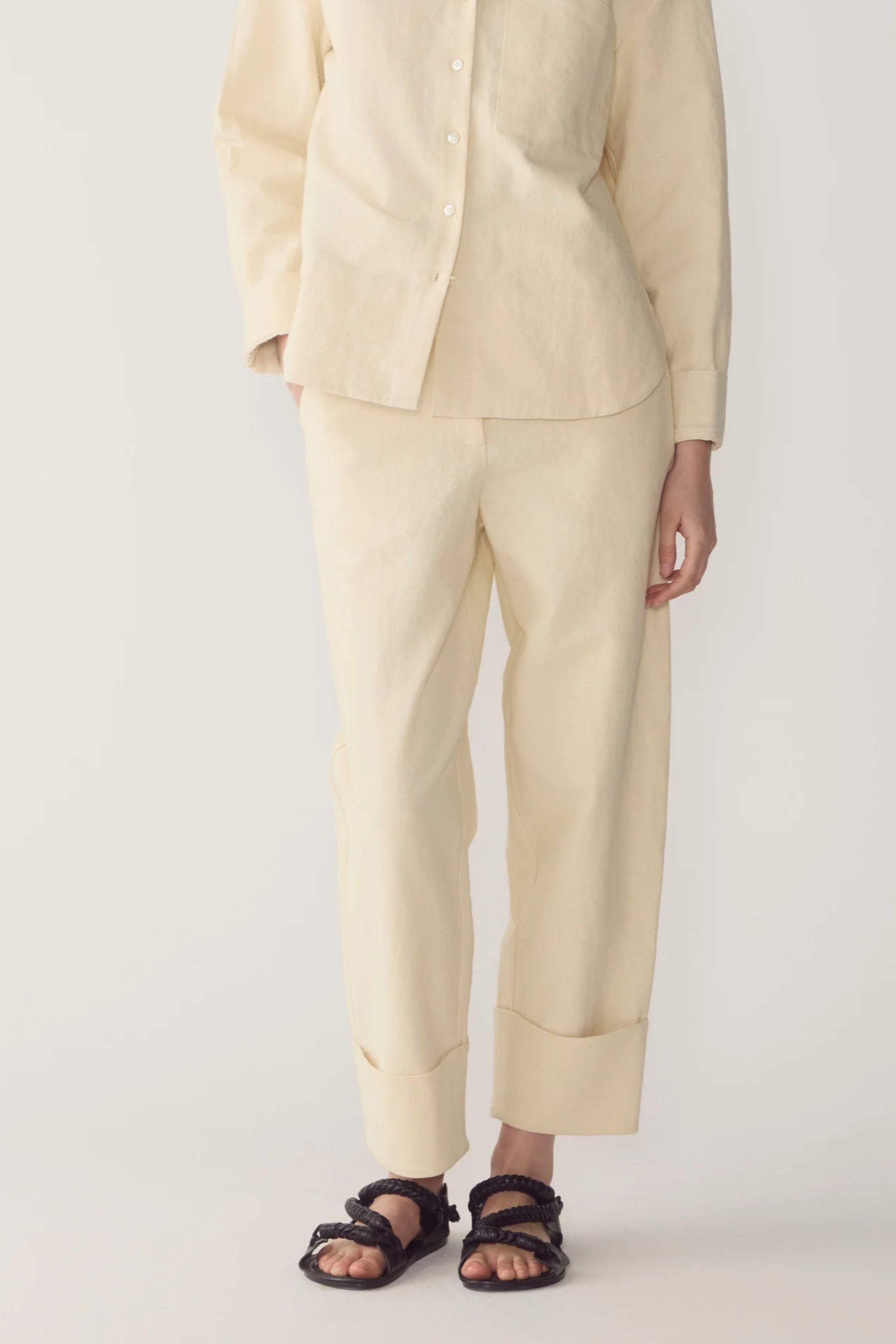These pants balance relaxed structure with clean tailoring. Designed with a button and fly front, they fall into a soft barrel leg that gently tapers to a wide turned cuff. Angled back pockets add a subtle utilitarian note, grounding the silhouette in everyday functionality. Crafted in a breathable cotton linen blend for a light, natural finish.