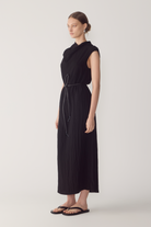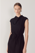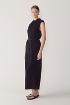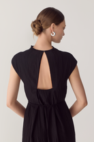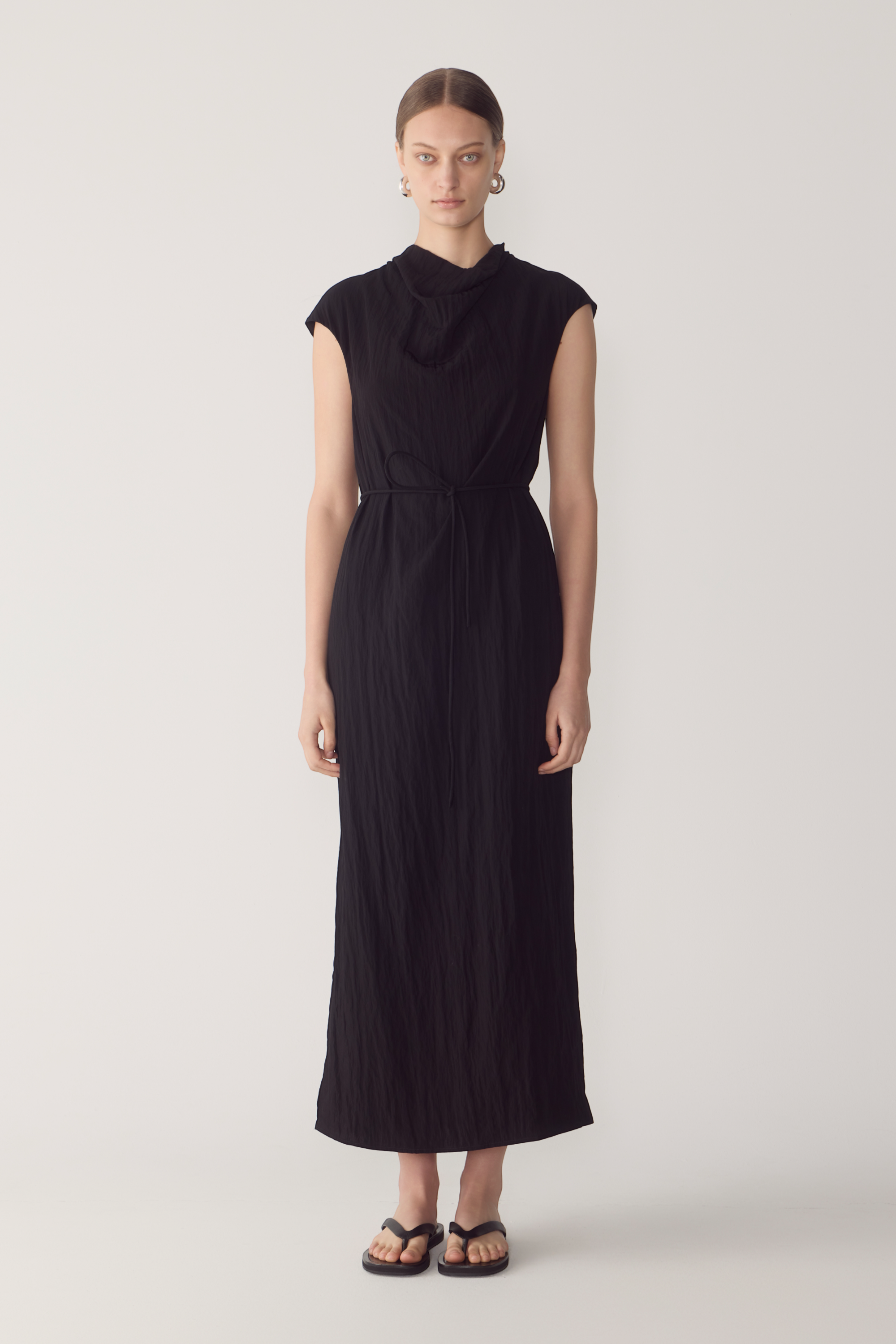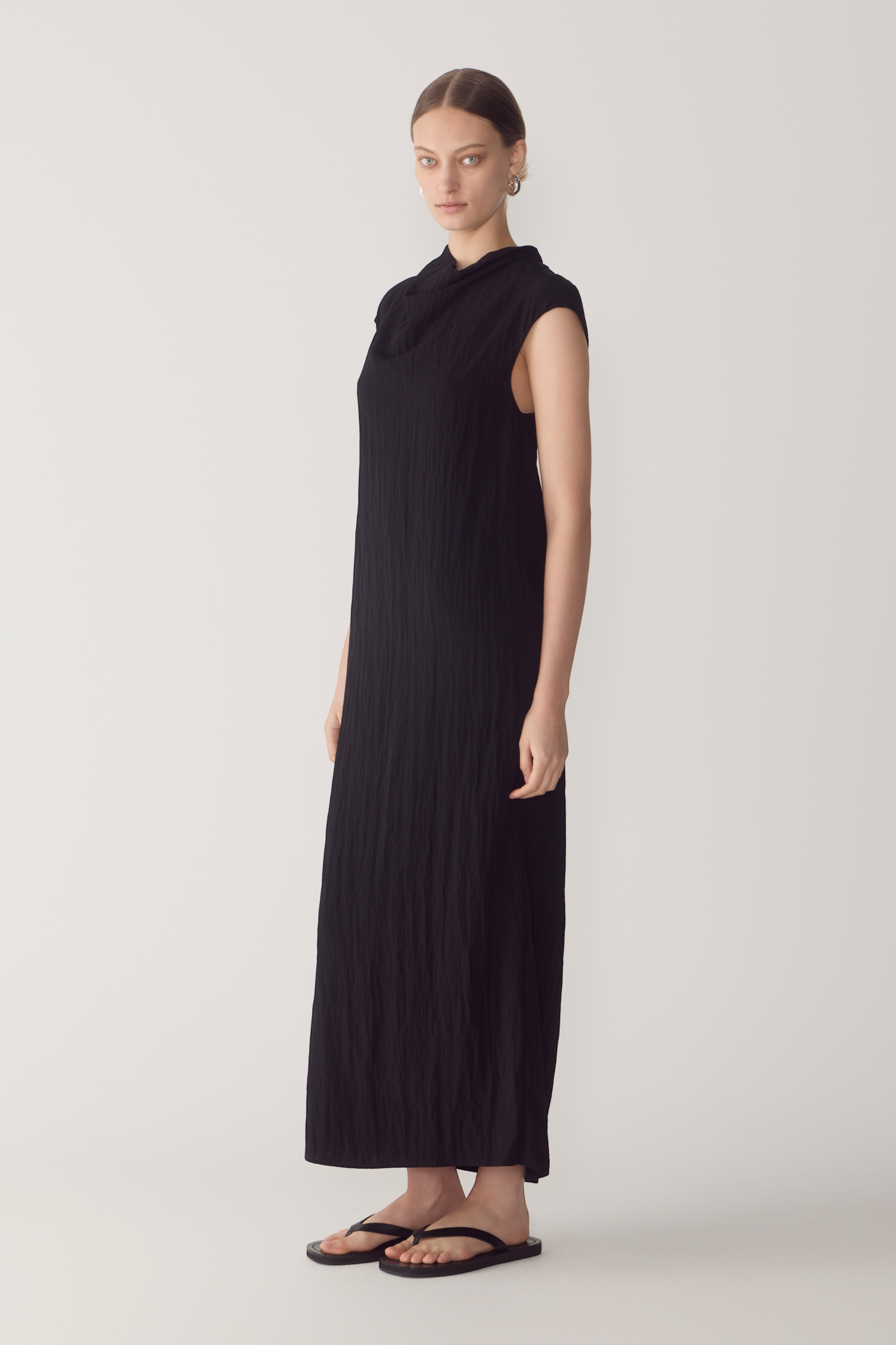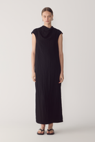 This dress redefines the classic silhouette through fluid drape and refined architectural detail. Crafted from softly textured viscose, it features a sculptural cowl neckline that gently falls, balancing structure with movement. The sleeveless cut and open back, finished with a delicate button closure, create a sense of lightness while maintaining a clean, modern line. A considered design made to endure beyond the season.