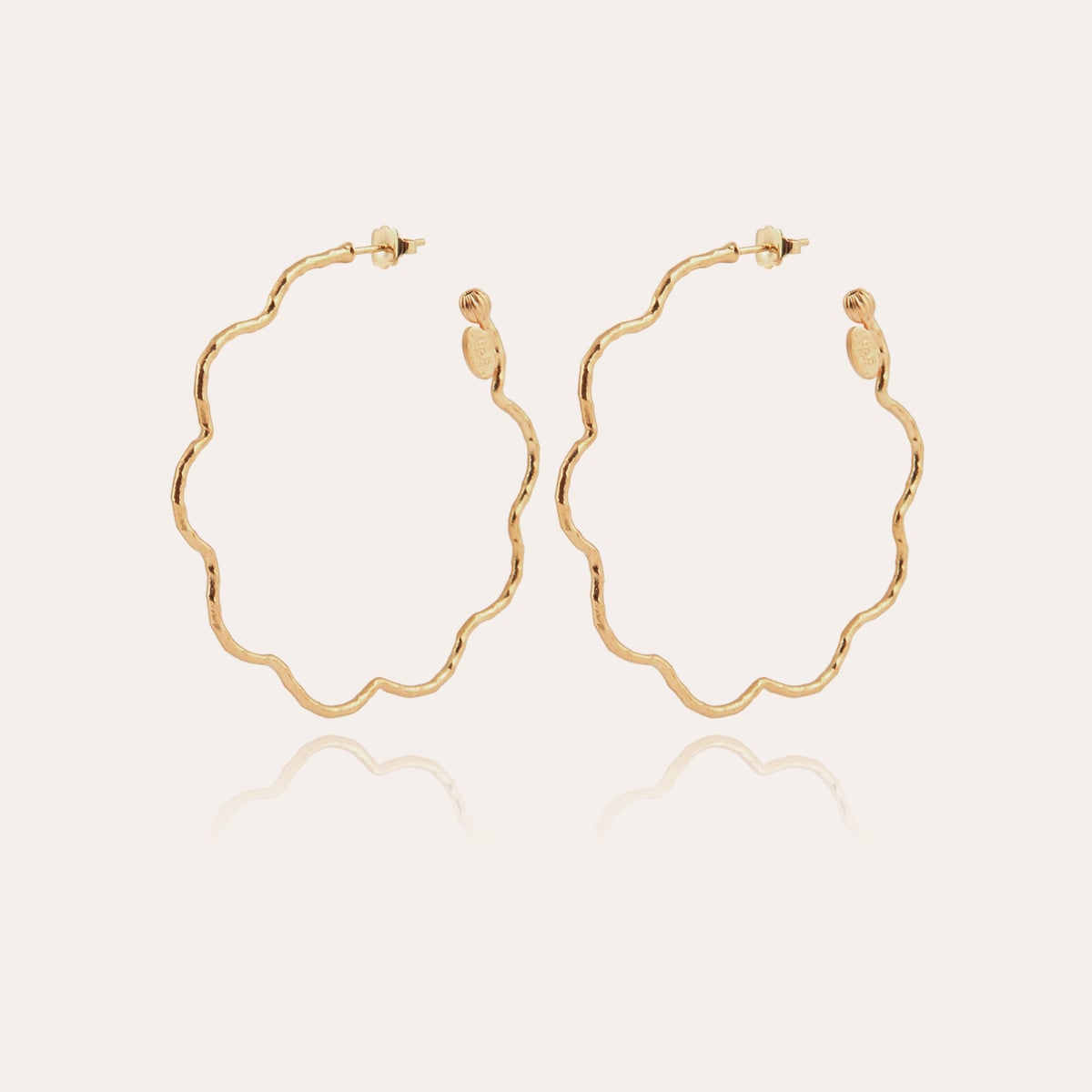 Delicate creoles gilded in gold-plated, sublimated by hand-crafted striations and hammering. Their refined design captures the light with elegance, adding a sophisticated touch to every outfit. Lightweight and timeless, they embody the excellence of Gas Bijoux savoir-faire for a chic, sublimated look on any occasion.