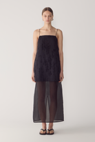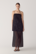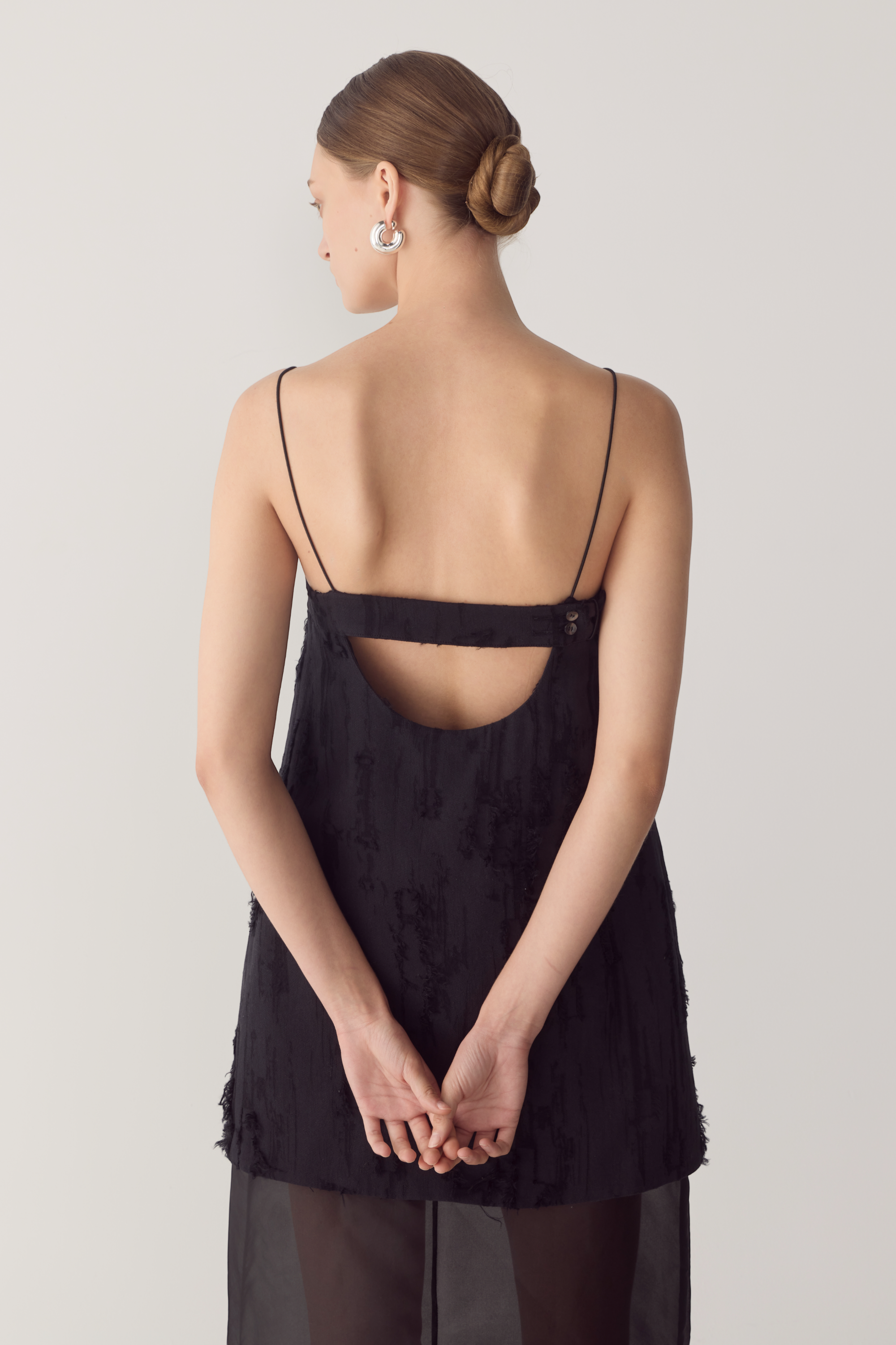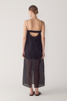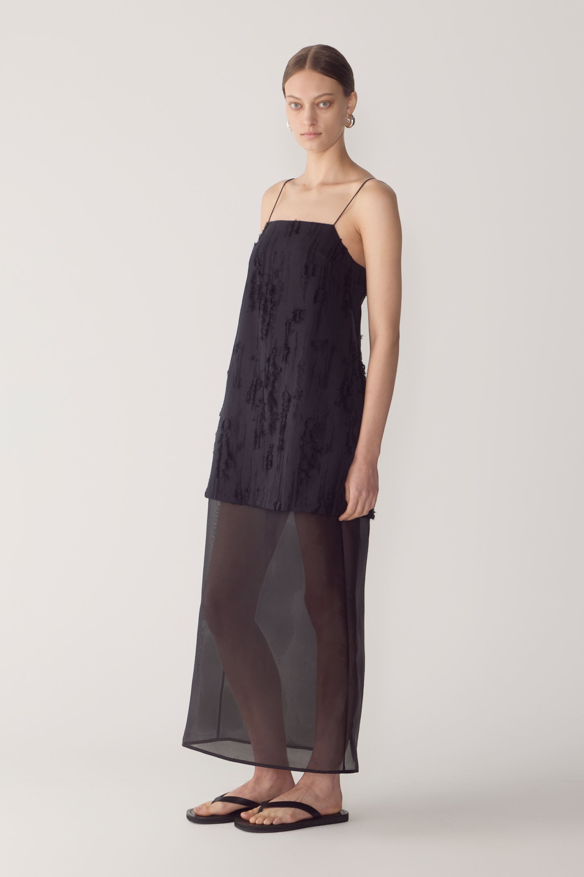 This dress reinterprets a minimalist silhouette through layered texture and refined contrast. Crafted from frayed jacquard, it features a mini overlay set atop a sheer silk organza underlayer, finished with a back split to create fluid movement through the hem. Fine elastic straps frame the shoulders, while an adjustable back with a subtle cut-out detail adds architectural interest to the design. A considered piece that balances delicacy with structure.