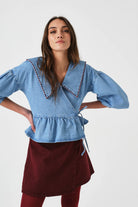 The sweetest frill wrap top with an oversized embroidered collar.