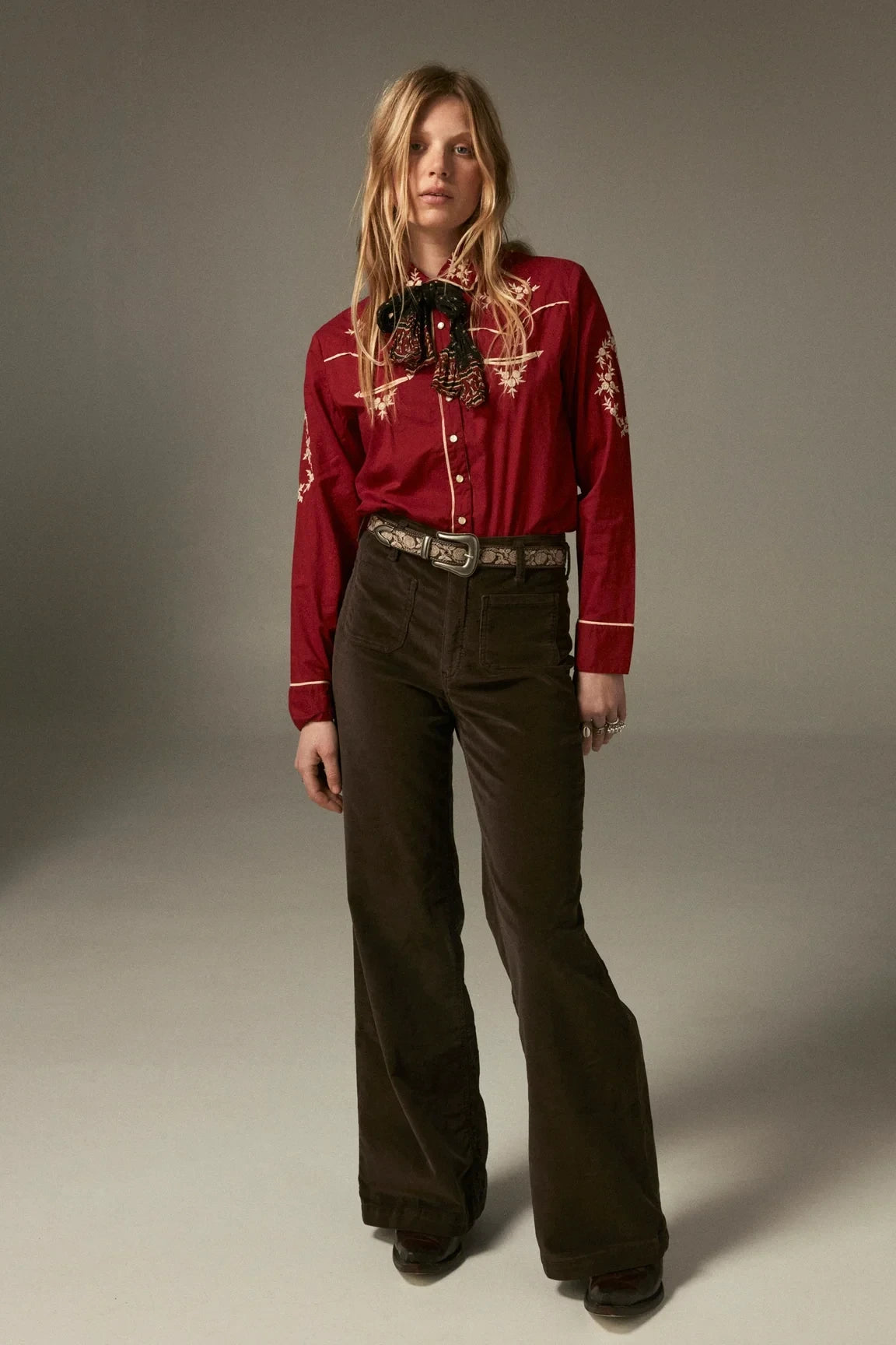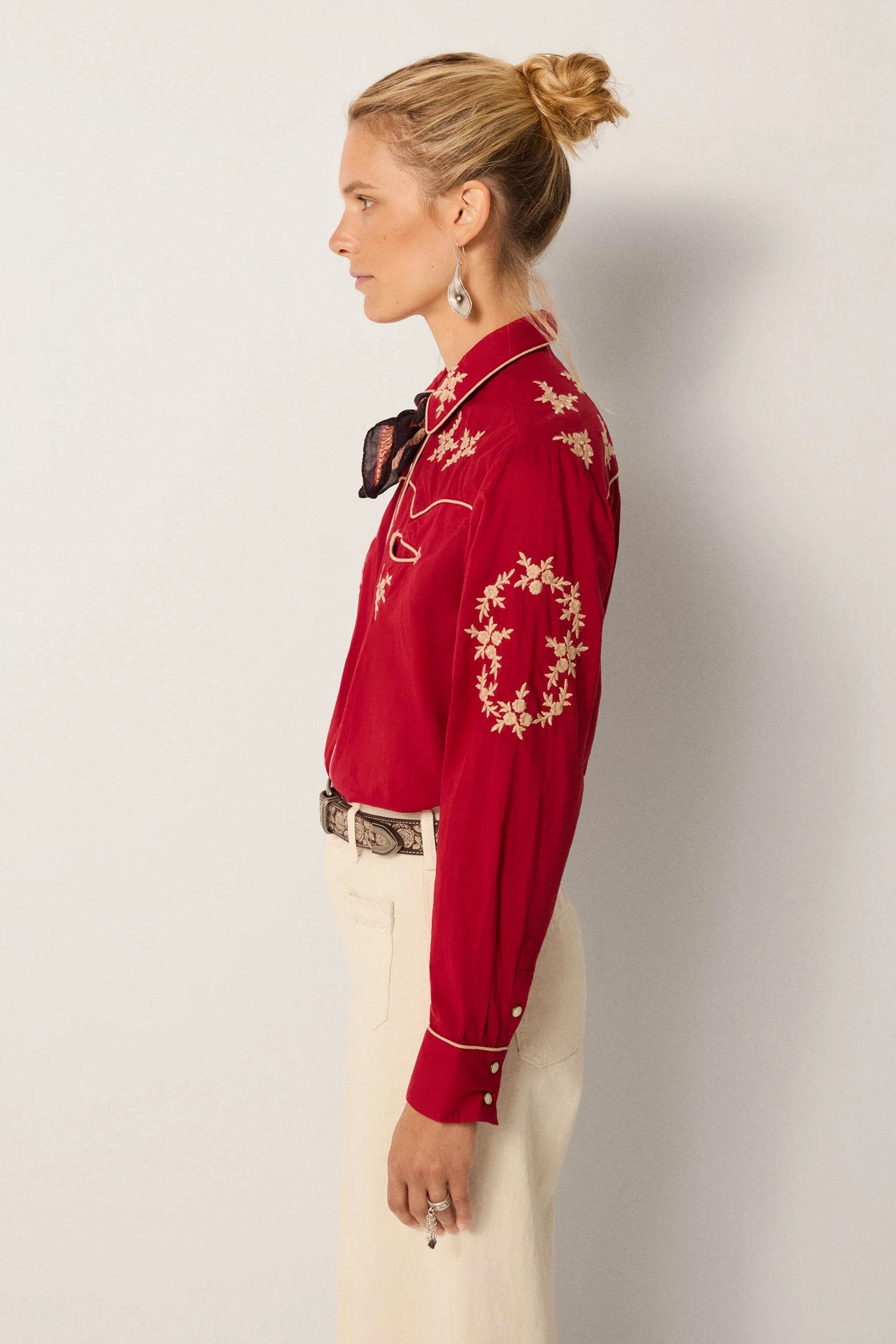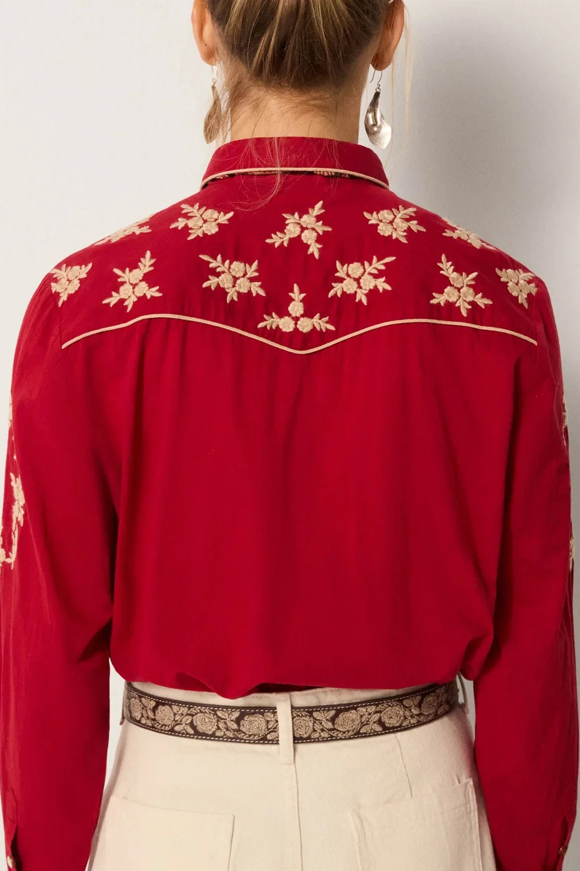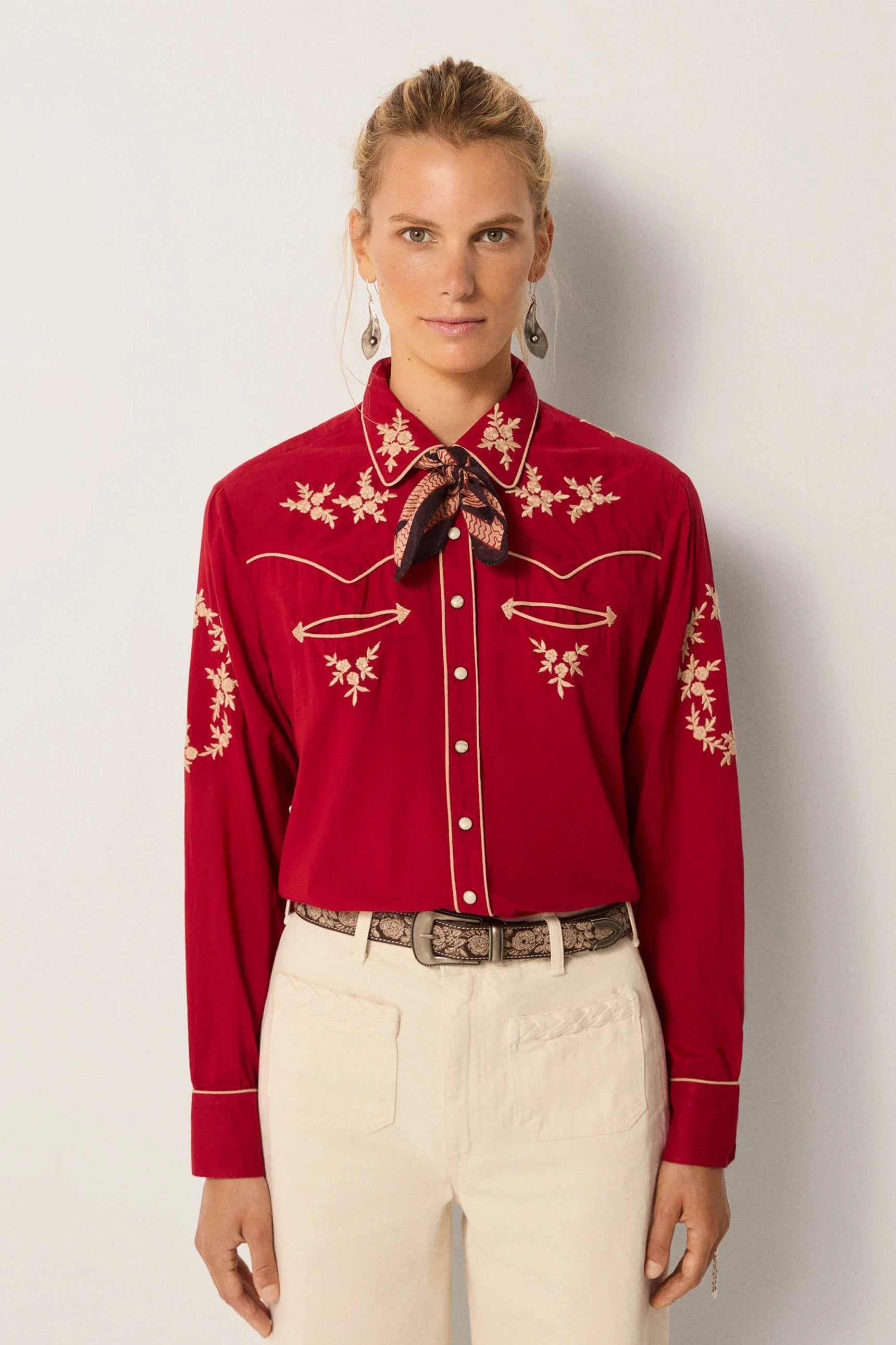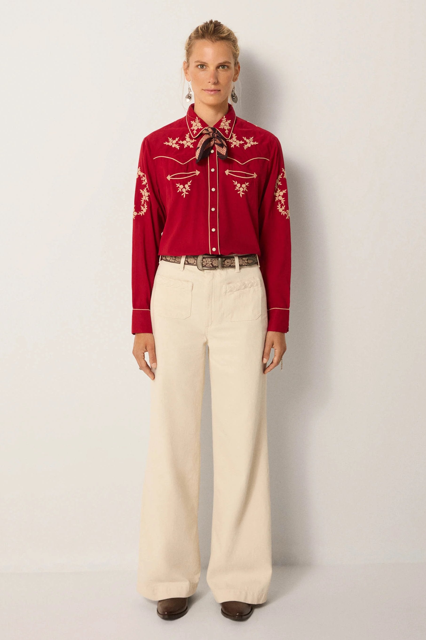 Styled here with Hamlet Ecru pant, Guadalupe Coffee belt and Bobby Tobacco boots — the pairing sharpens its Western spirit into a modern look. For everyday wear, it can be layered open over denim and a Dolcevita knit, keeping the embroidery as the standout detail.