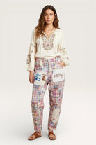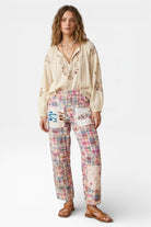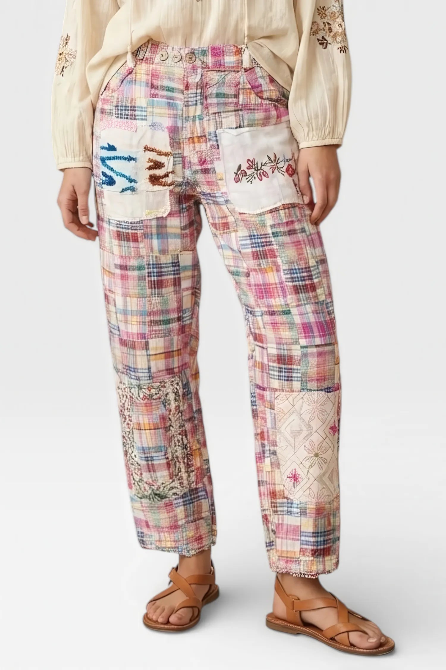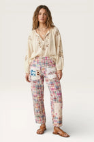 - Lightweight pants with raw edge seams and vintage inspired patchwork
