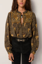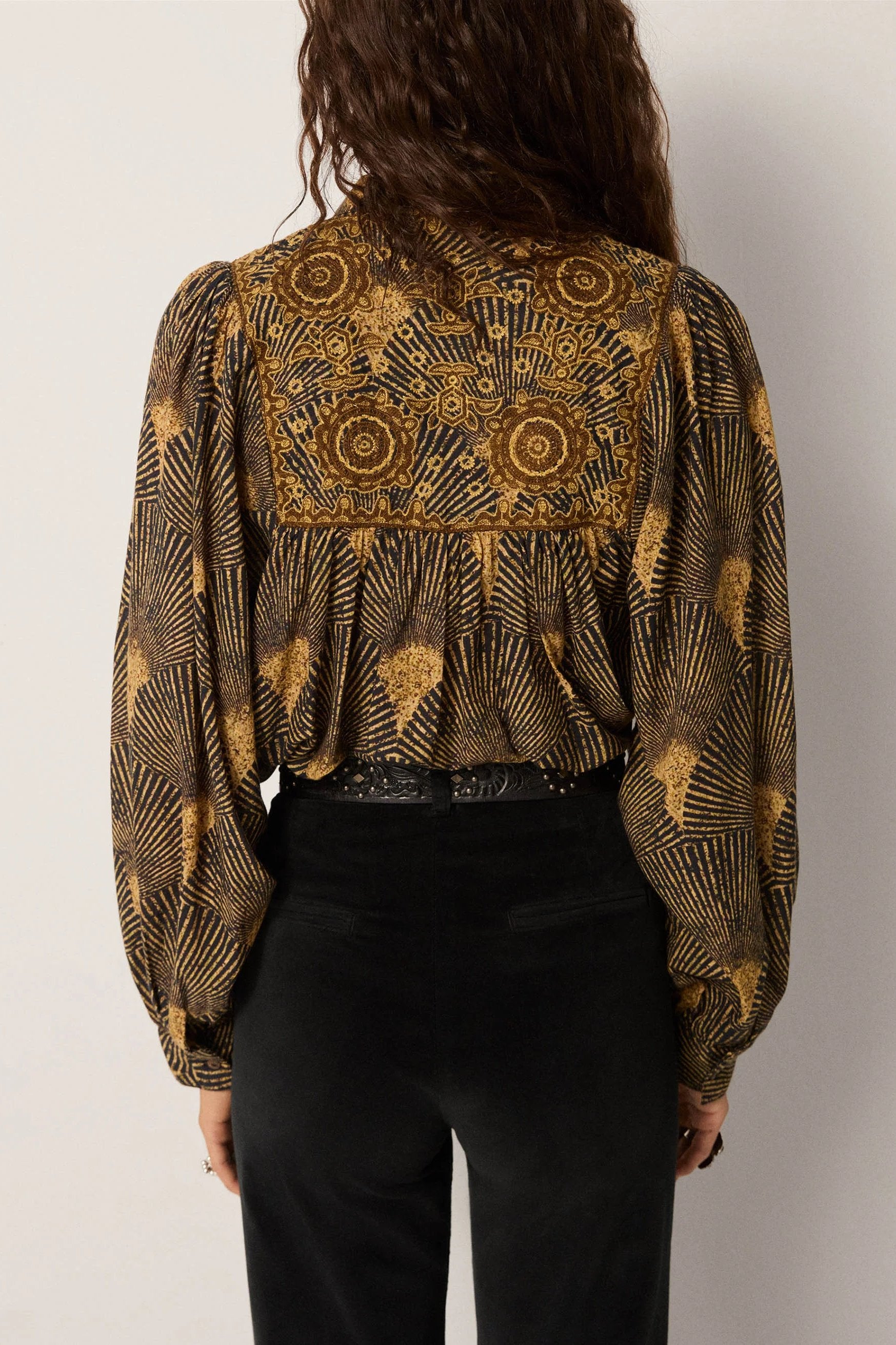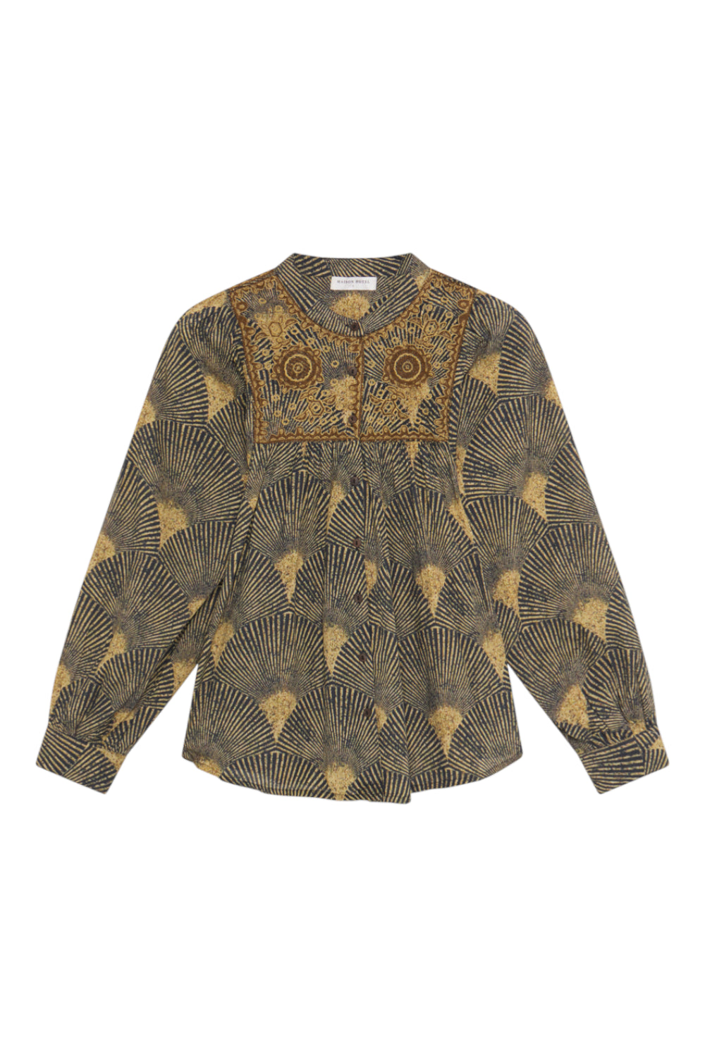 The blouse is designed with a full embroidery panel across the front, complemented by buttoned cuffs and a gently rounded collar. These crafted details add structure to an otherwise easy silhouette.