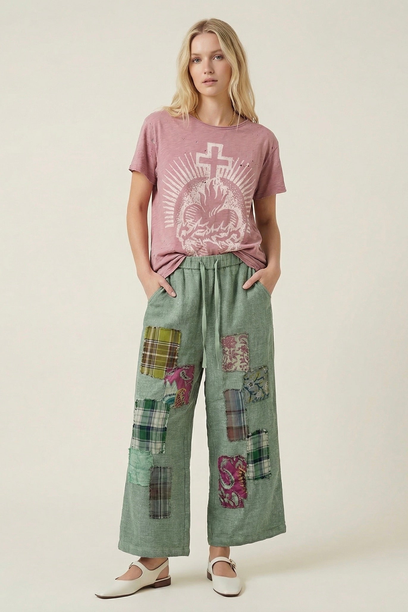 Elevate your wardrobe with these distinctive boho pants from the celebrated Jaded Gypsy collection. Crafted from breathable woven fabric, they showcase thoughtfully placed distressing paired with vintage botanical and check patterns that capture effortless bohemian elegance. The relaxed pull-on silhouette adapts beautifully to various body types, making them equally suited to layering during cooler months or standalone wear throughout the year. Each pair presents its own unique character, ensuring your style remains refreshingly individual.