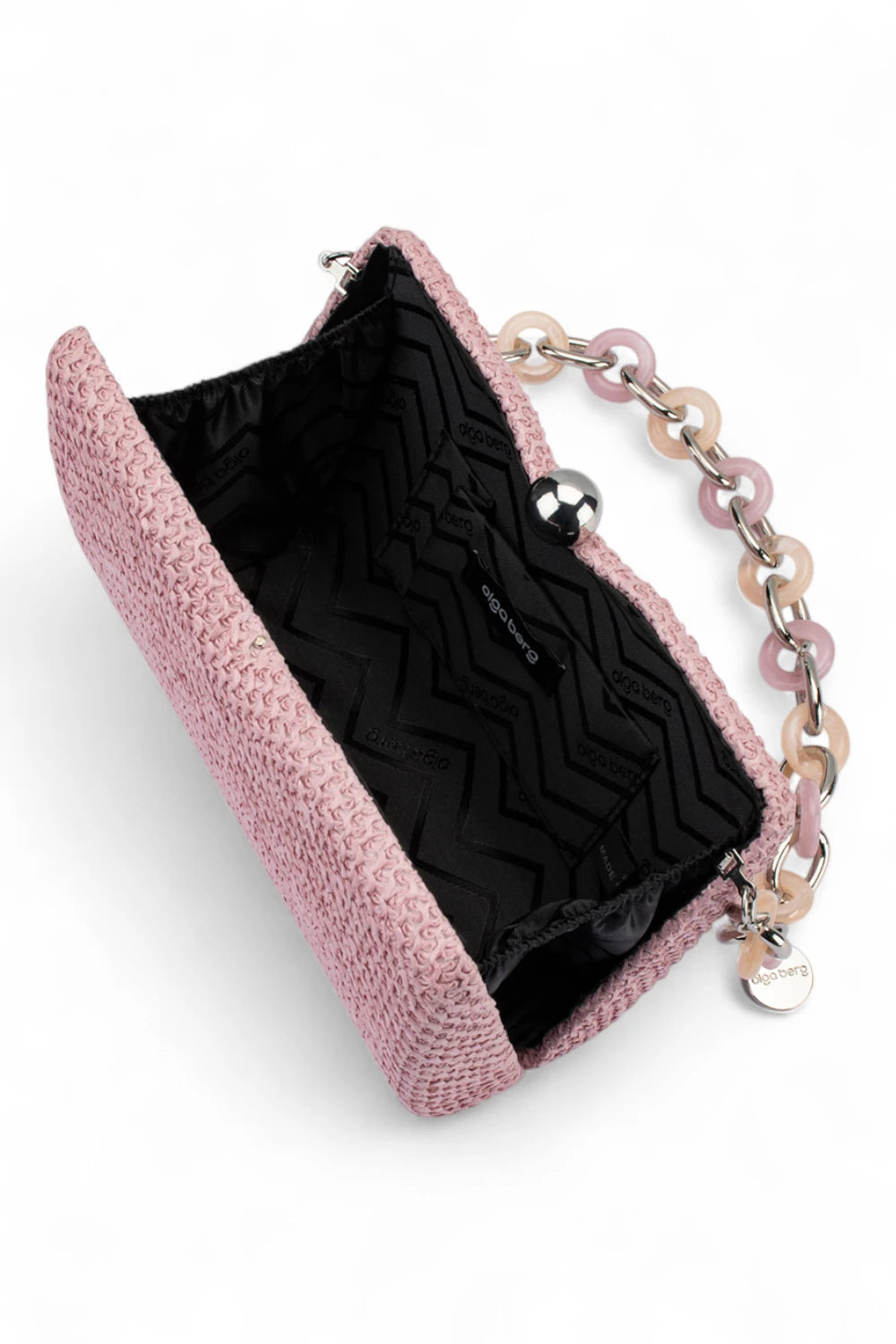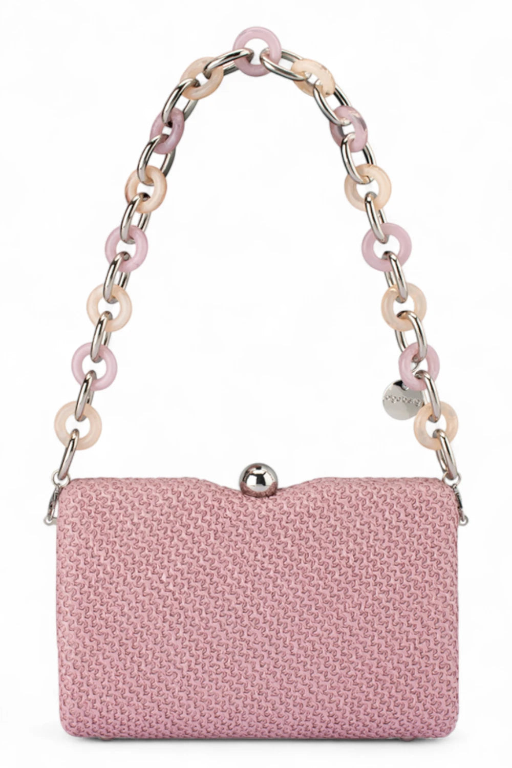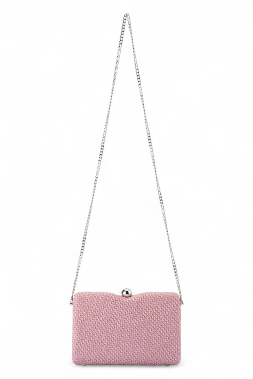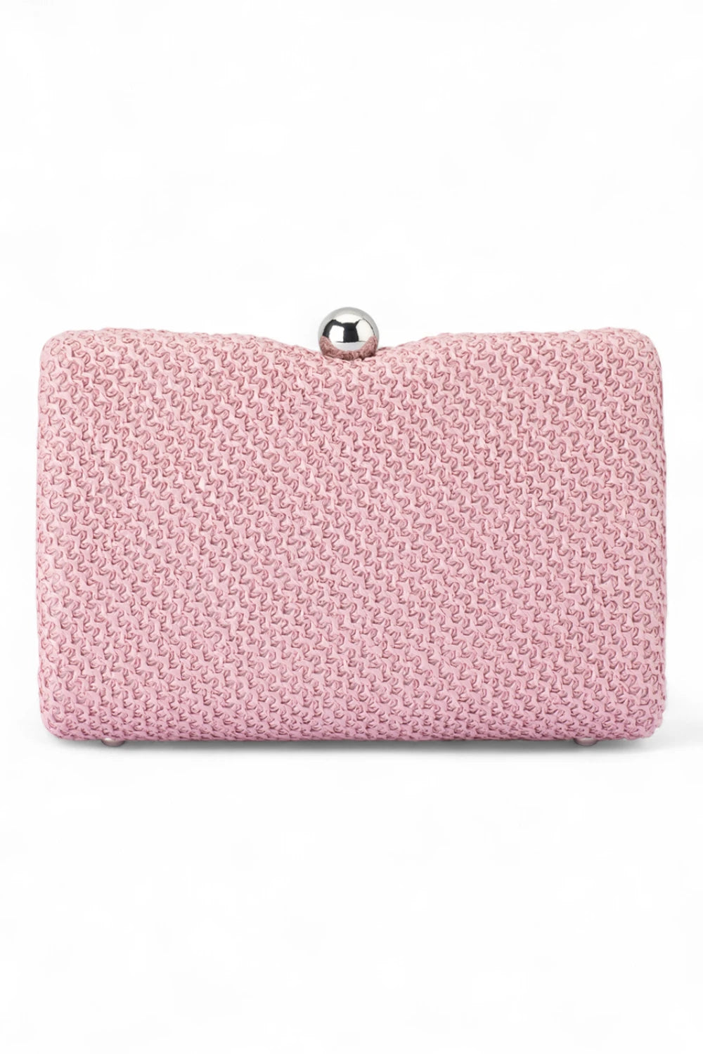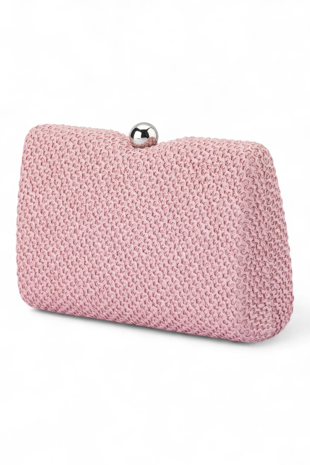 The versatile BIRDIE Textural Handle bag includes a detachable feature acrylic top handle and a long shoulder chain for multiple styling options. This stunning hardcase clutch features a chic woven texture and classic single ball closure to keep your items safe and secure in this roomy bag.