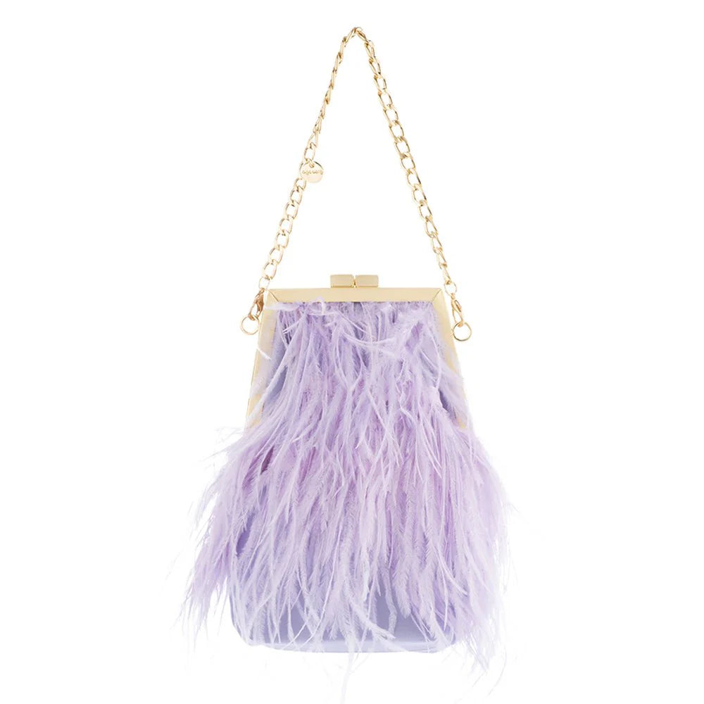 The Sara Feather Frame Bag is an elegant evening style featuring an intricate blend of feathers sewn onto a luxe matte satin base. The elongated silhouette has a modern vintage feel and boasts plenty of room for your phone, lippy, keys and a little extra.