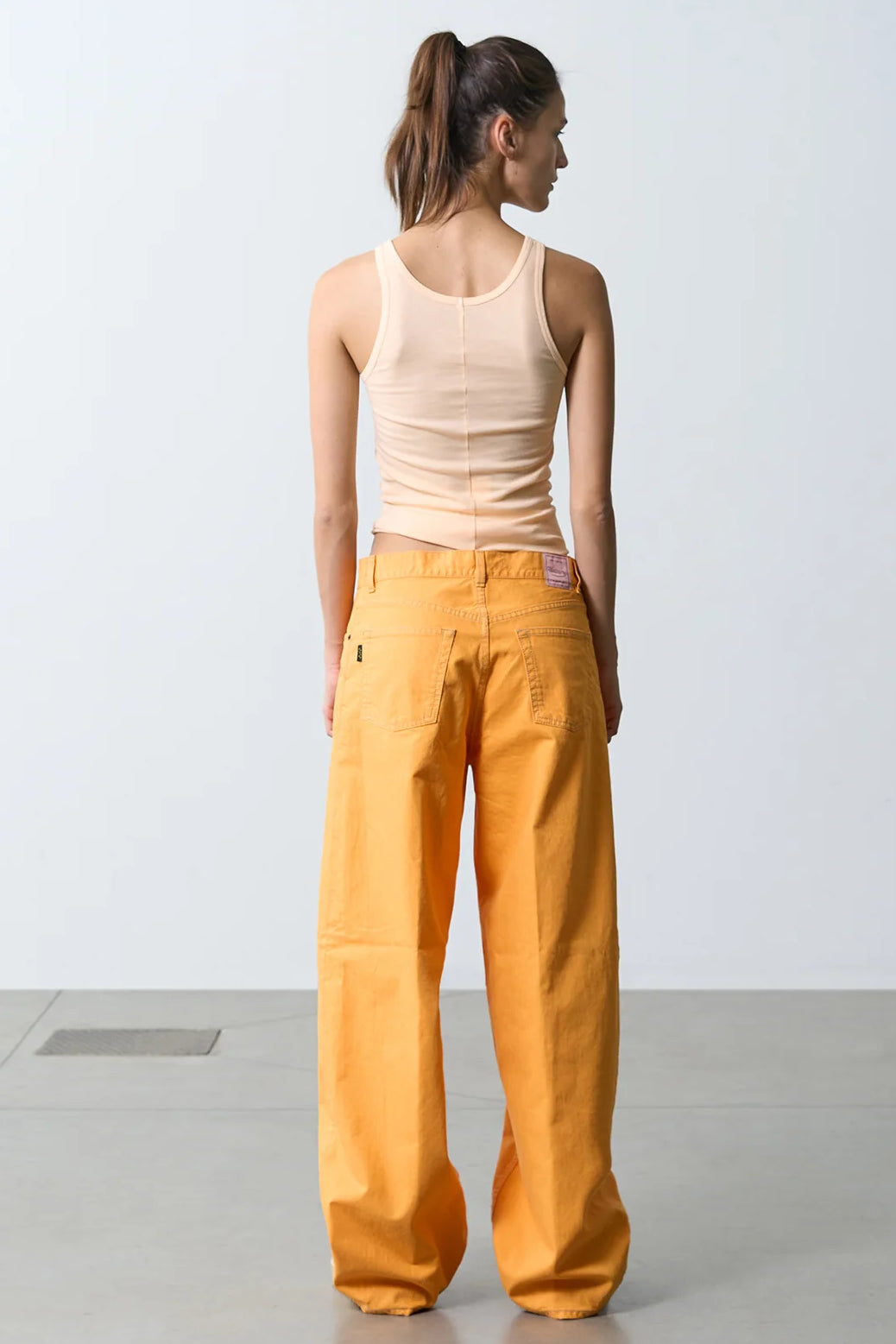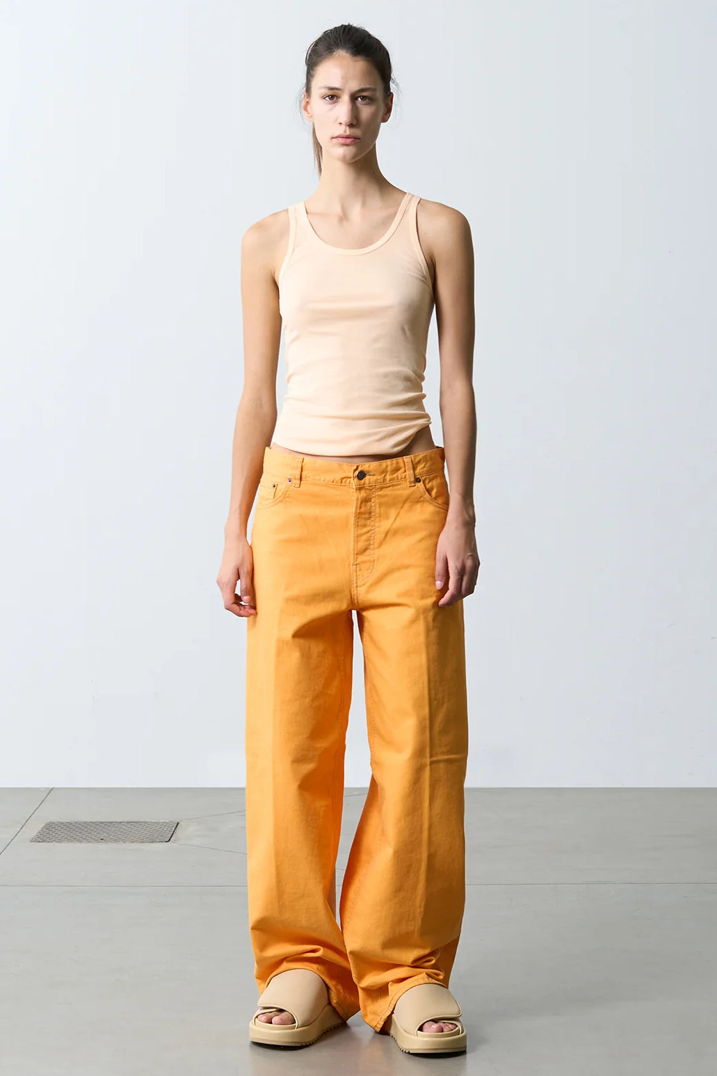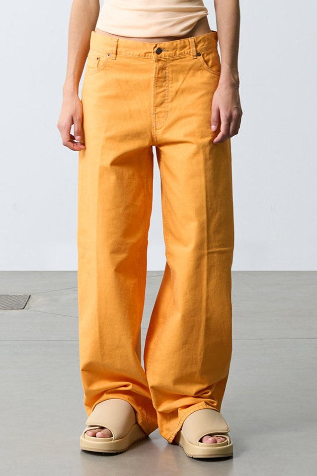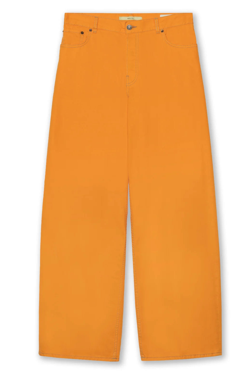 Cotton Bethany pants by Haikure, straight denim pattern, front button and concealed zipper closure, all-over contrast stitching, five-pocket pattern, leather patch with iconic brand monogram press-stamped and appliqued on contrasting back.