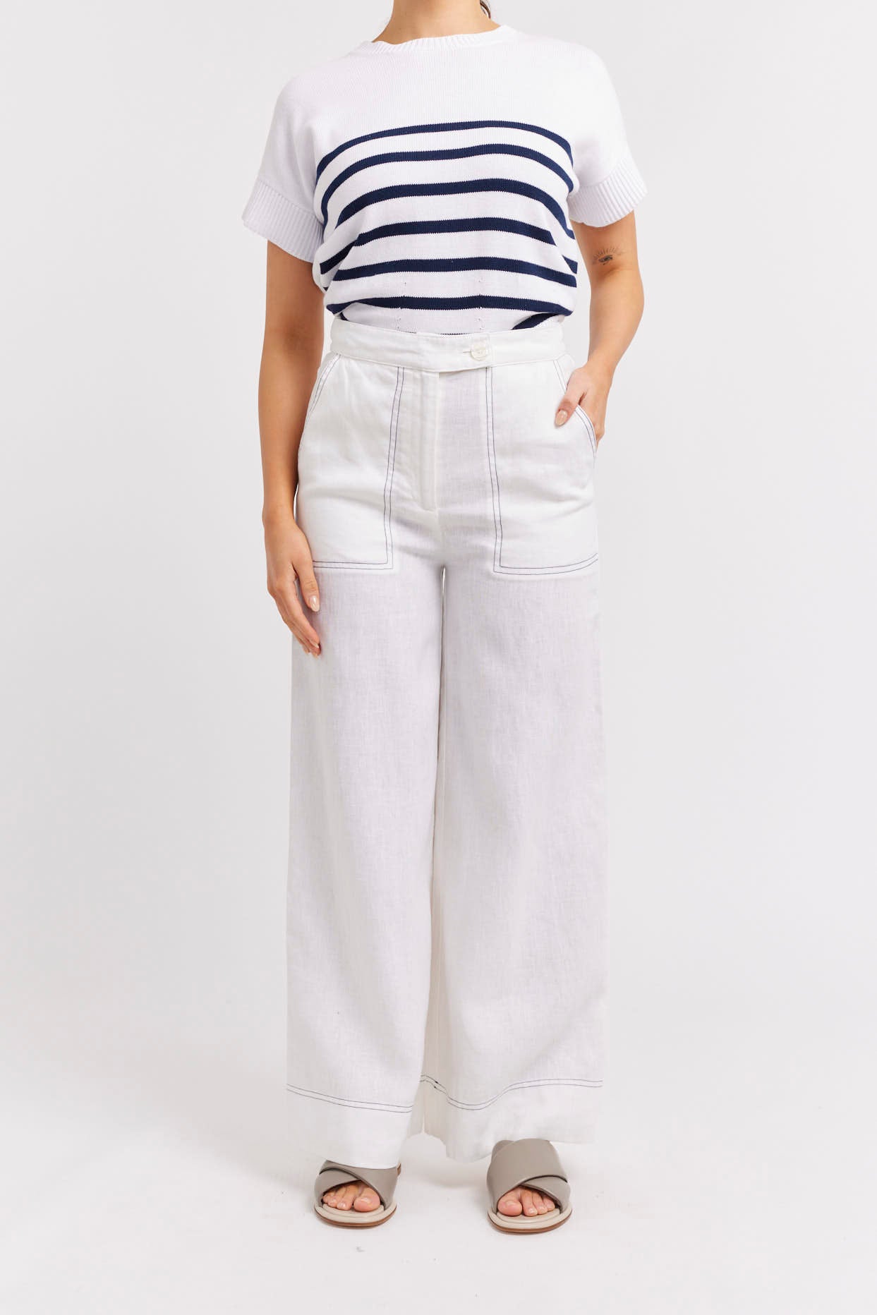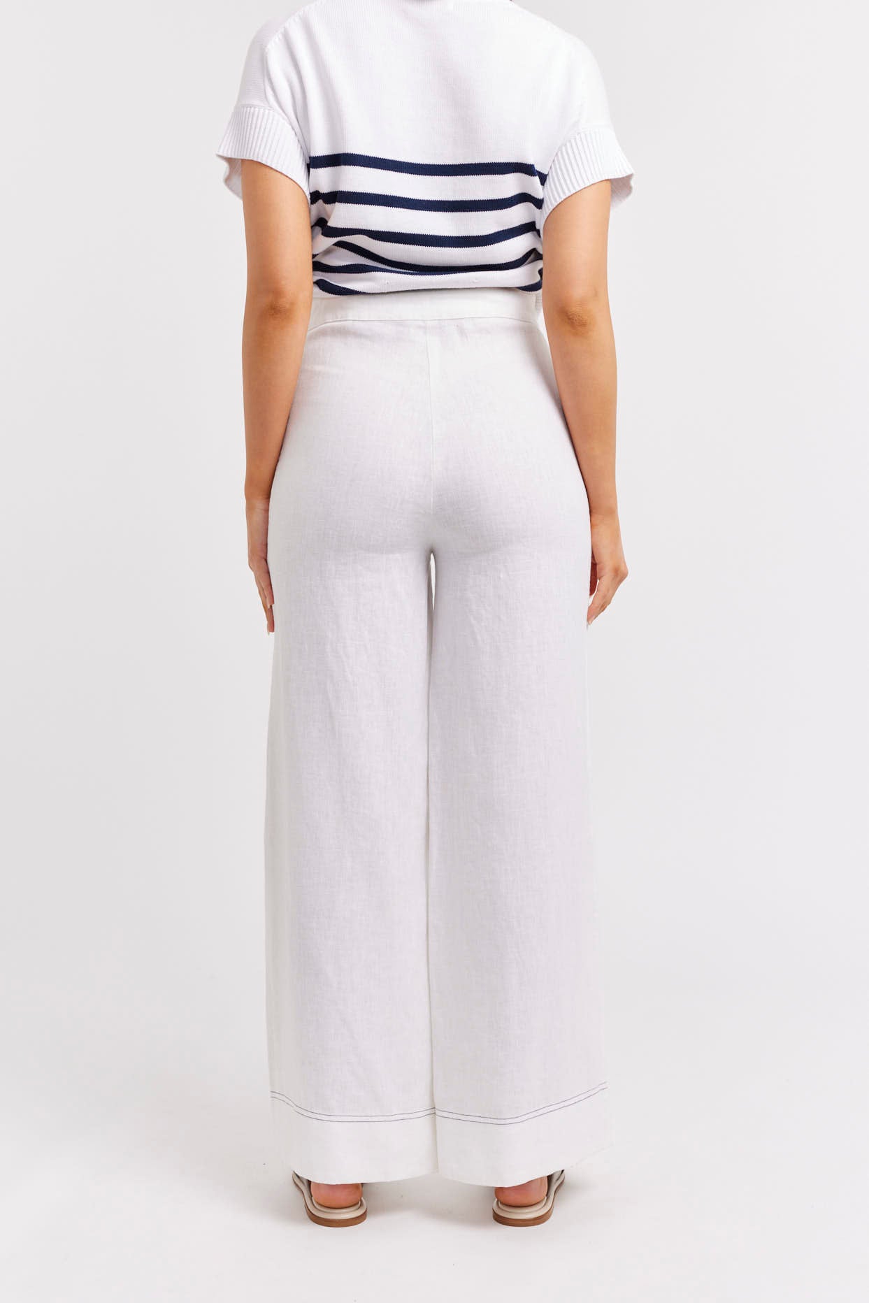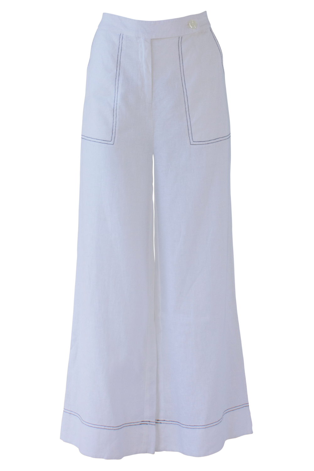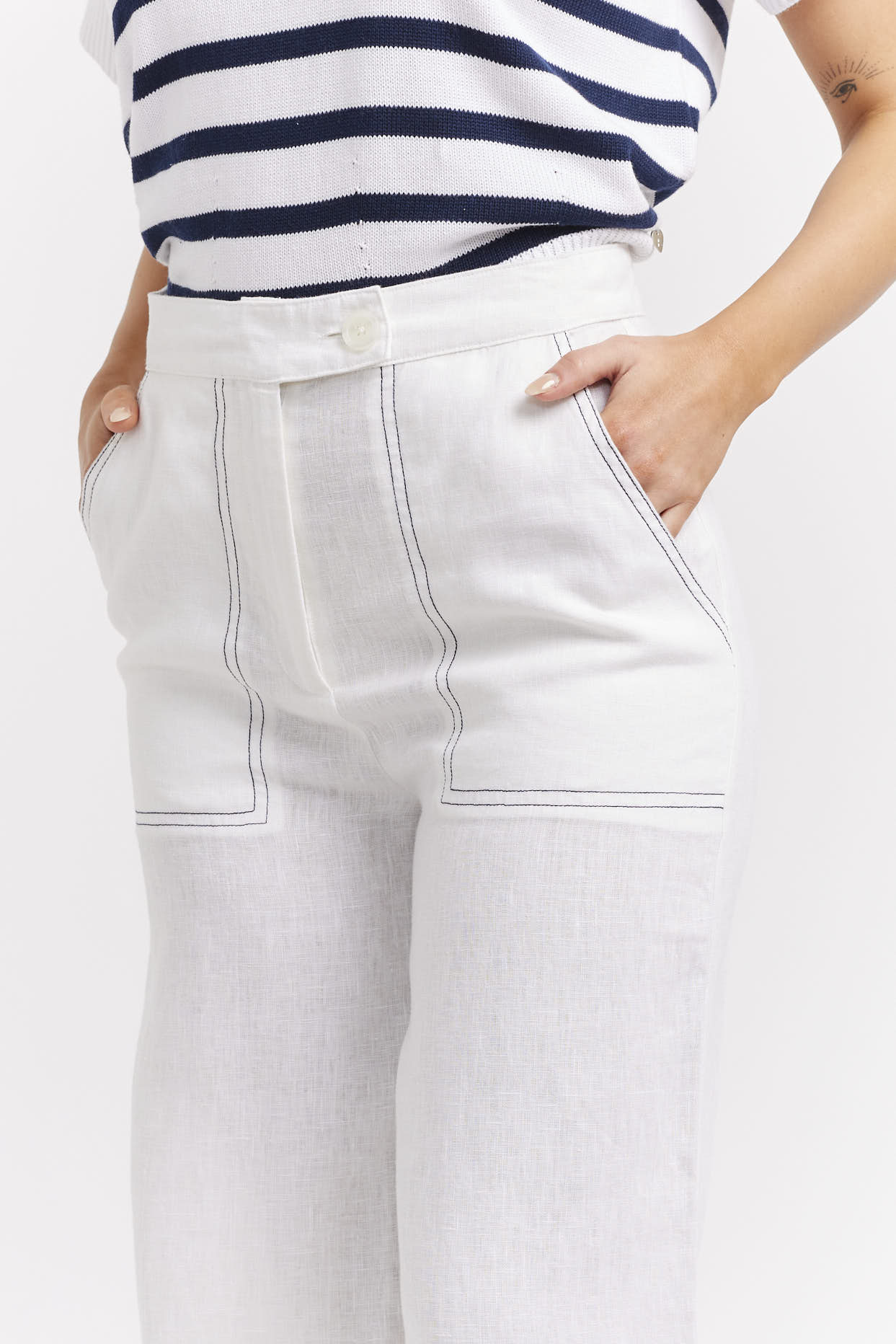 The Clio Linen Pant in White offers a sophisticated summer look that will make a lasting impression. Crafted from a luxurious linen fabric, it features structured lines, eye-catching navy-blue stitching, and an asymmetrical button opening for subtle asymmetry. With a deep hemline for an optimal fit, this pant is the perfect way to stay looking stylish and feeling fresh all summer long.