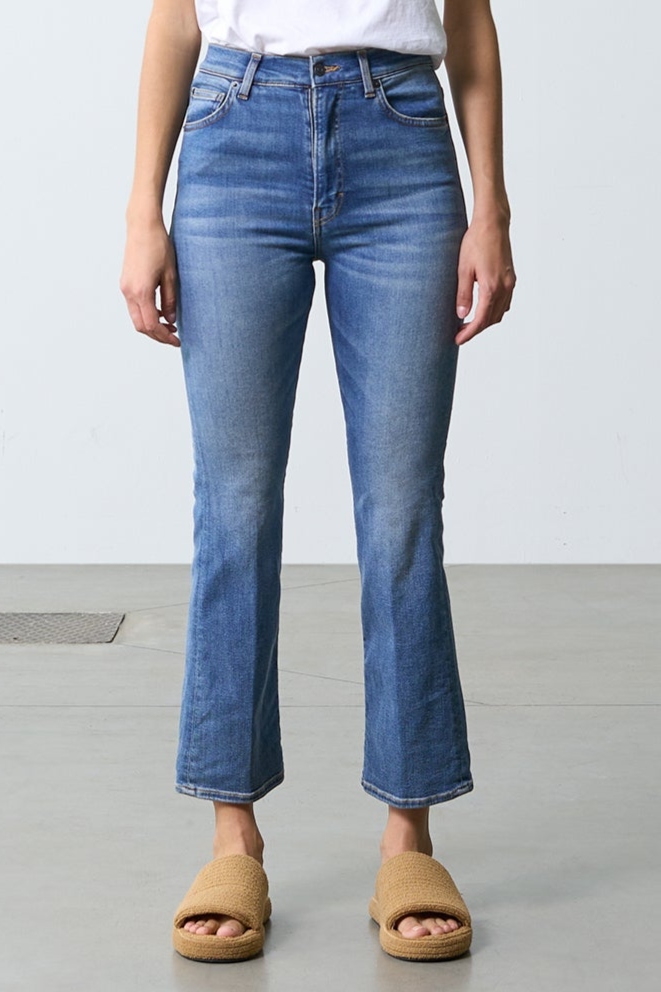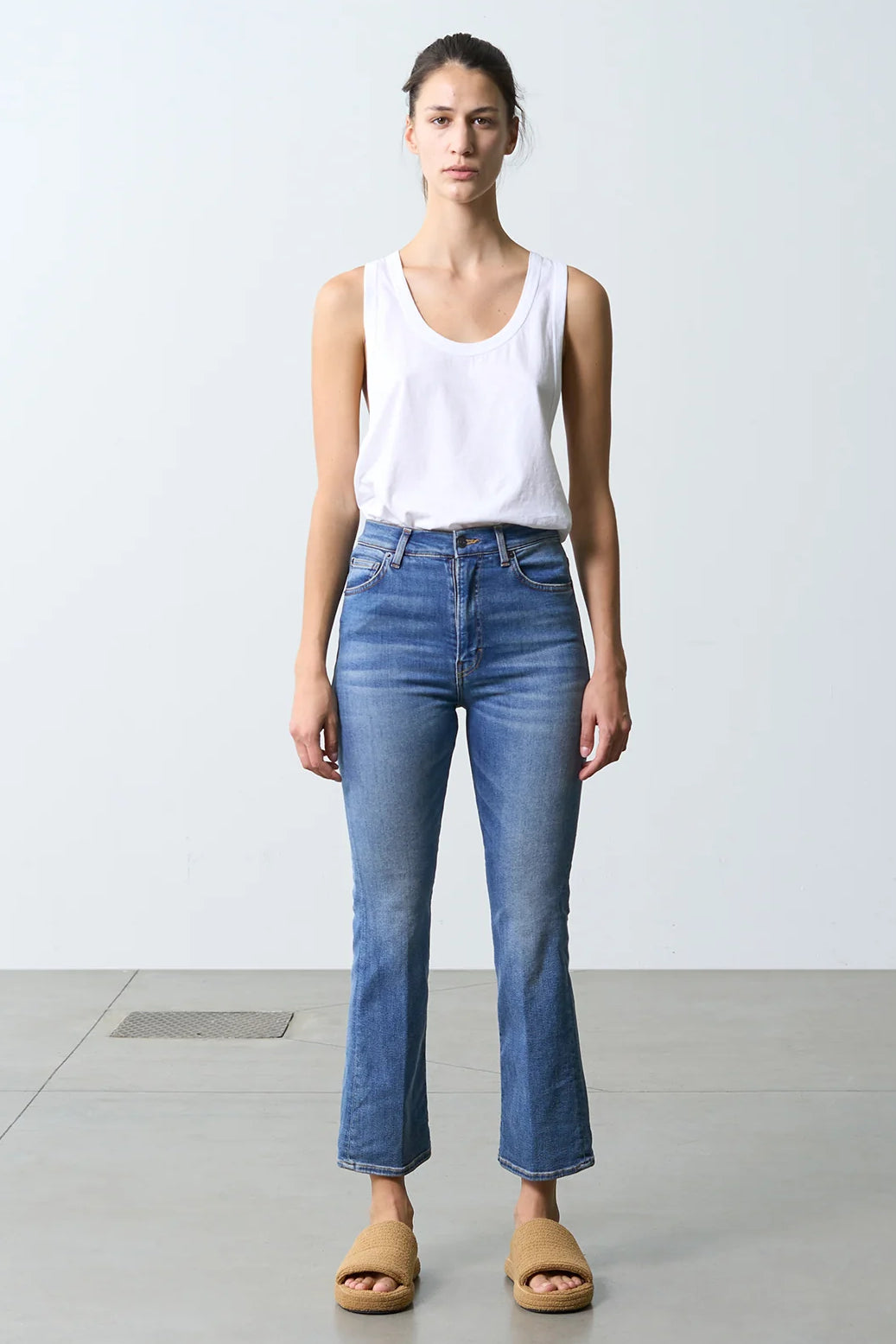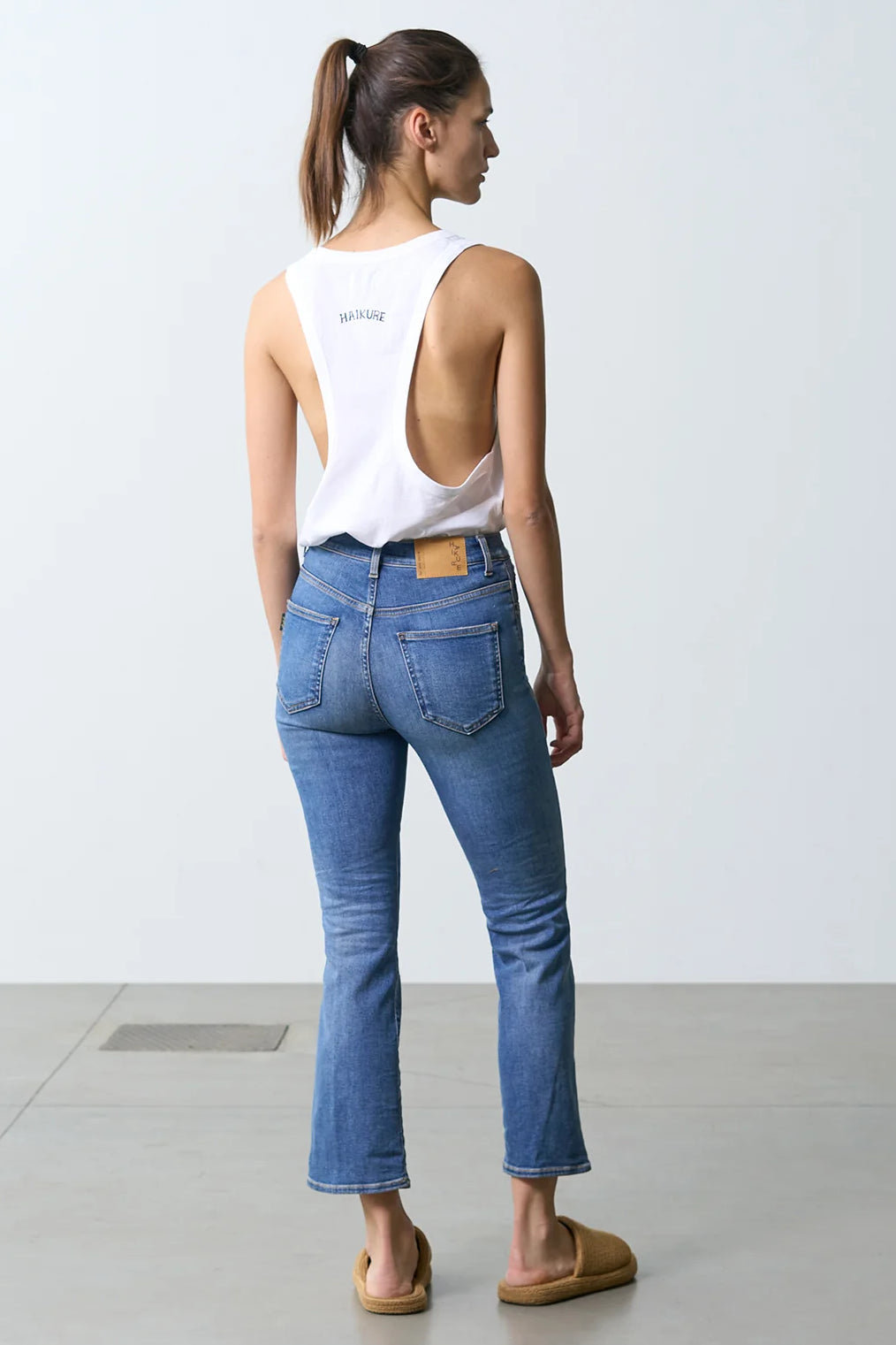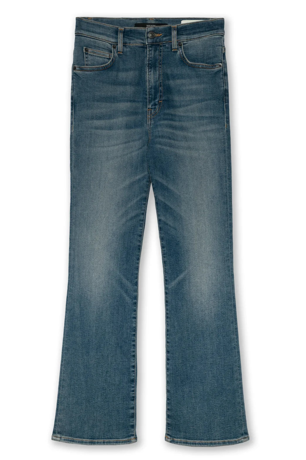 Flared high-waisted jeans from Haikure featuring blue, cotton-lyocell blend, flared, front button and zip fastening, logo patch to the rear, classic five pockets and high-waisted.
