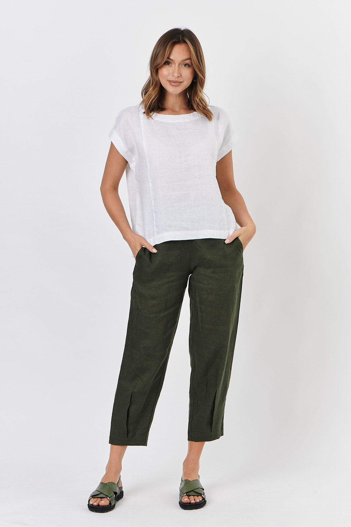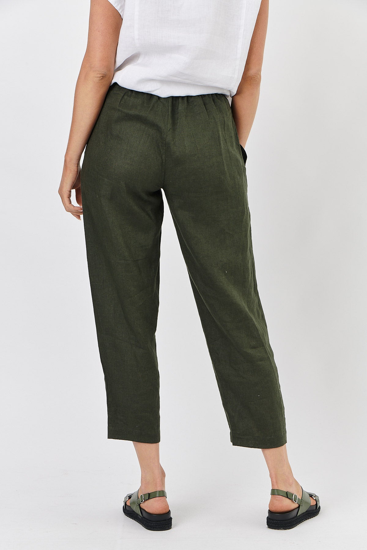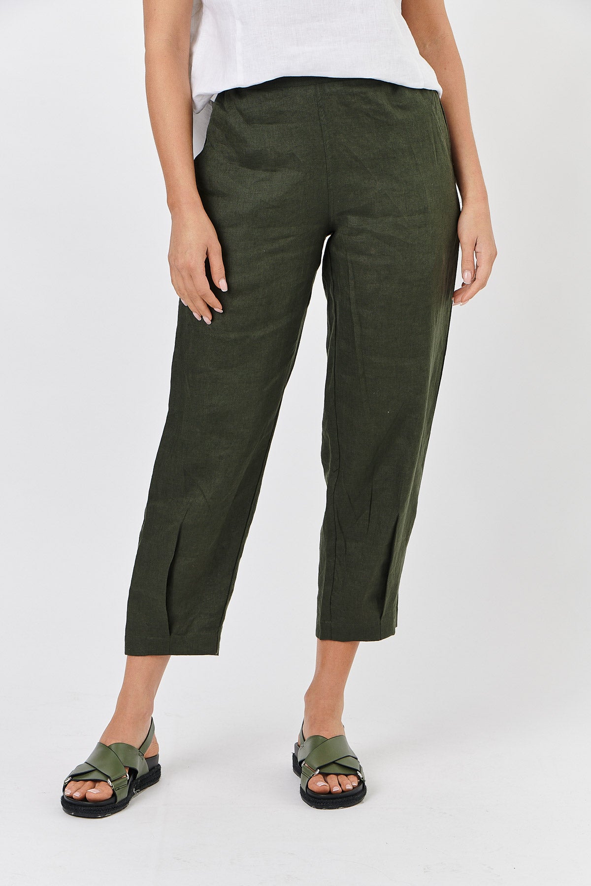 Inspired by the classic chino pant but in breathable, 100% linen, a cropped, straight-leg pant featuring an elastic waistband and pockets. A subtle panel at the pant hem completes the look.