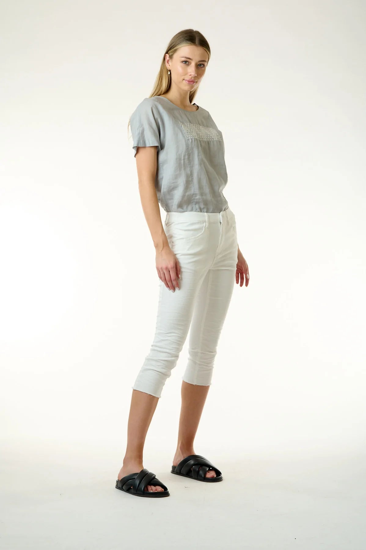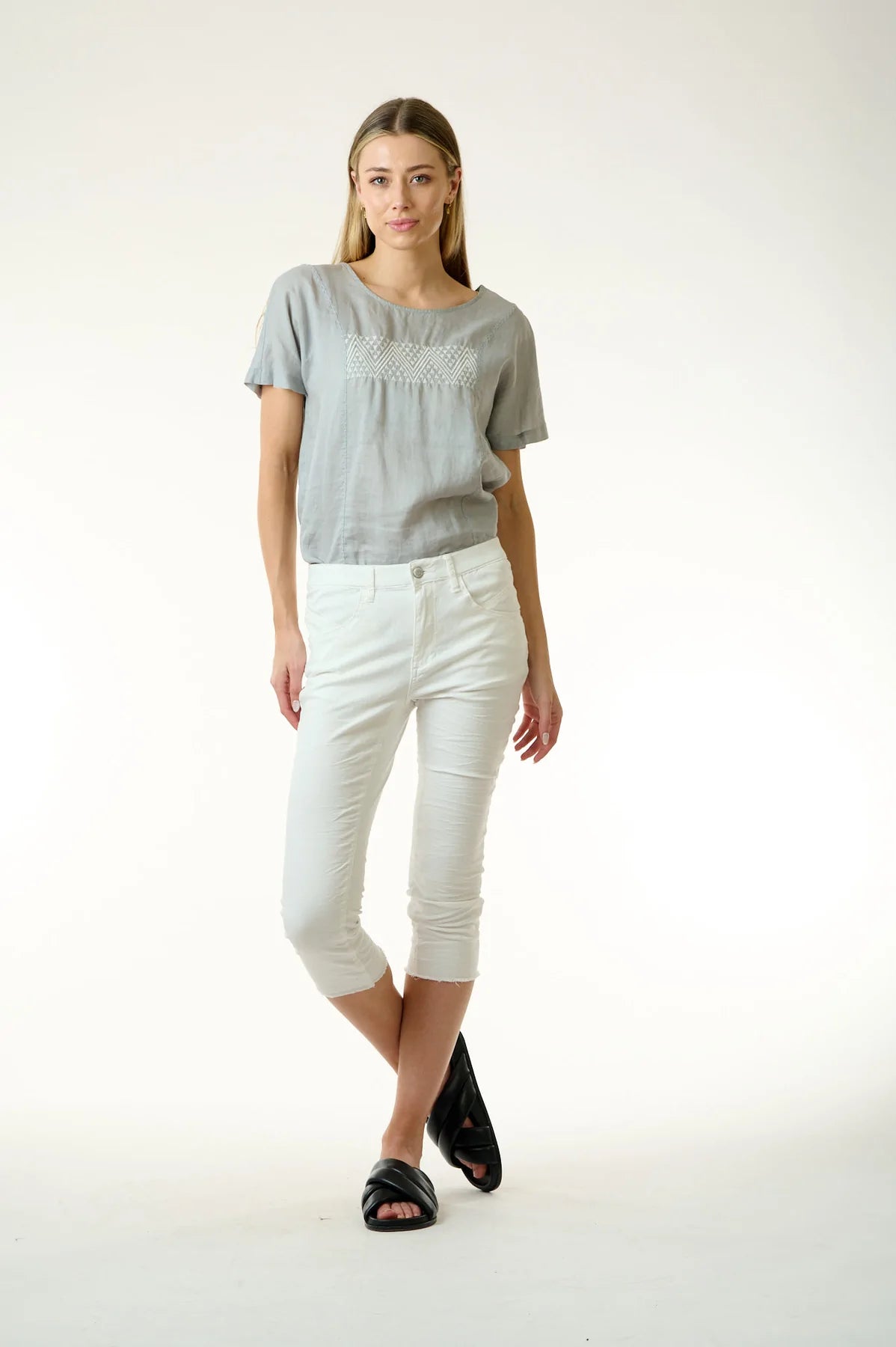 The Jiji Solid Snow White Jean is the ultimate 7/8 length jean. Pair them with a laid back t-shirt or with a breezy shirt, perfect for the warm weather. Made with comfortable and light stretch denim, these jeans are a summer staple.