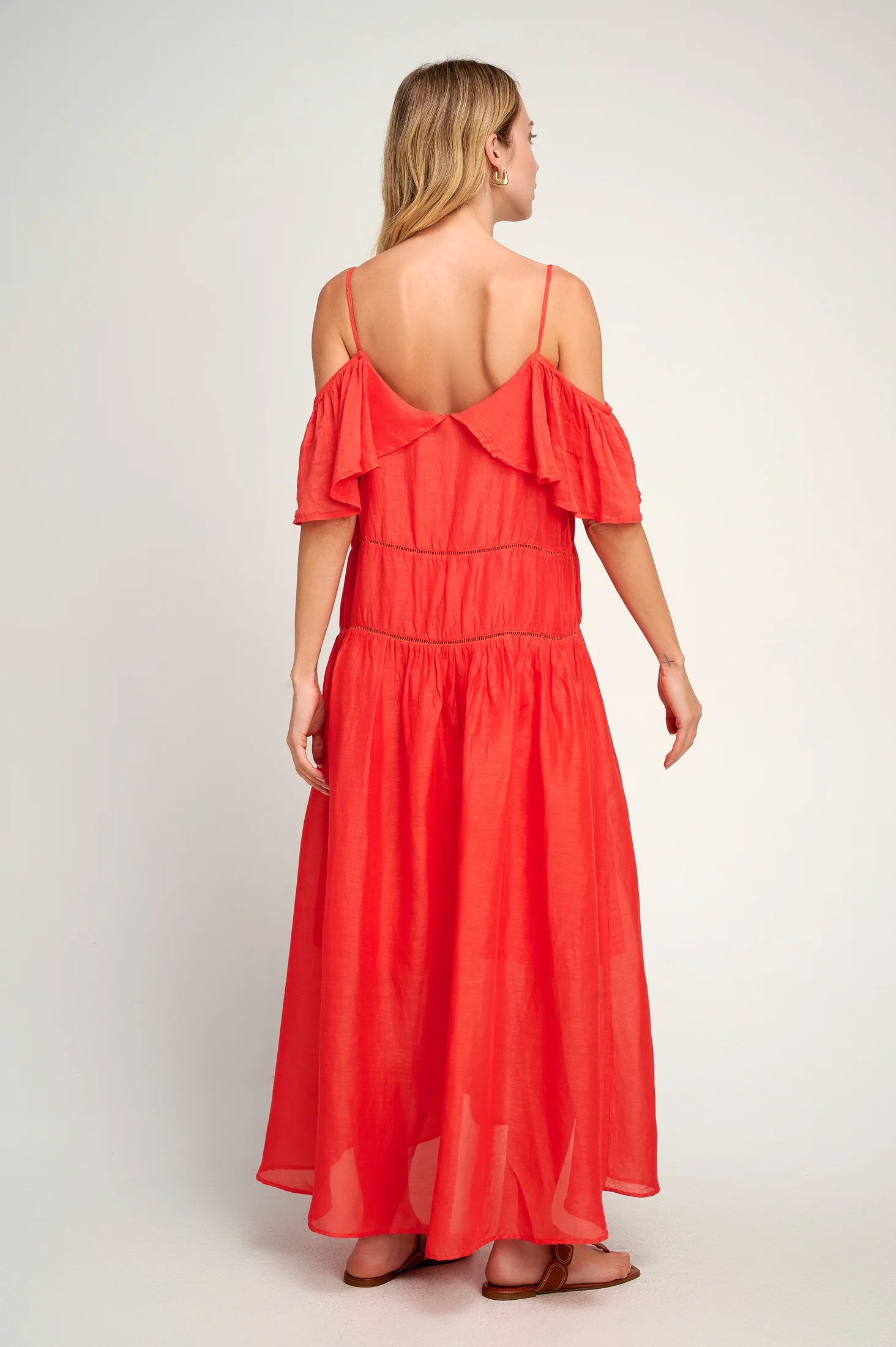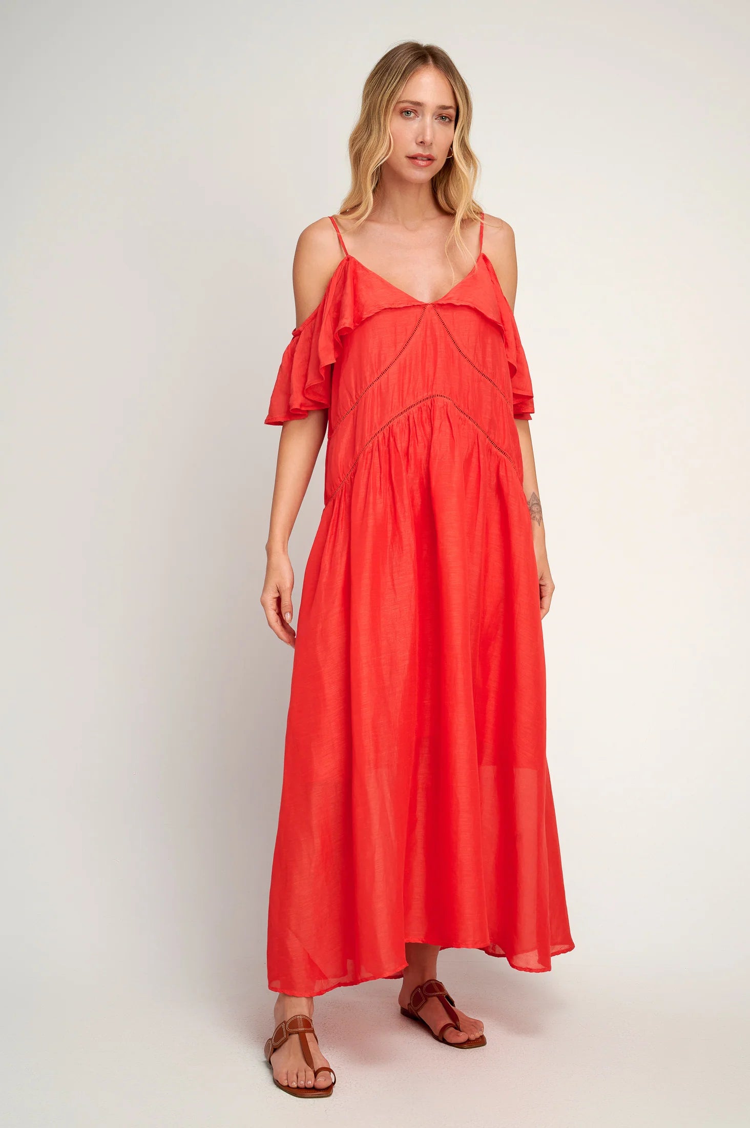 A flattering sleeveless dress that will complement your warm summer days perfectly. Featuring ruffled details along the spaghetti sleeve off-shoulder strap, and slightly V neckline and a flowy maxi silhouette for a lightweight feel on hot days.