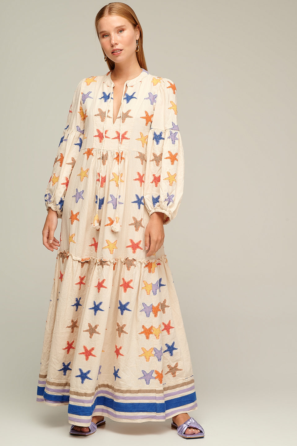 The Zakar Maxi Dress is a cotton maxi dress that features a crew neckline with a tie for closure. The relaxed shoulders drop into a full length sleeve with a wide cuff. The two-tiered design of the dress is embellished with elaborately hand-woven geometric shapes originating from traditional Grecian motifs. Available in multiple colours and patterns, the Zakar Maxi is a must have for Summer.