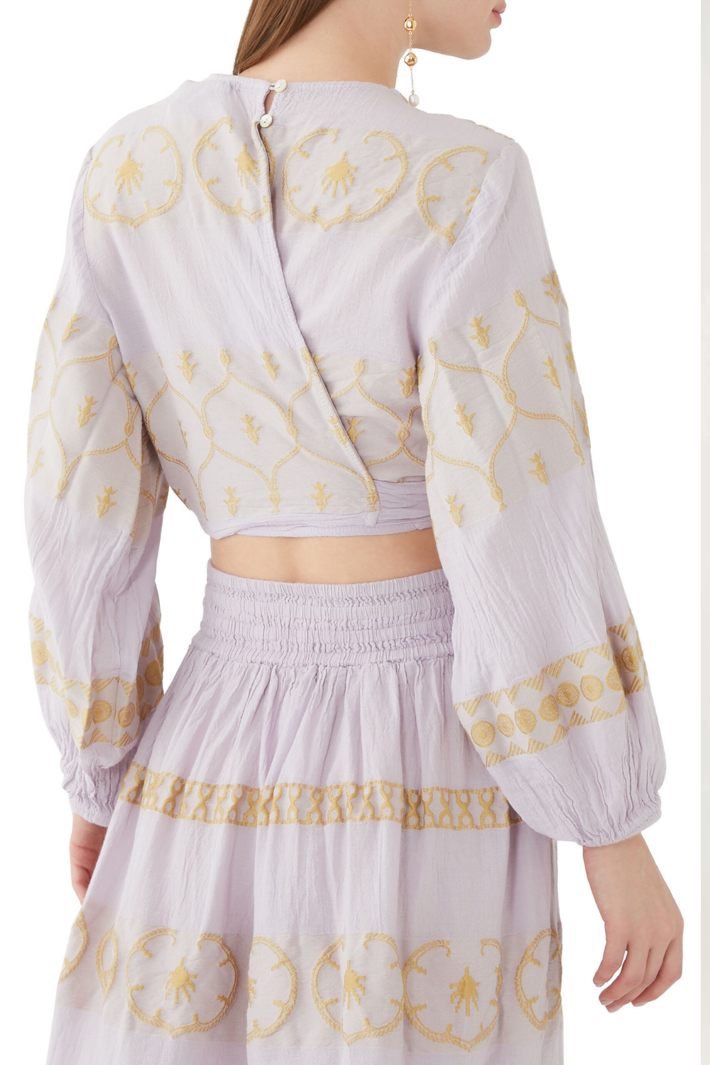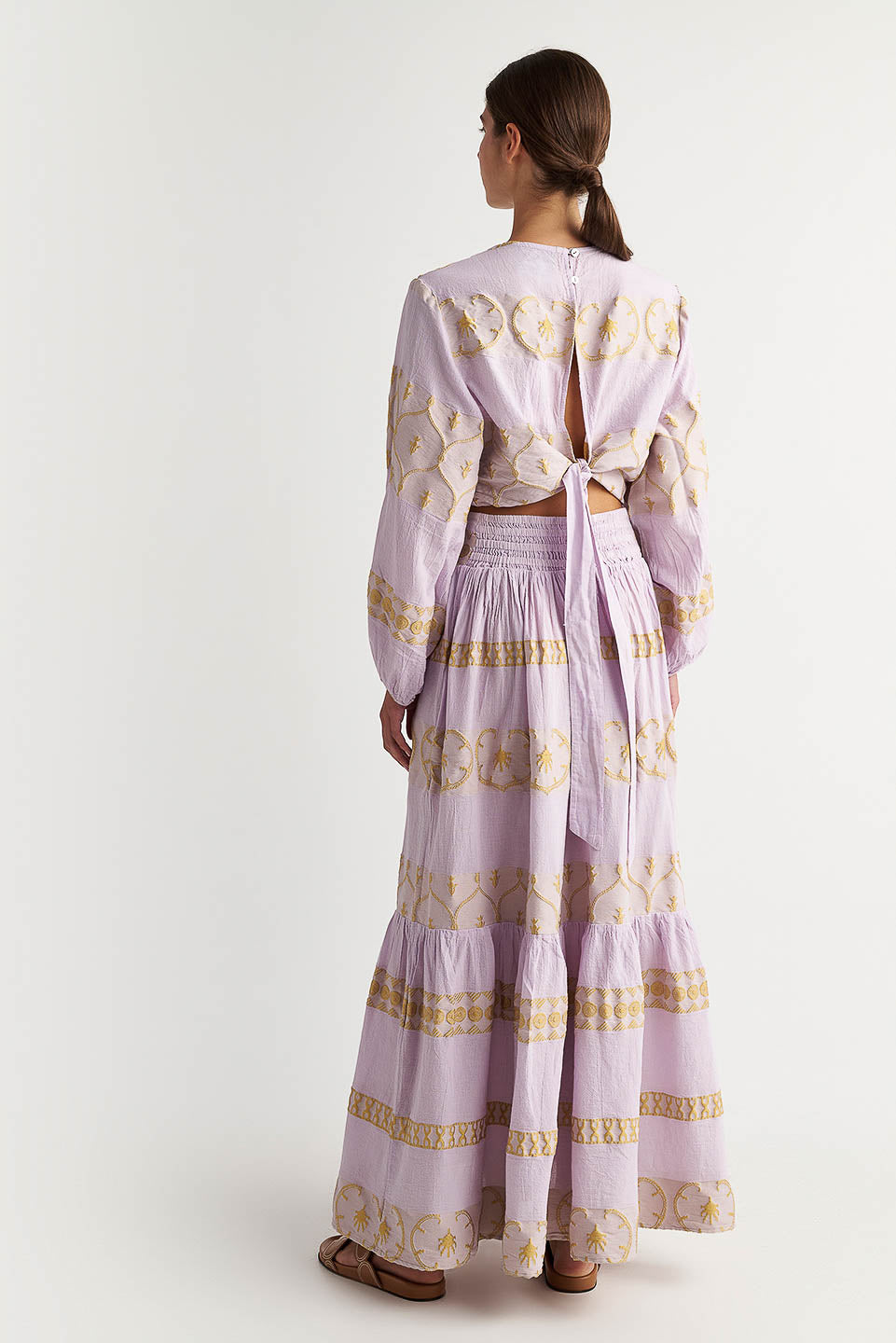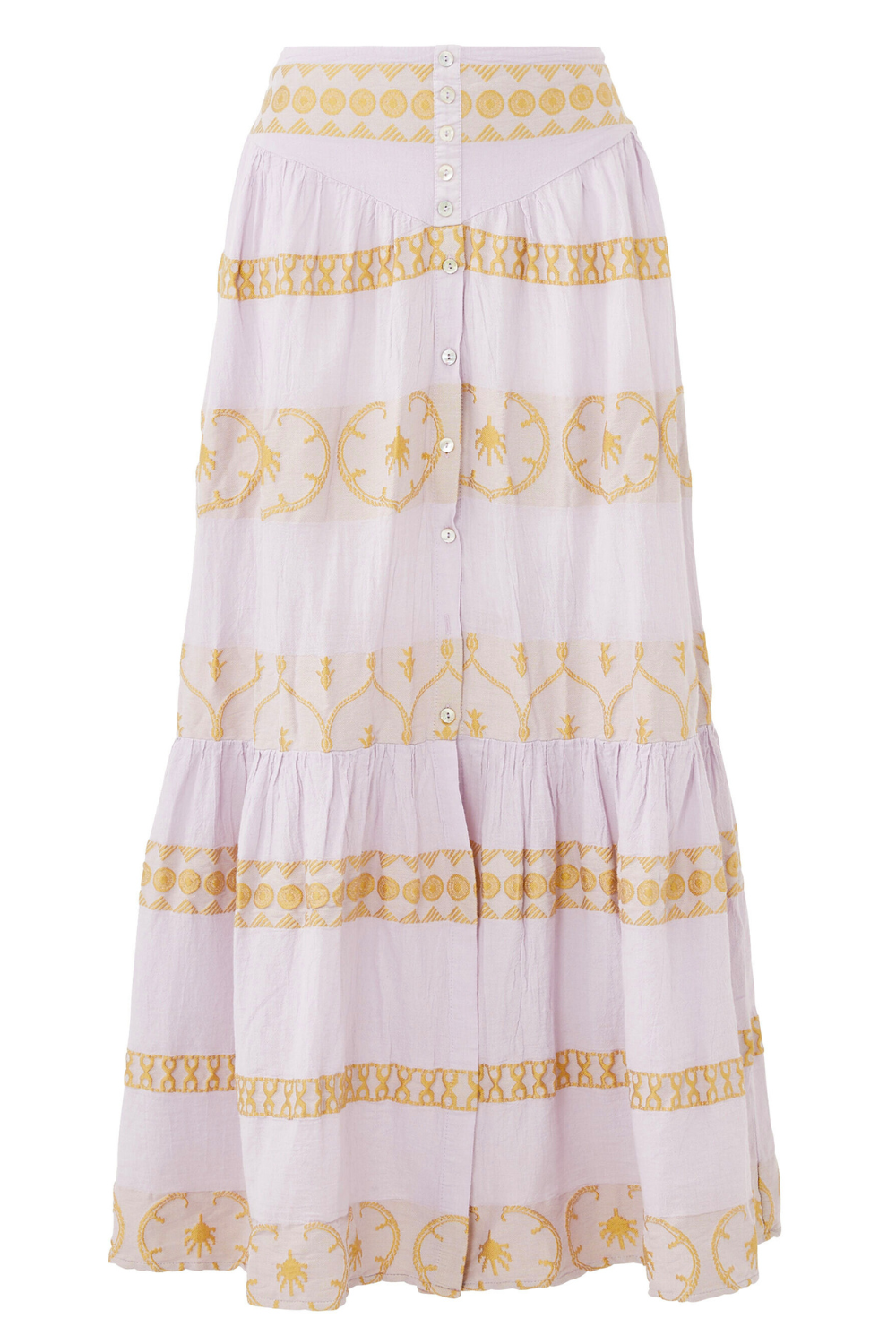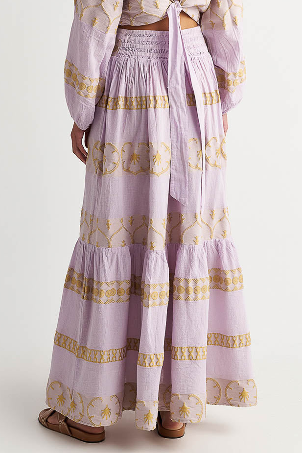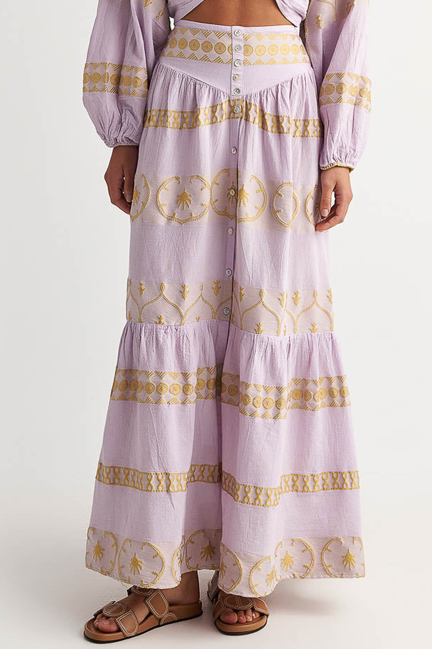 Embrace bohemian elegance with Pearl And Caviar’s Zakar Skirt. This maxi-length style features a wide waistband, two deep tiers and small buttons through its front. It’s cut from lightweight cotton and adorned with embroidered crests and charms that pay homage to the brand’s Greecian roots. Coordinate your look with the matching Zakar Crop Top.