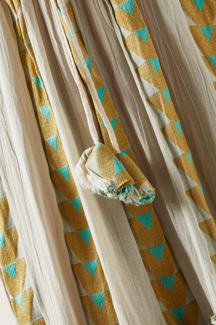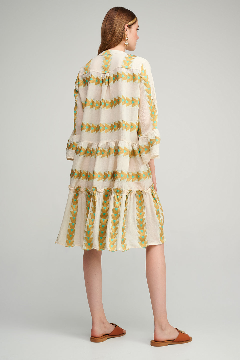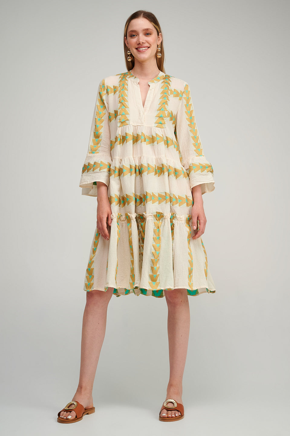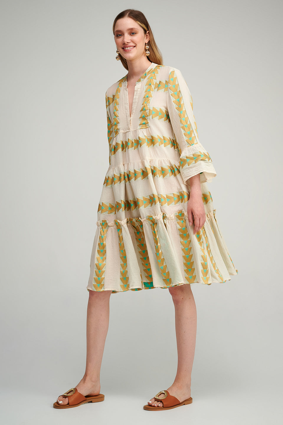 Designed with a deep v-neck and loose tiered skirt this short knee-length dress has bracelet-length sleeves with a trumpet cuff. The two-tiered design of the dress is embellished with elaborately hand-woven geometric shapes originating from traditional Grecian motifs.