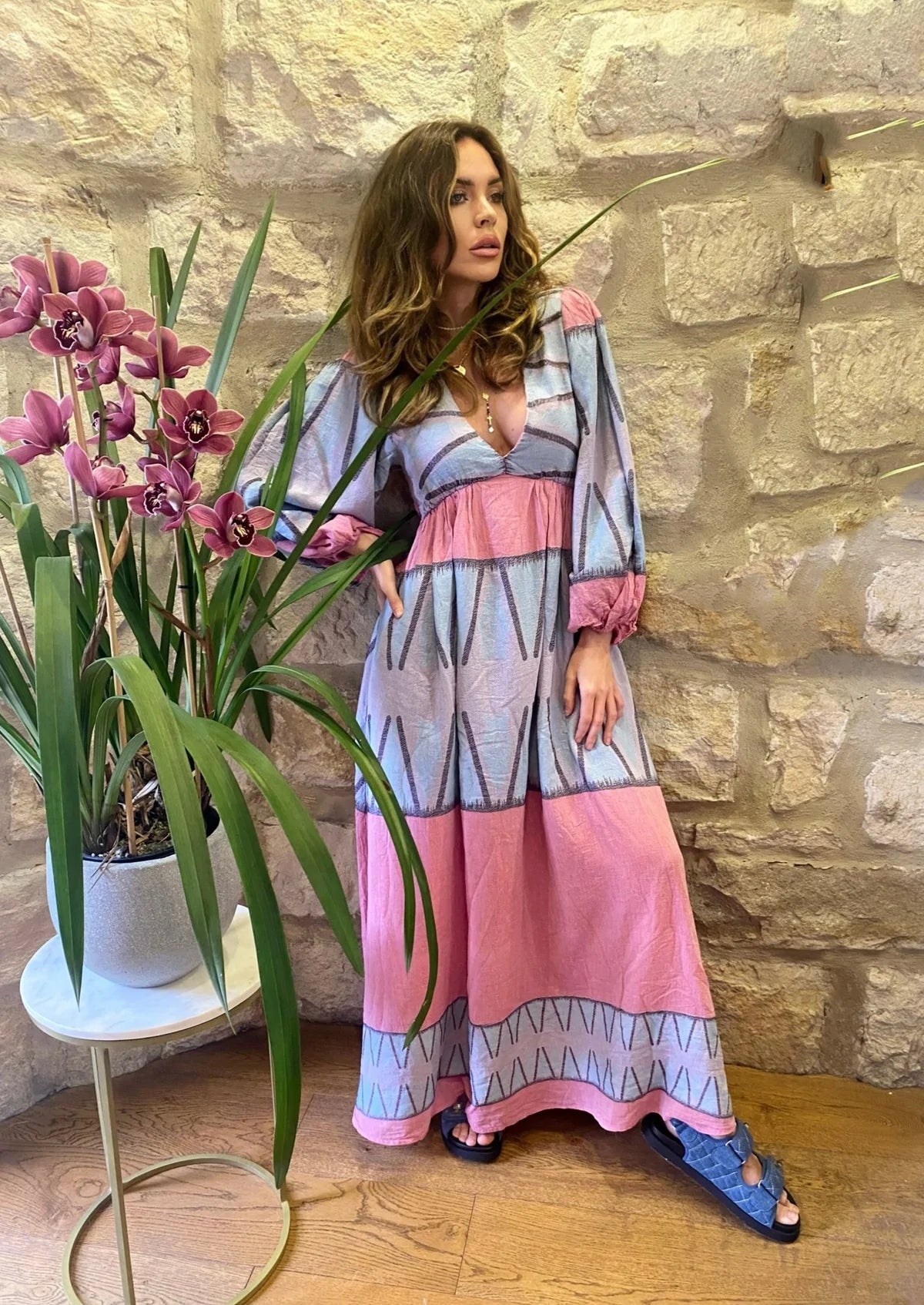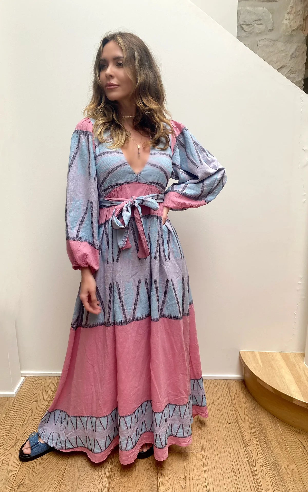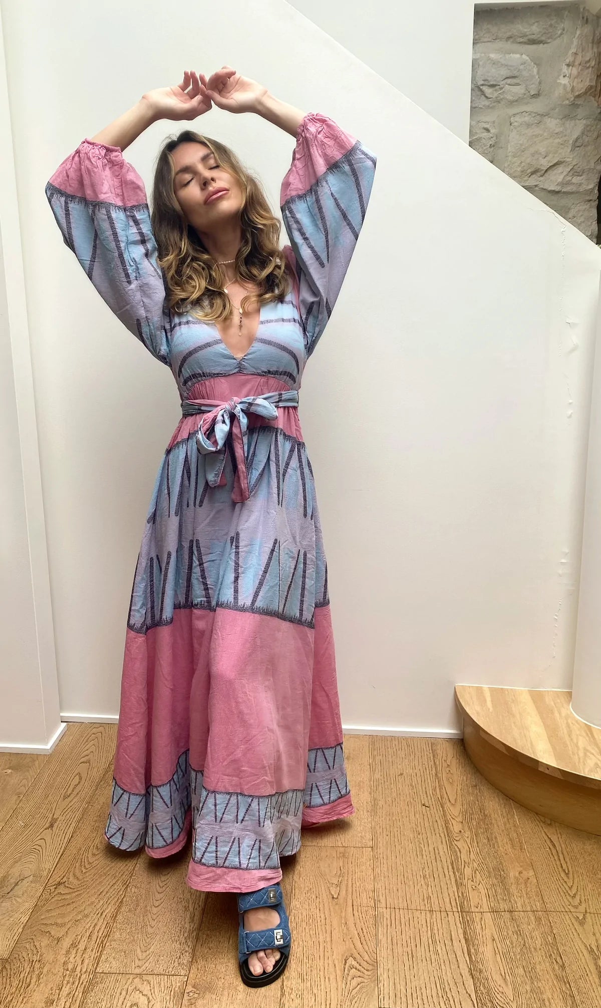 The Zakar V Neck Tie Maxi Dress by Pearl & Caviar is an update on the classic maxi dress design featuring elegant, voluminous full length sleeves with elastic cuffs. The silhouette features a deep v-neckline, a slight high-low design and a self-tie belt for added shape. The full skirt finishes at ankle and is embellished with elaborately hand-woven geometric shapes originating from traditional Grecian motifs.