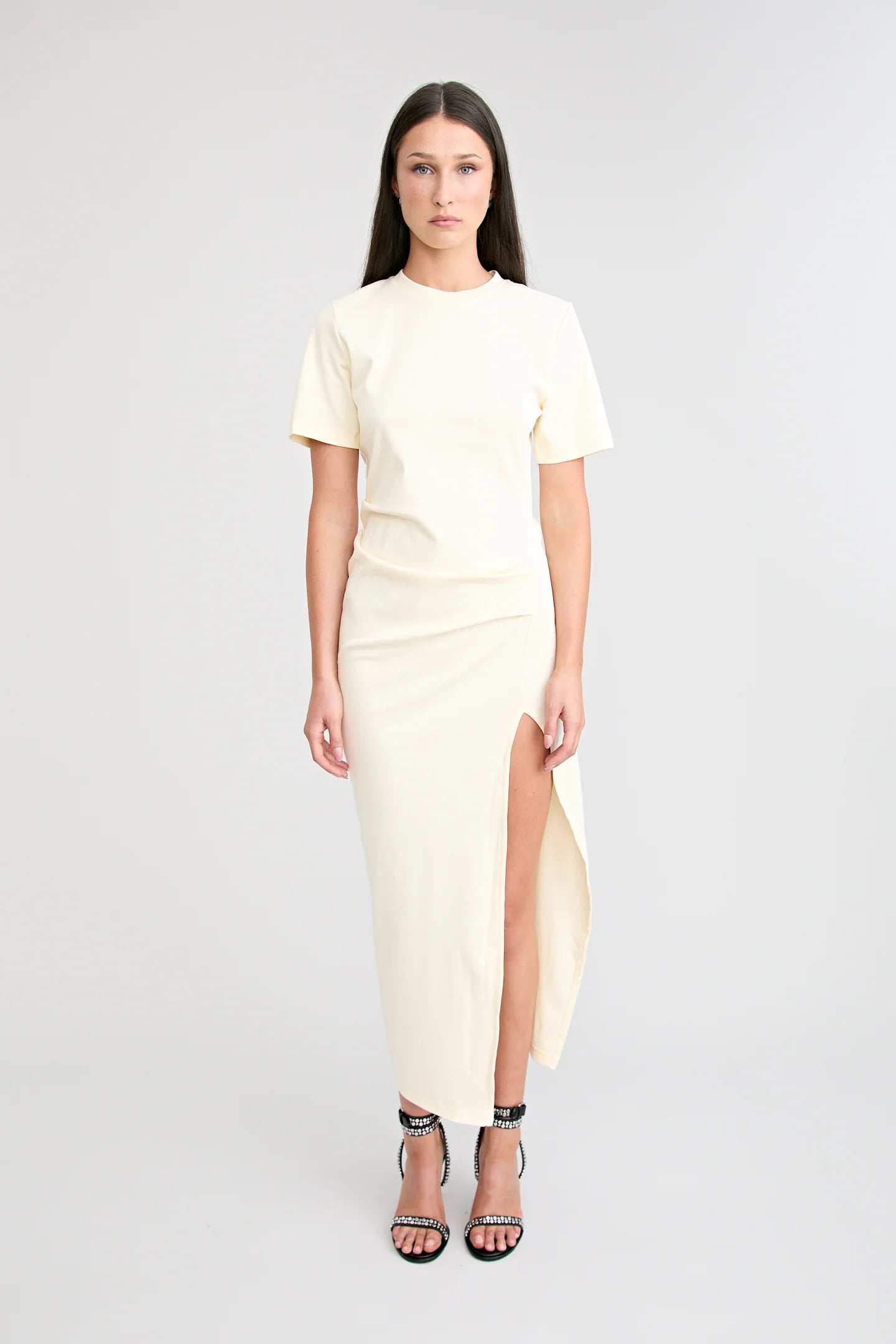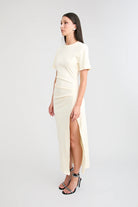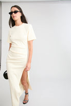 Outings made easy. The Portia Dress is a maxi length T-shirt dress with our signature tucks in all the right places. Crafted in a heavy weight material its the perfect balance between structured & comfortable, ideal for long days & long nights.
