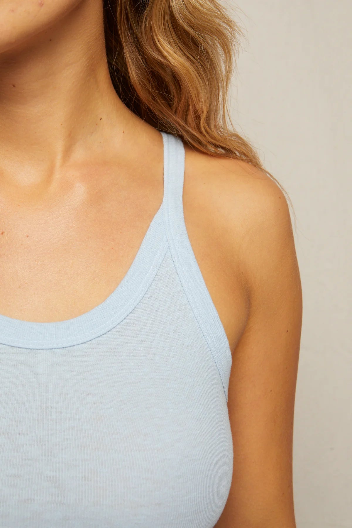 When you choose one of our recycled pieces, you make the right choice. Not only for its sustainability but because the fabric is unique. The Lennox tank is form fitting with a shrunken silhouette. The recycled fabric has unique highs and lows and looks like you’ve had it for years.
