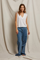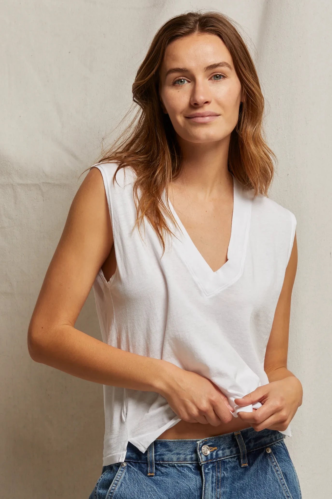Crispy lightweight cotton sleeveless v neck tank. Everyone needs this sleeveless tee.