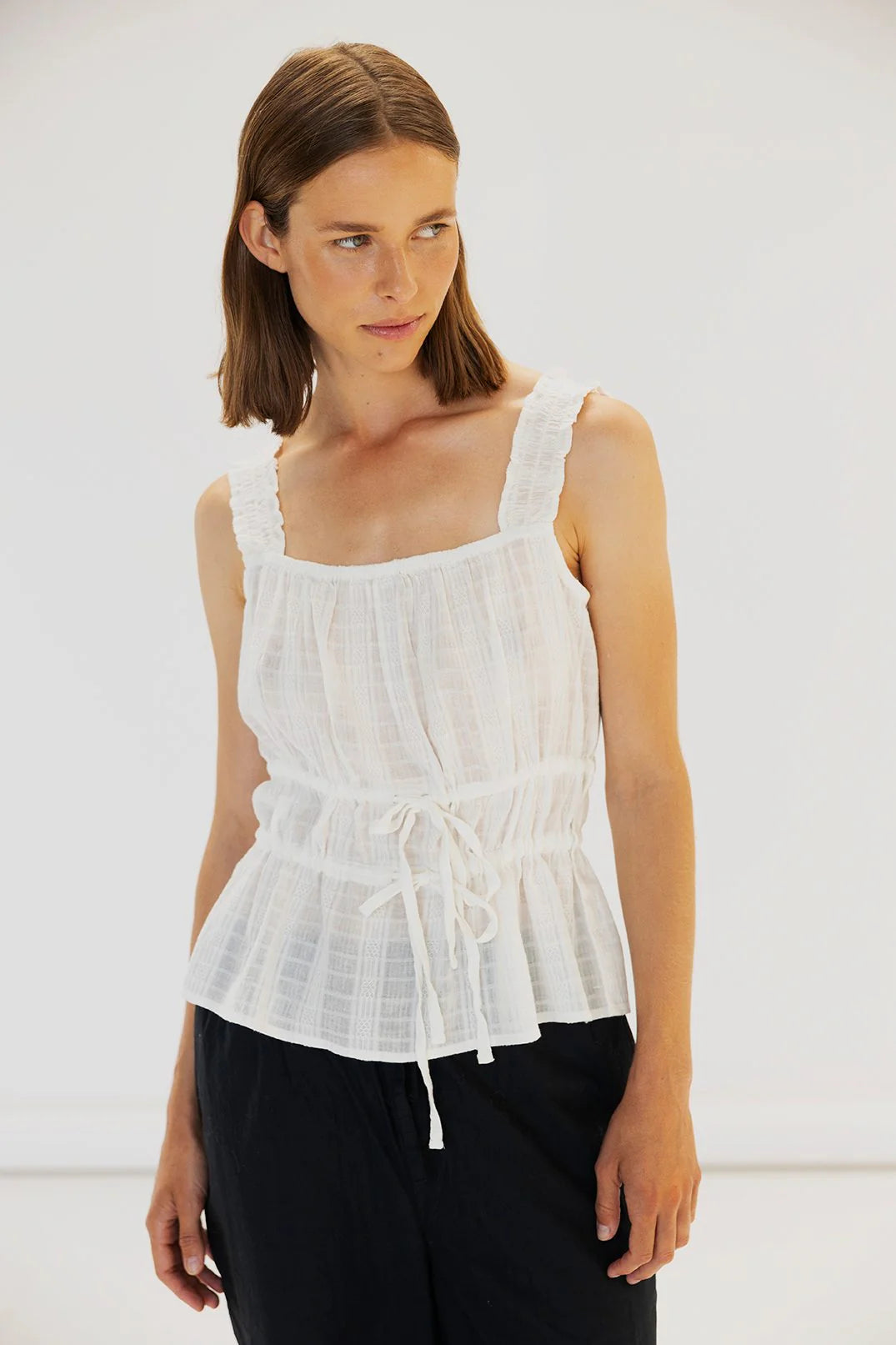 Tallis is a sleeveless top with many beautiful details. The straps has elastic smock which gives them frills and they are super comfortable to wear. The top has a loose fit with two casings at waist with tie strings to adjust the fit as you like. The fabric is super soft and delicate and has a light feel.
