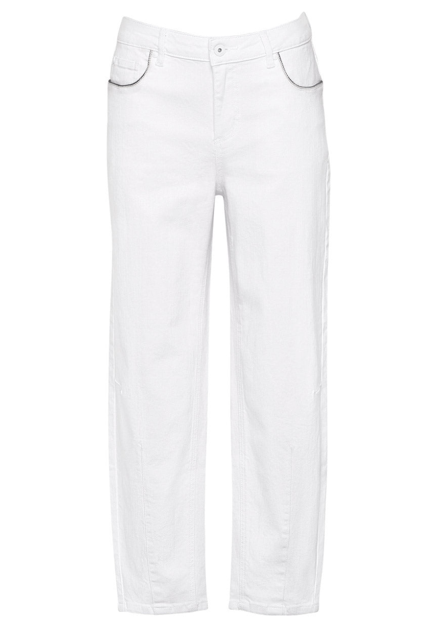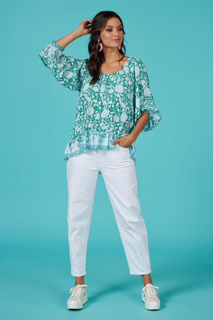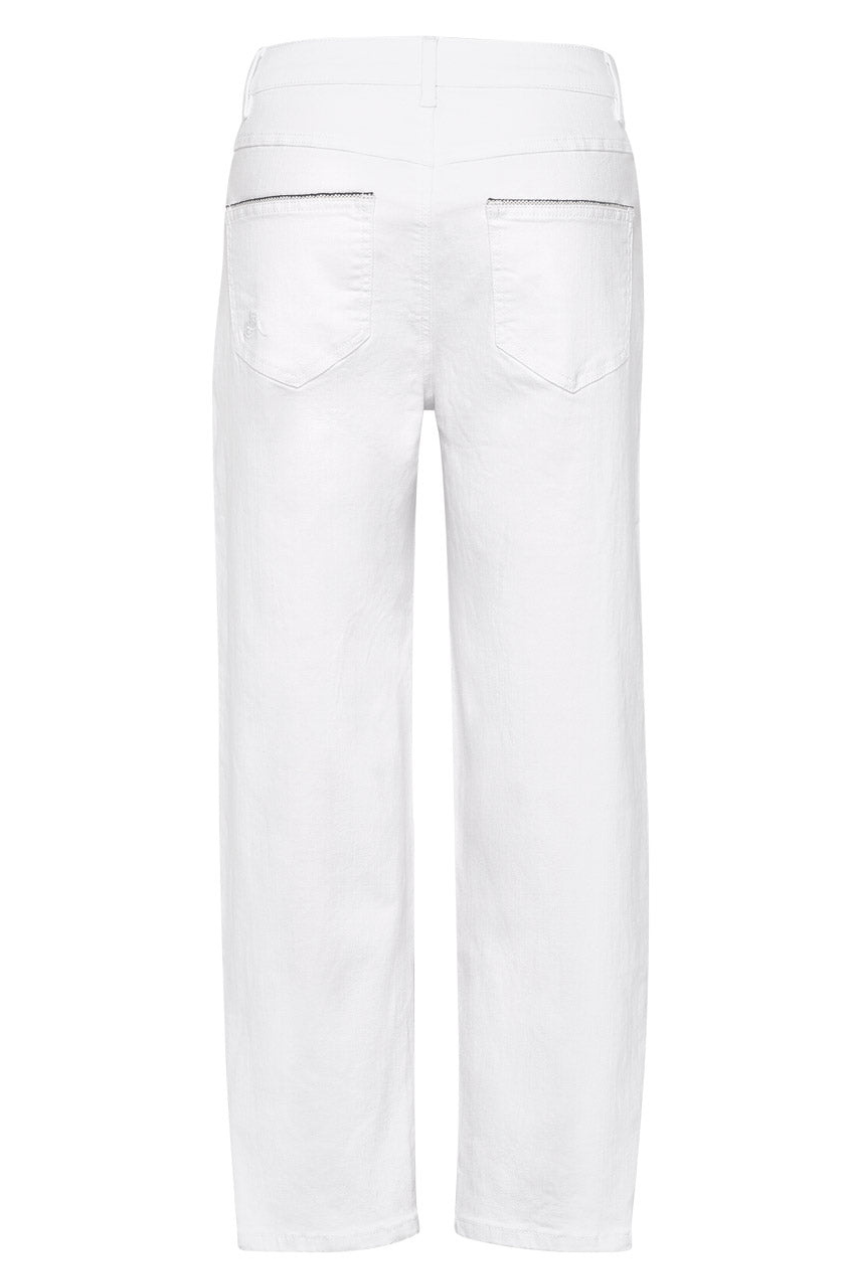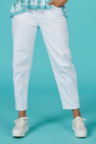 Cropped denim jean, with a tulip leg design. Featuring indigo and white piping trim around pocket openings.