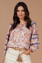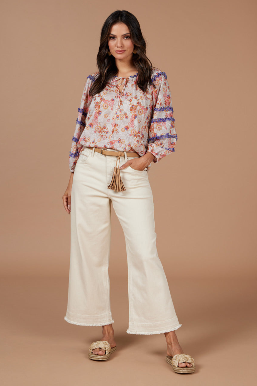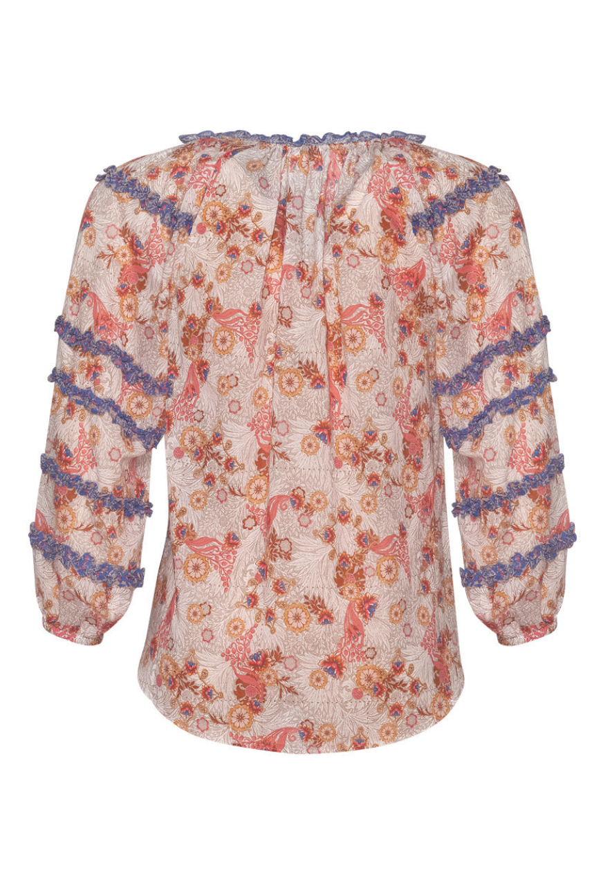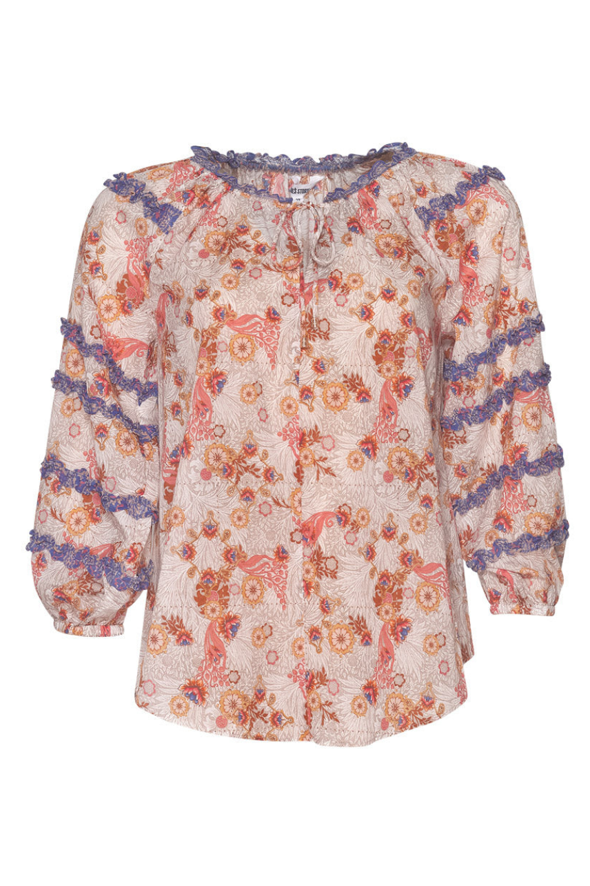 Relaxed raglan blouse with a tie neckline, featuring yoryu ruffles layered around the neckline and sleeves, with elasticated sleeve cuffs.