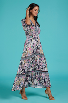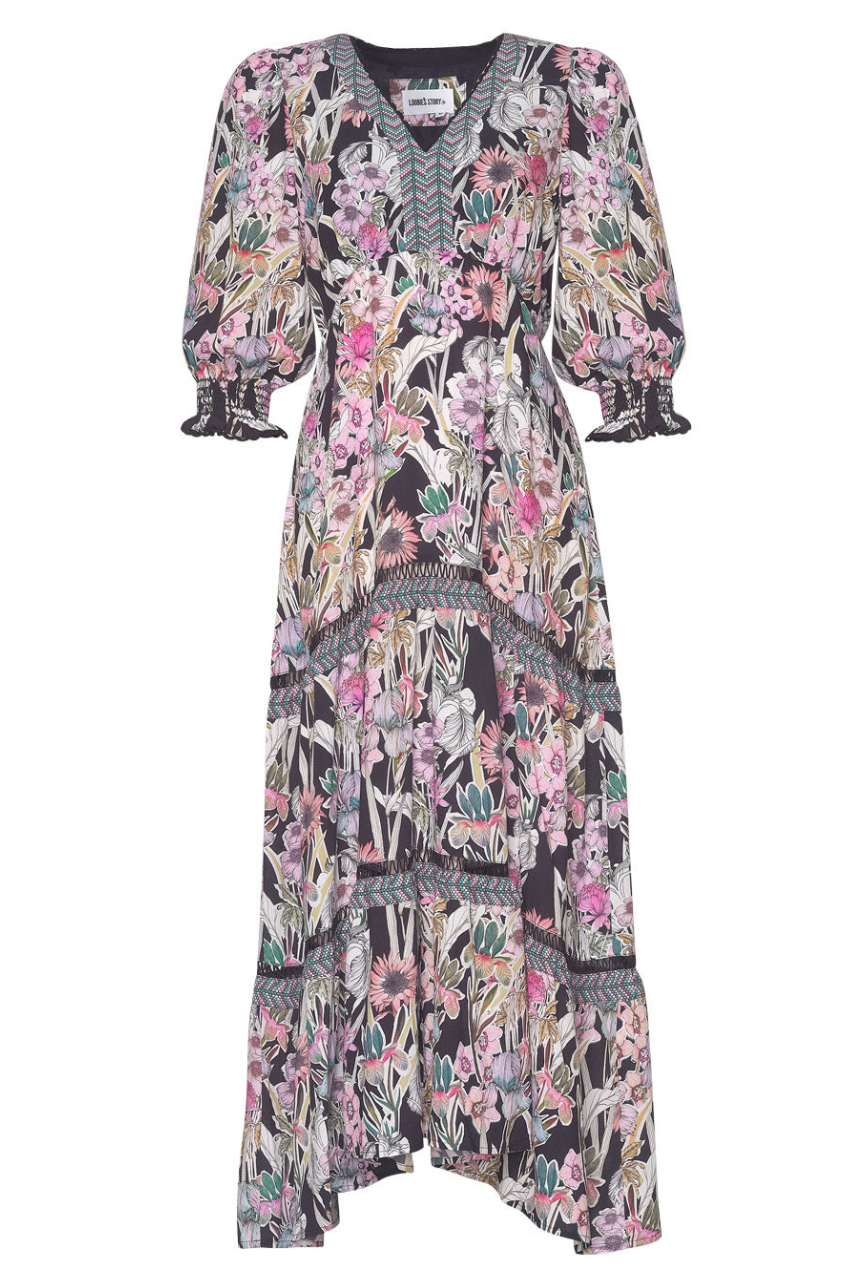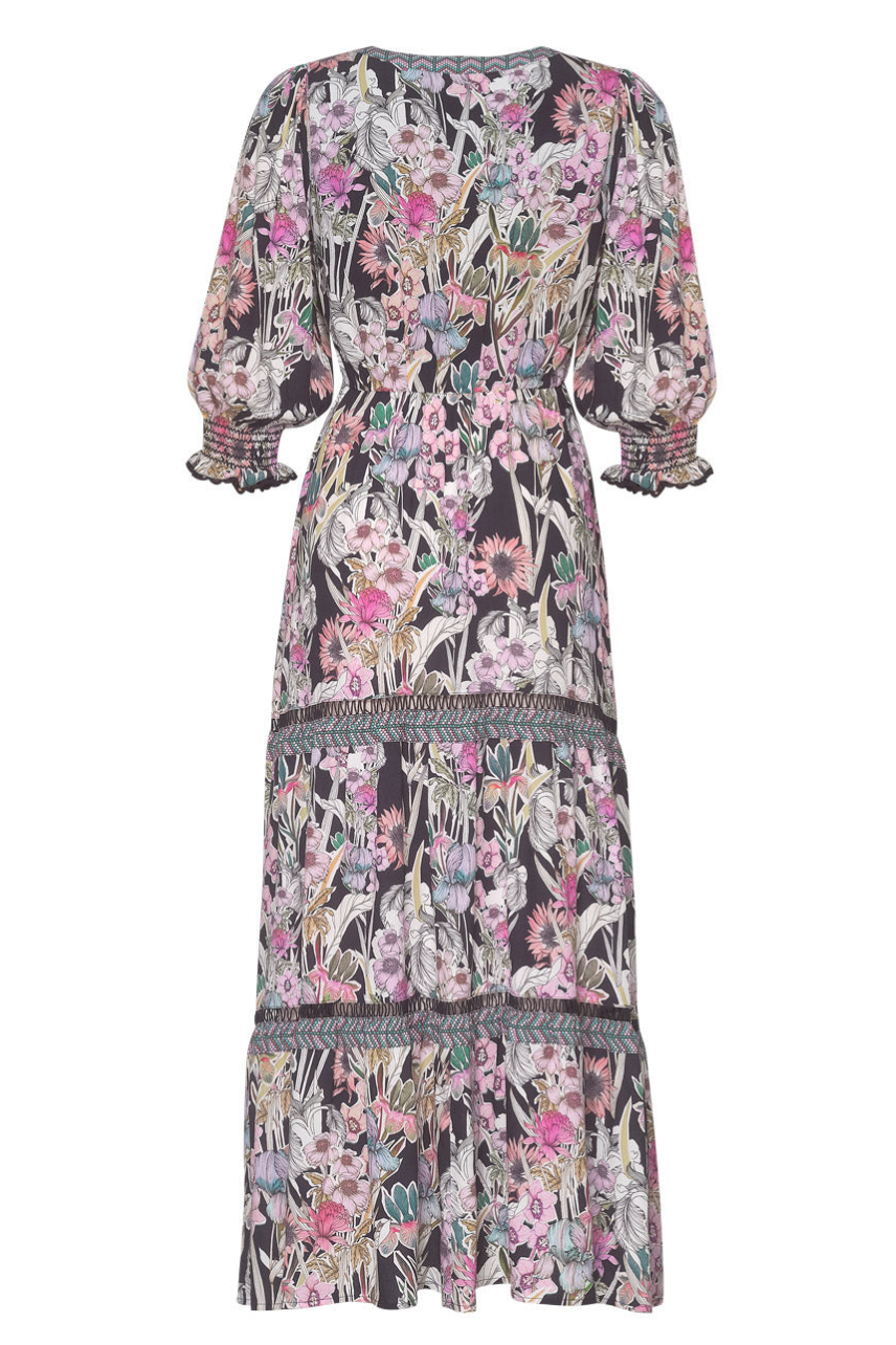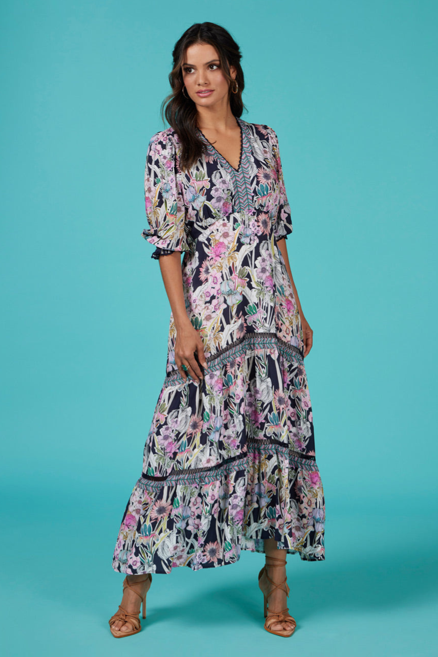 Show stopping midi dress with a bead print around neckline and down front placket. Tier seams are accentuated with lace trim, with panels of contrast bead print, and flounced sleeve cuffs with indigo smocking design. Featuring scalloped lace trimming around neckline and sleeve opening. Fully lined.