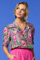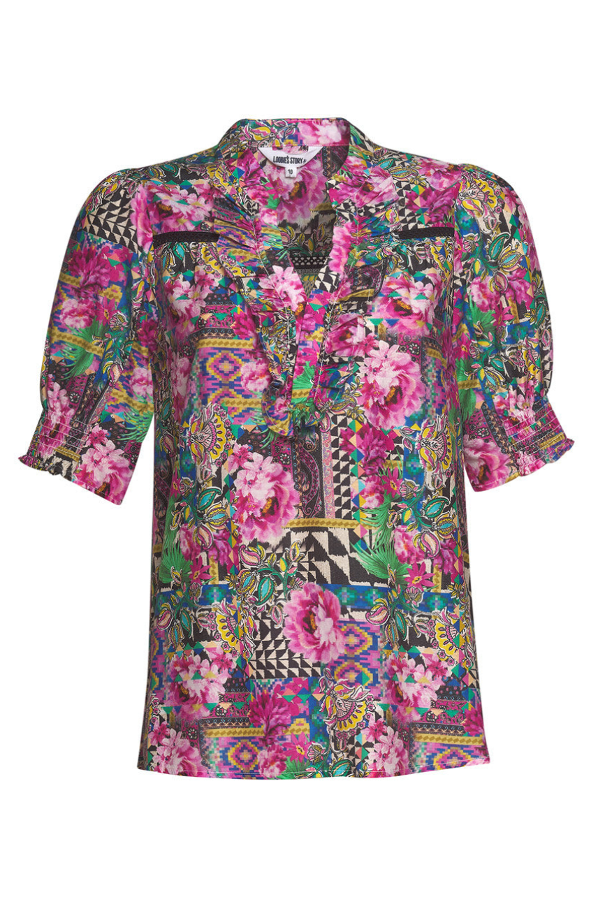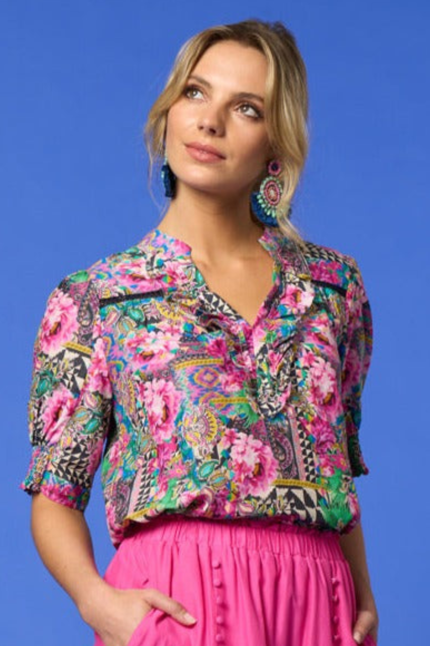 Printed top with ruffle detailing around neckline, with contrast ladder trim inserted at front seams, with half shirred cuffs.