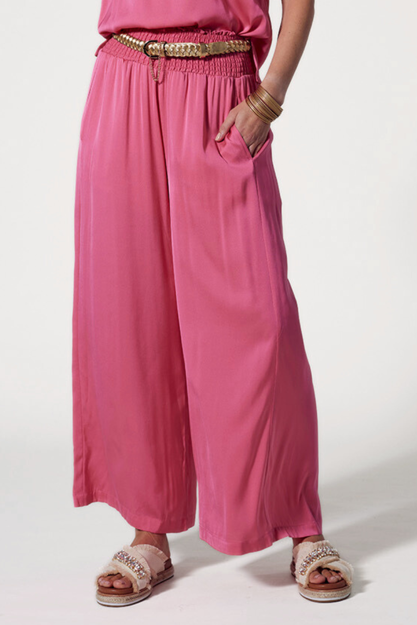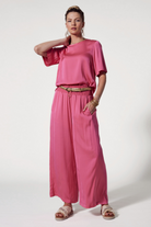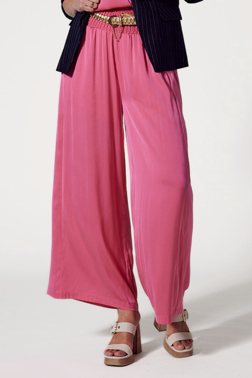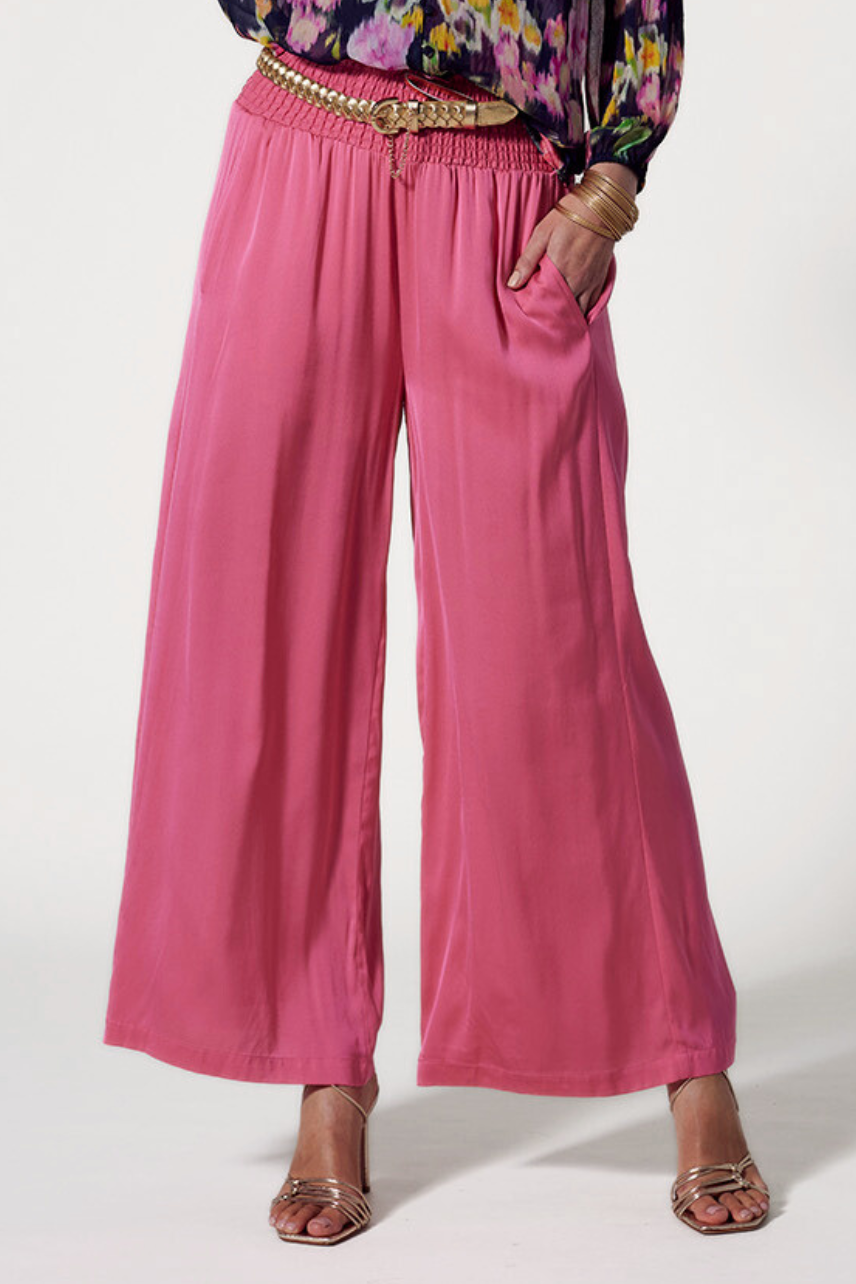 Luxe stretch silk satin wide leg palazzo pant with a shirred waistband and forward side seams for a flattering fit. Functional pockets