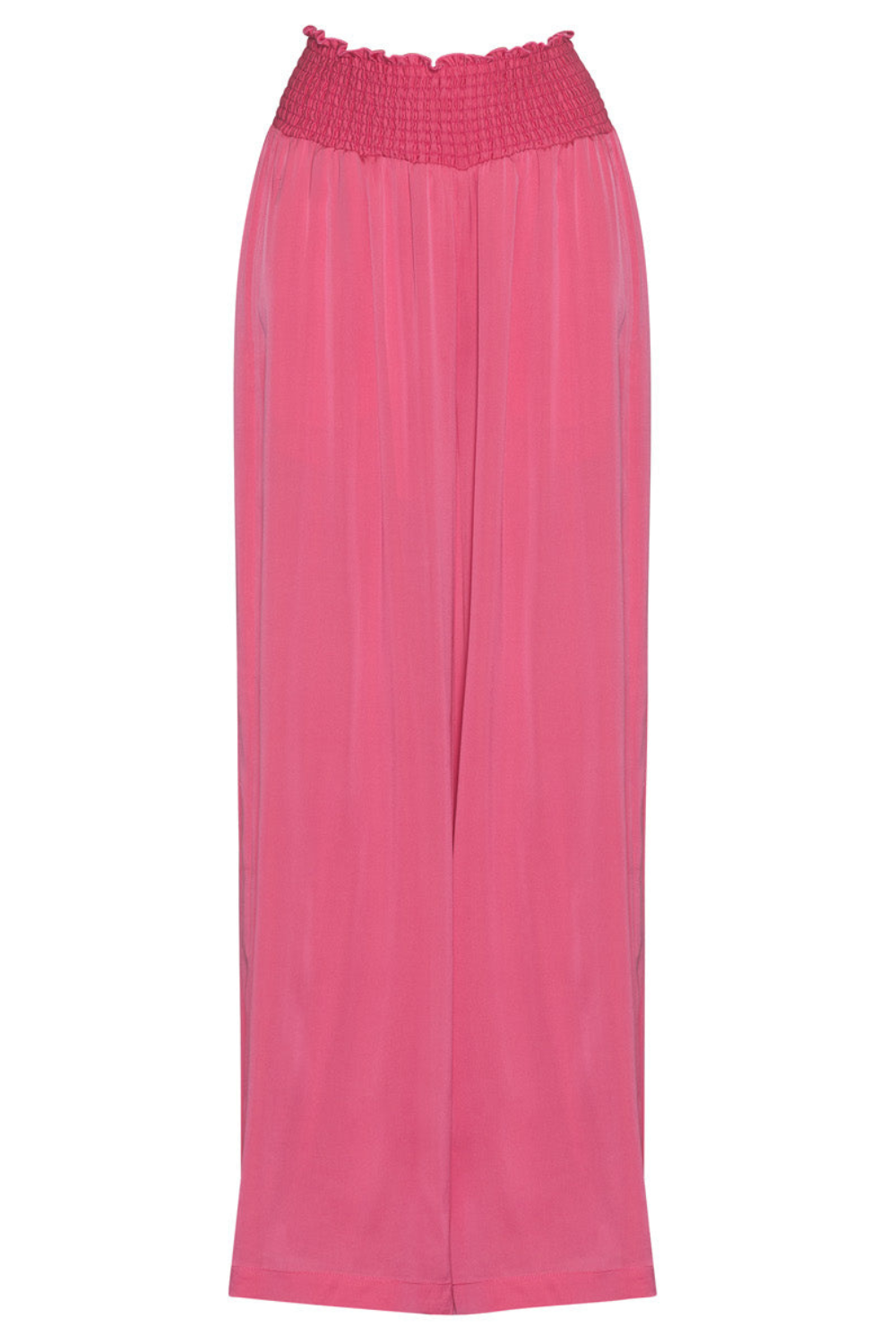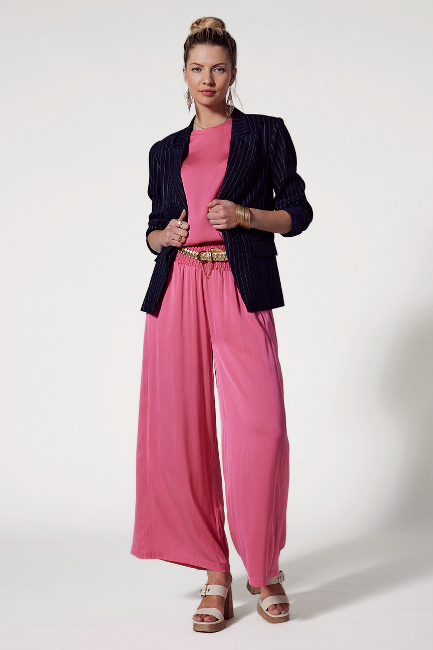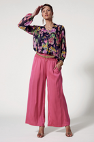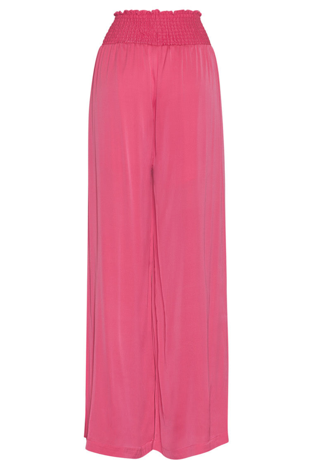 Luxe stretch silk satin wide leg palazzo pant with a shirred waistband and forward side seams for a flattering fit. Functional pockets