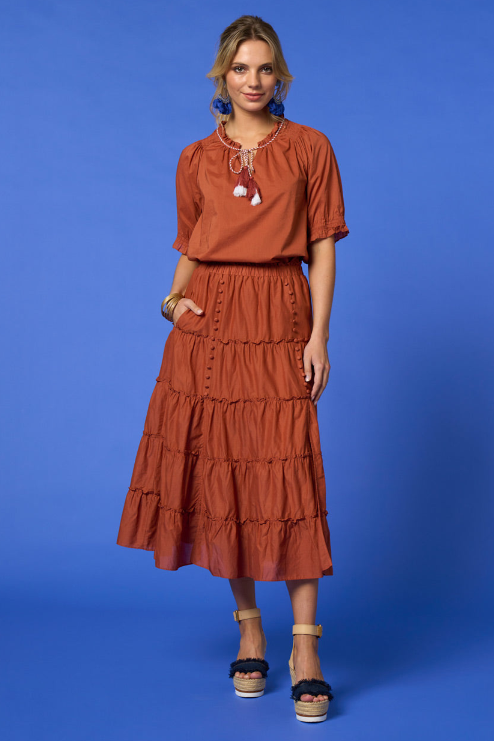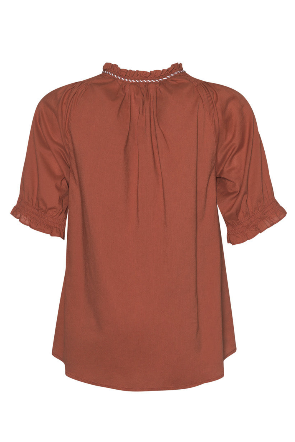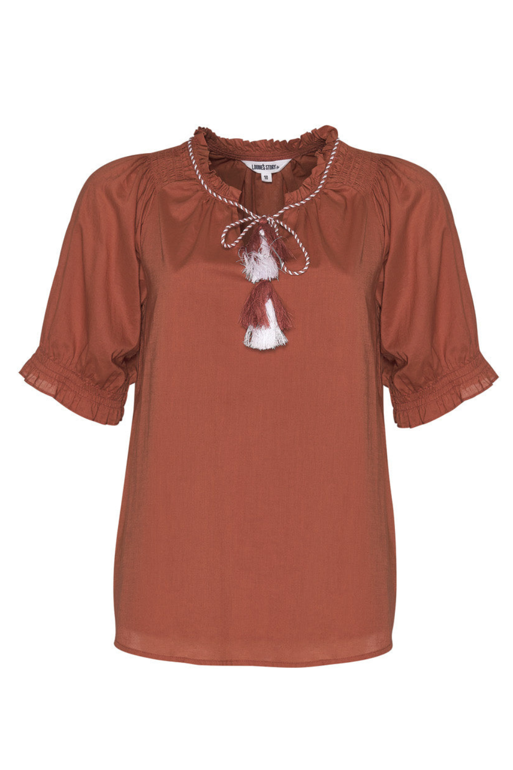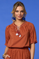 Blouse with a ruffle tie neckline and contrast neck ties. Featuring shirring around the shoulder, with elbow length sleeves and delicate elastic at the sleeve hem. Pair this top back with the Matisse Skirt in Tan for an elevated look.