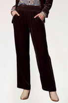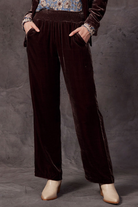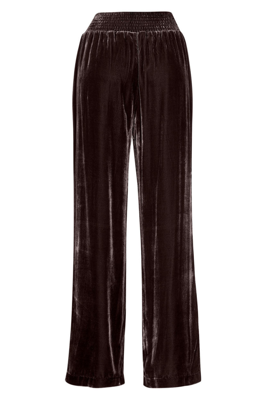 Palazzo style pant in a luxe silk blend velvet with a shirred waist band, and functional pockets.