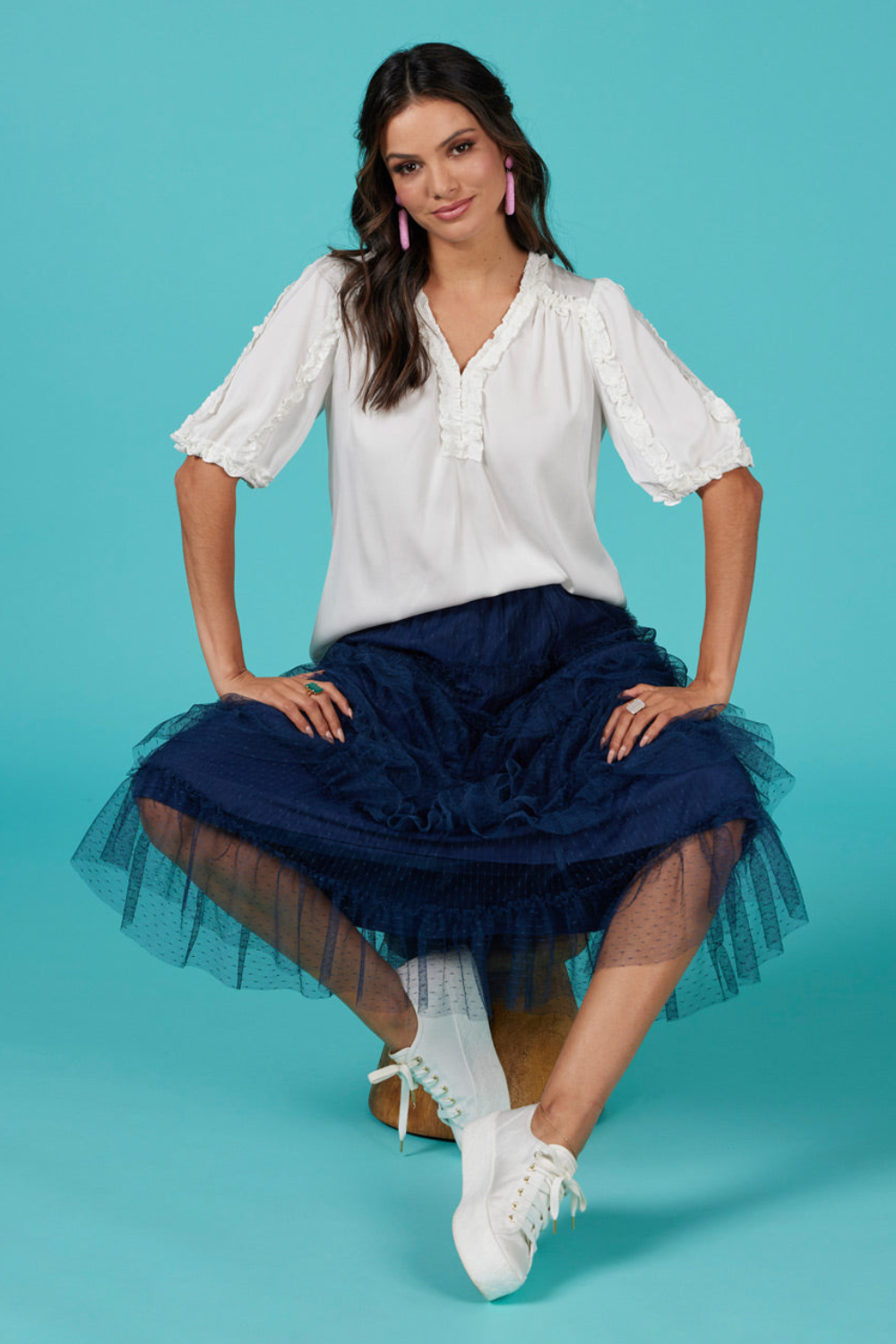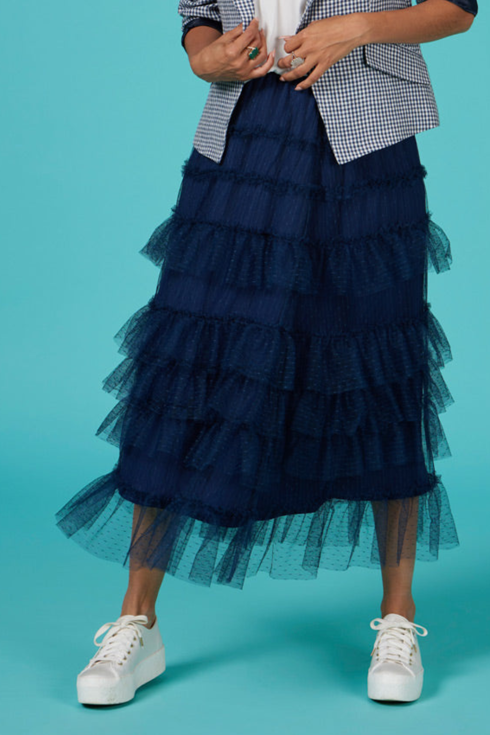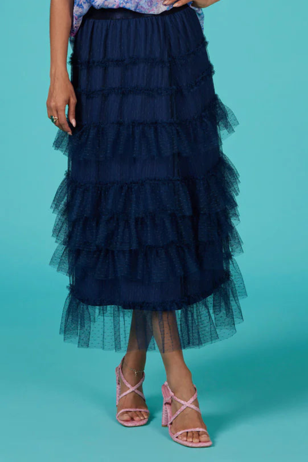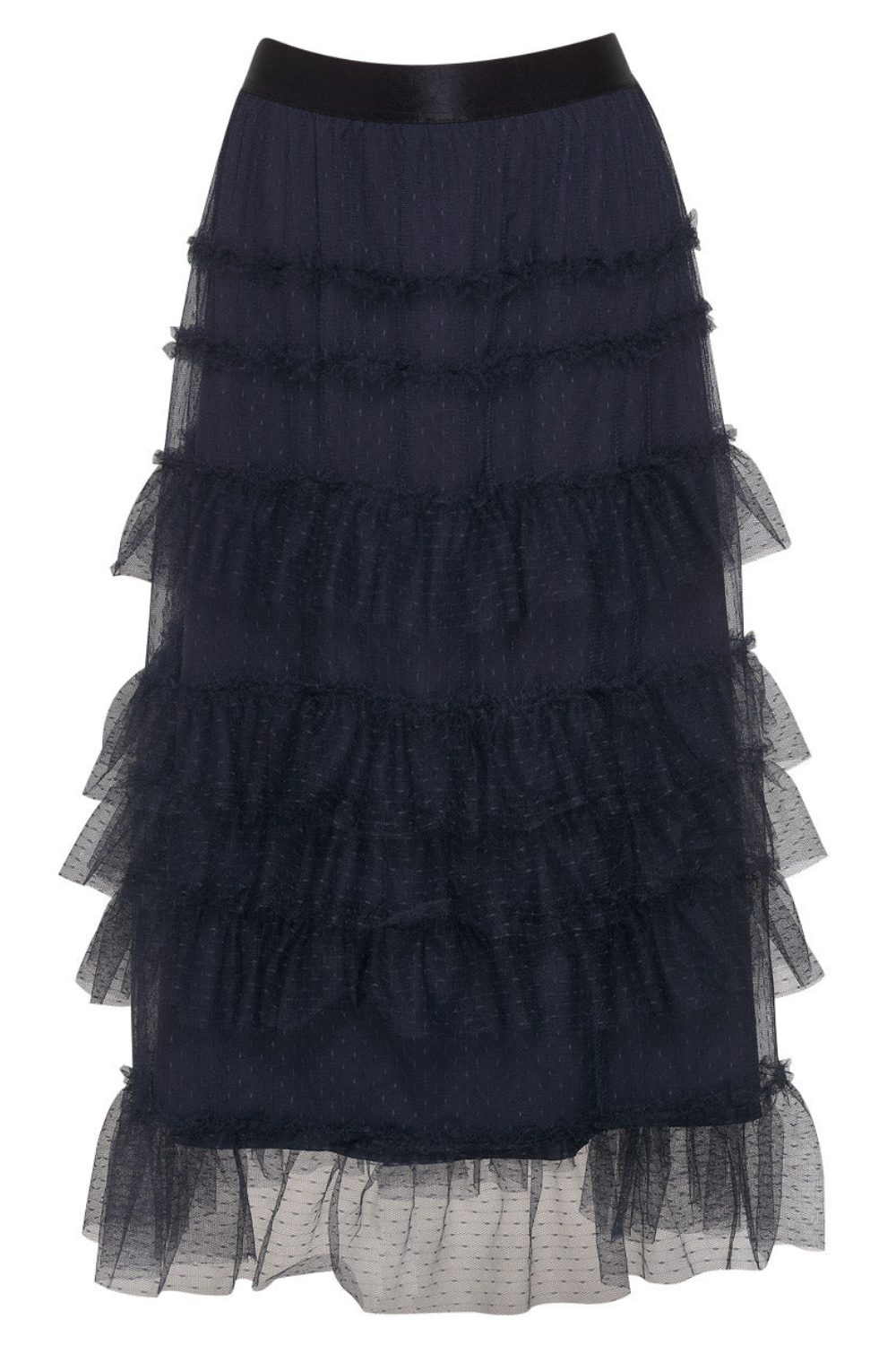 Hail spot tulle skirt with an elasticated waistband, featuring narrow stitched down ruffles circle the top skirt, with deeper ruffles layered from the hip downwards. Fully lined. Also Available in Mocha and Pink Lemonade.