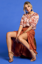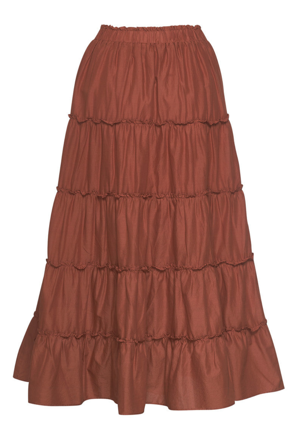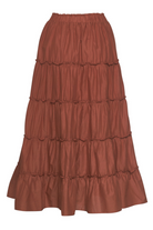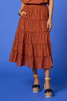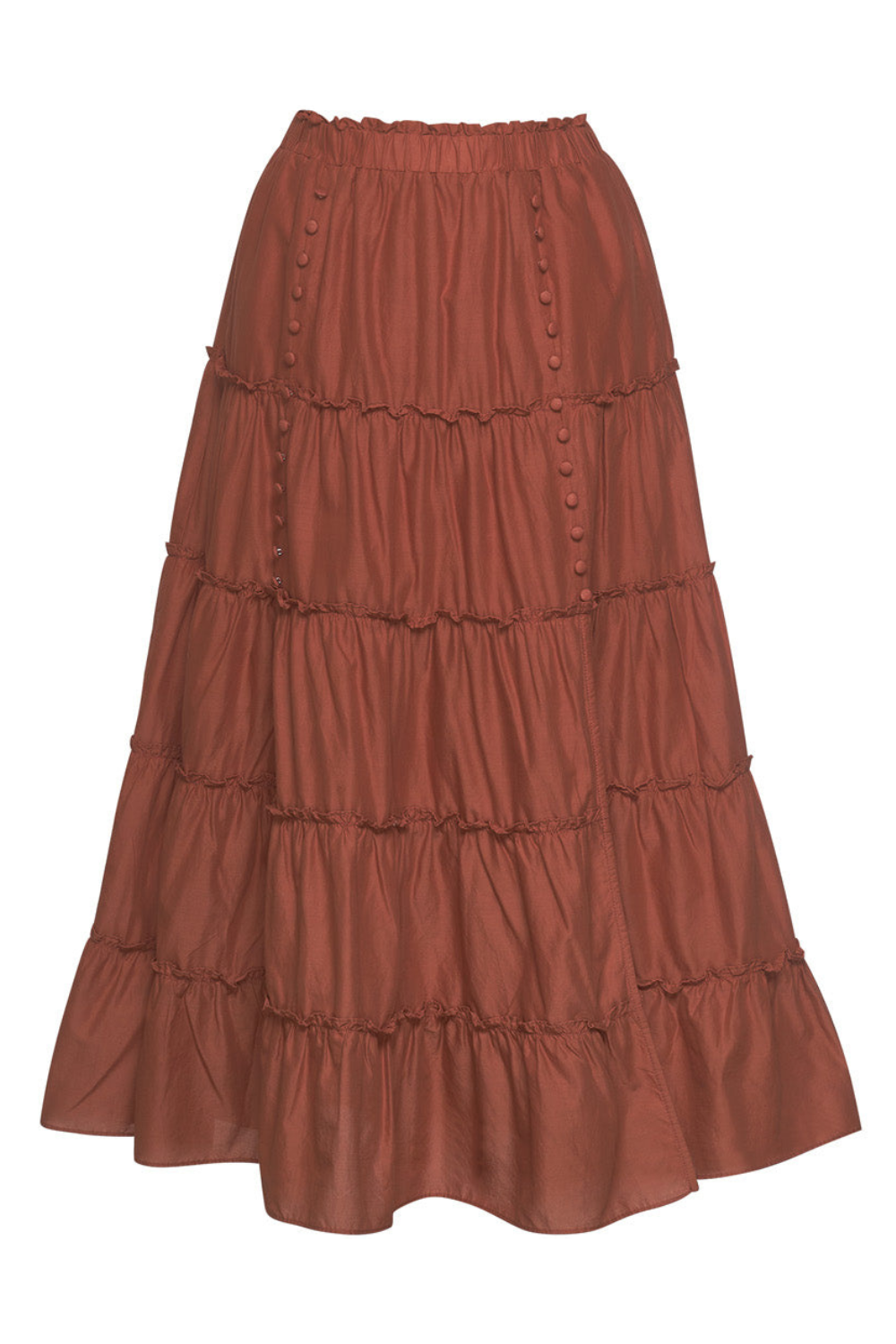 Tiered skirt with an elasticated waistband and front splits, featuring exposed embroidered gathers and covered buttons, with concealed pockets.