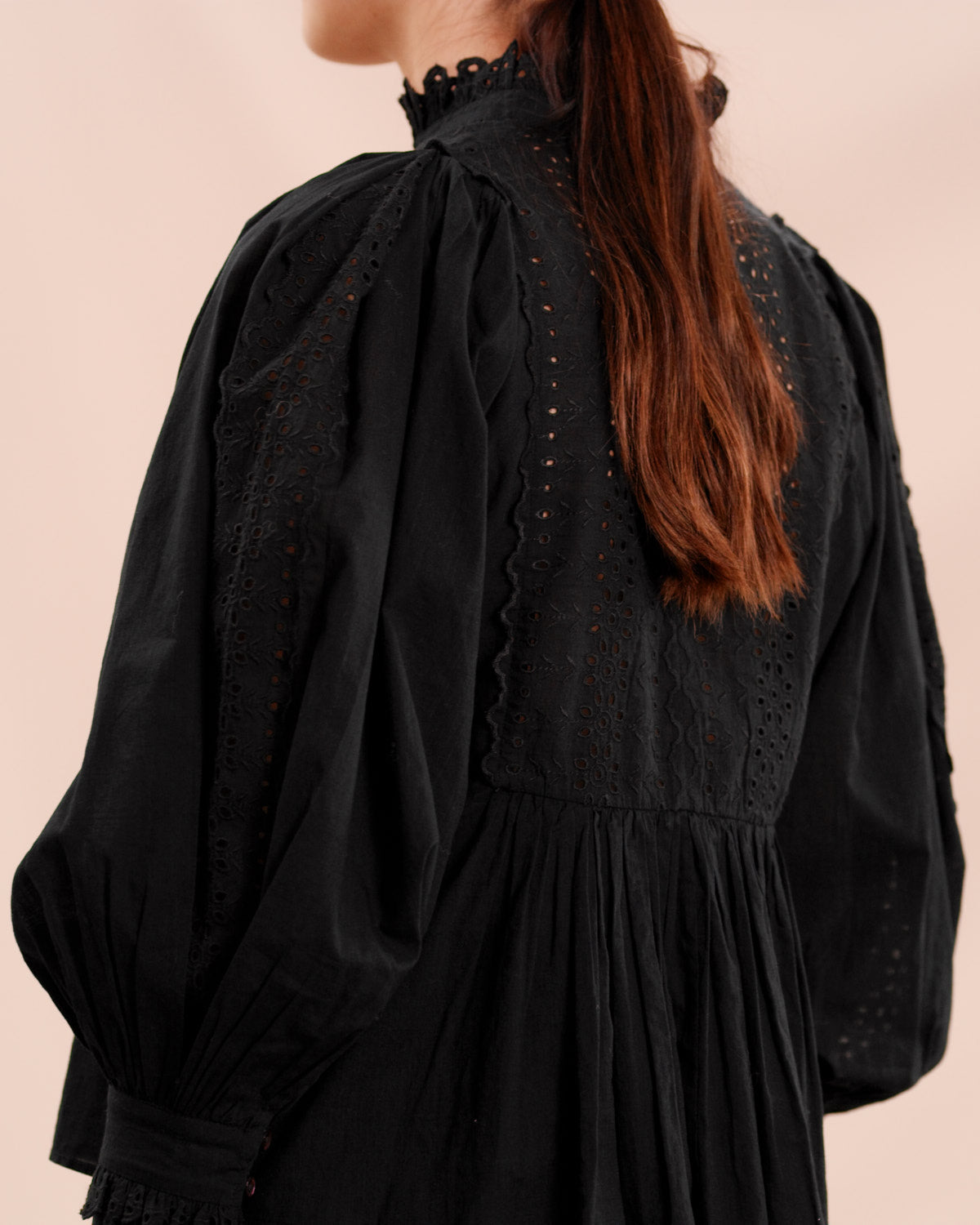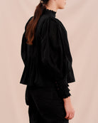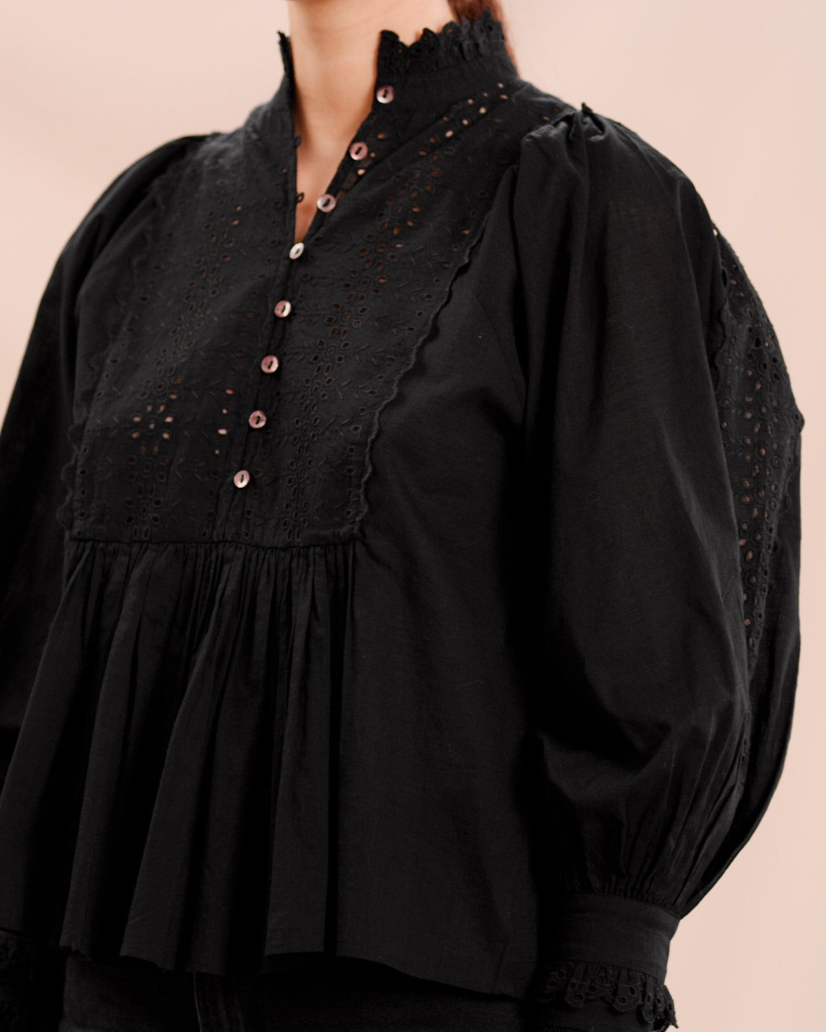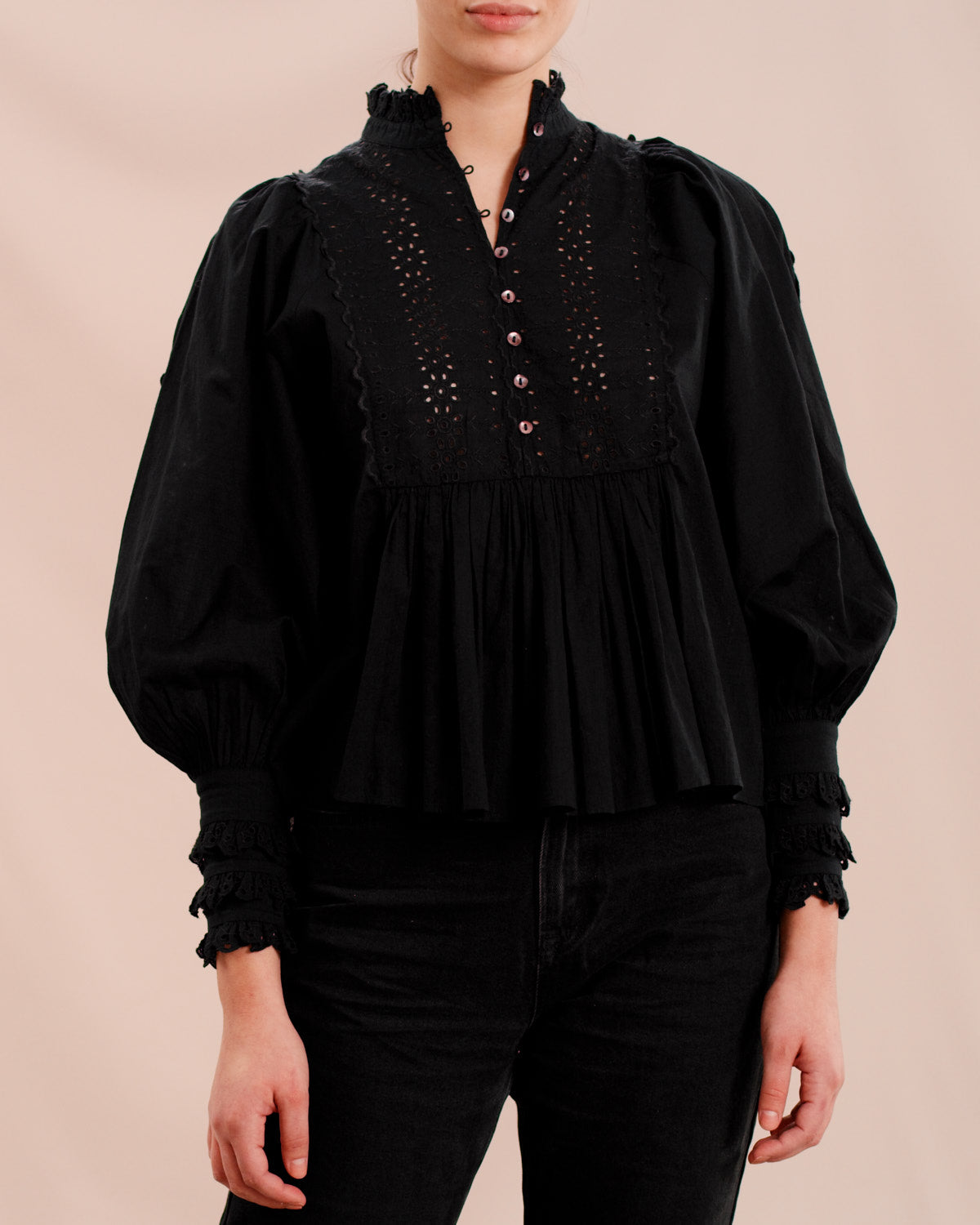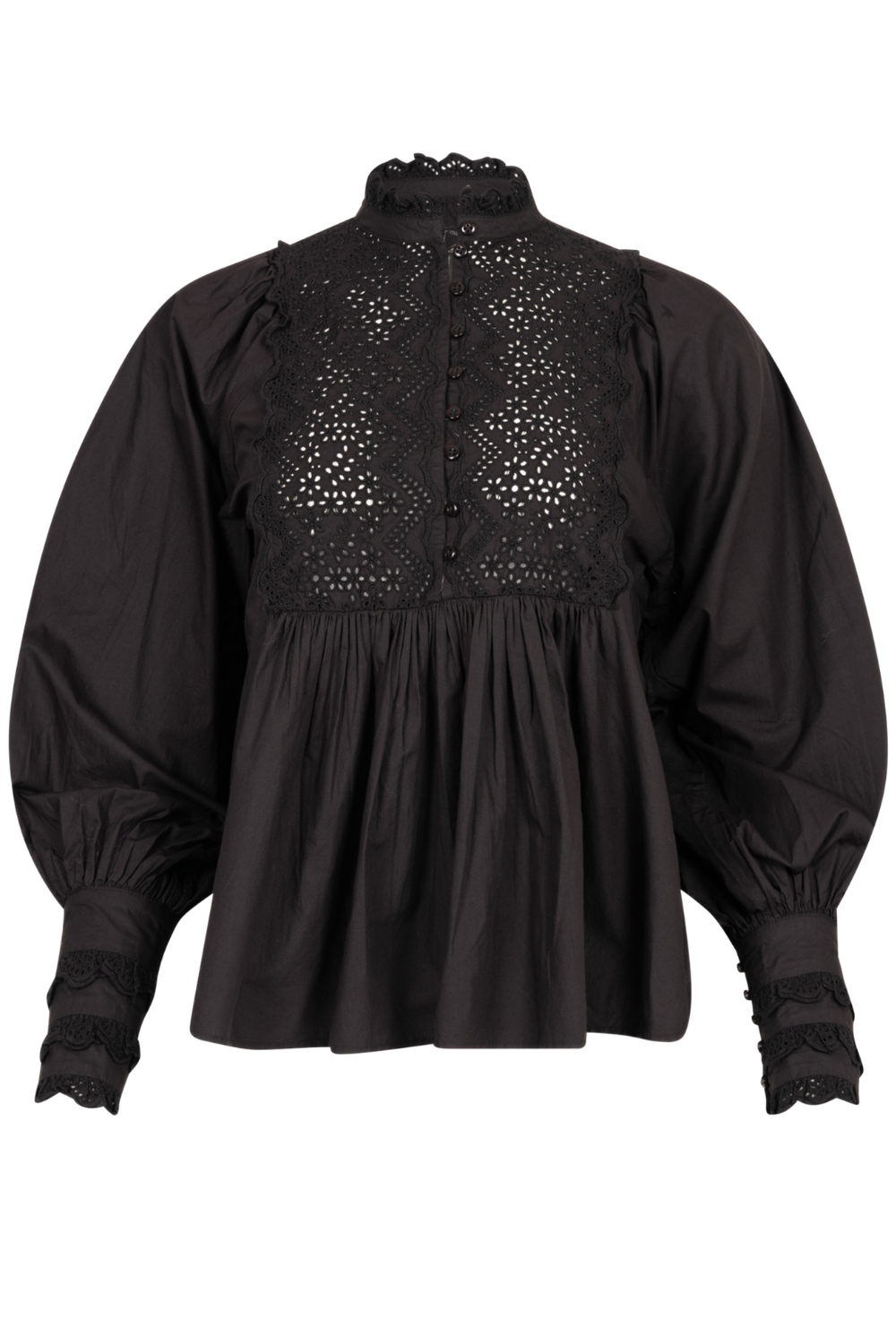 This lovely blouse has a high neck, voluminous sleeves and a flared shape with a peplum effect at the waist. The details are many in the Cotton Slub Blouse, such as the detailed lace parts on the chest, the row of buttons at the front, narrow cuffs with frilled lace details and the lace edging in the collar. Pair the Decorated Poplin Blouse from ByTimo with some stylish dress pants, or go for a more romantic look and pair it with a skirt.
