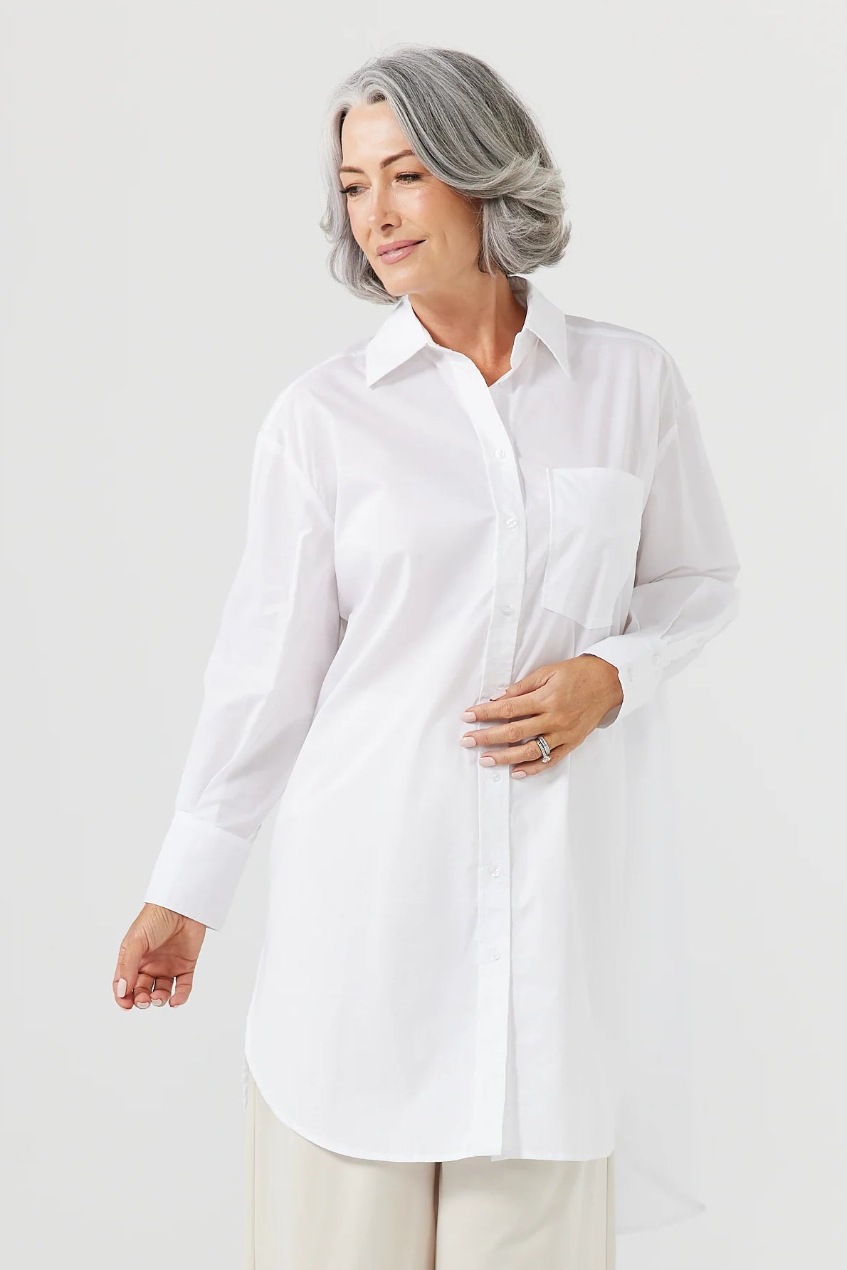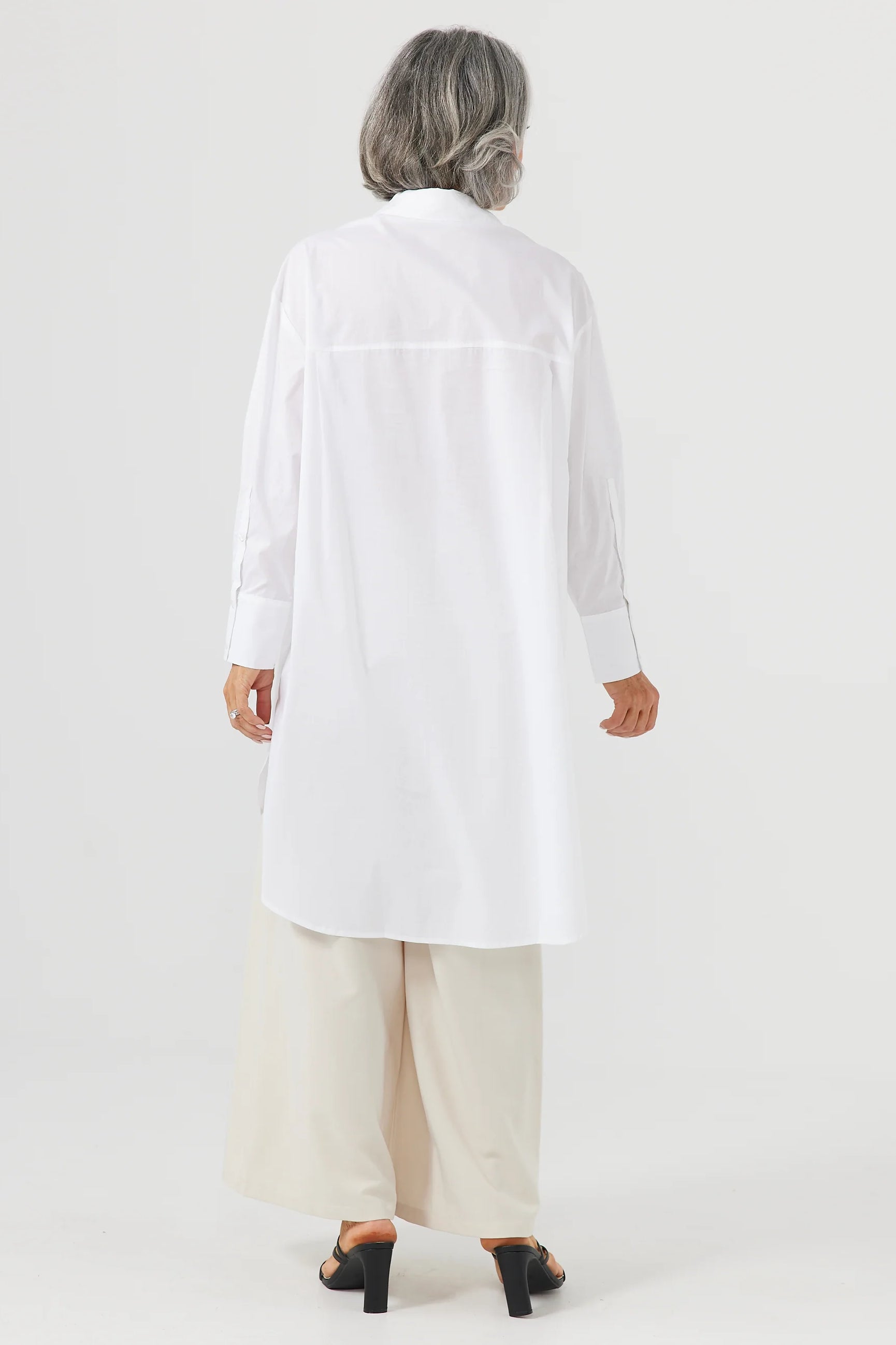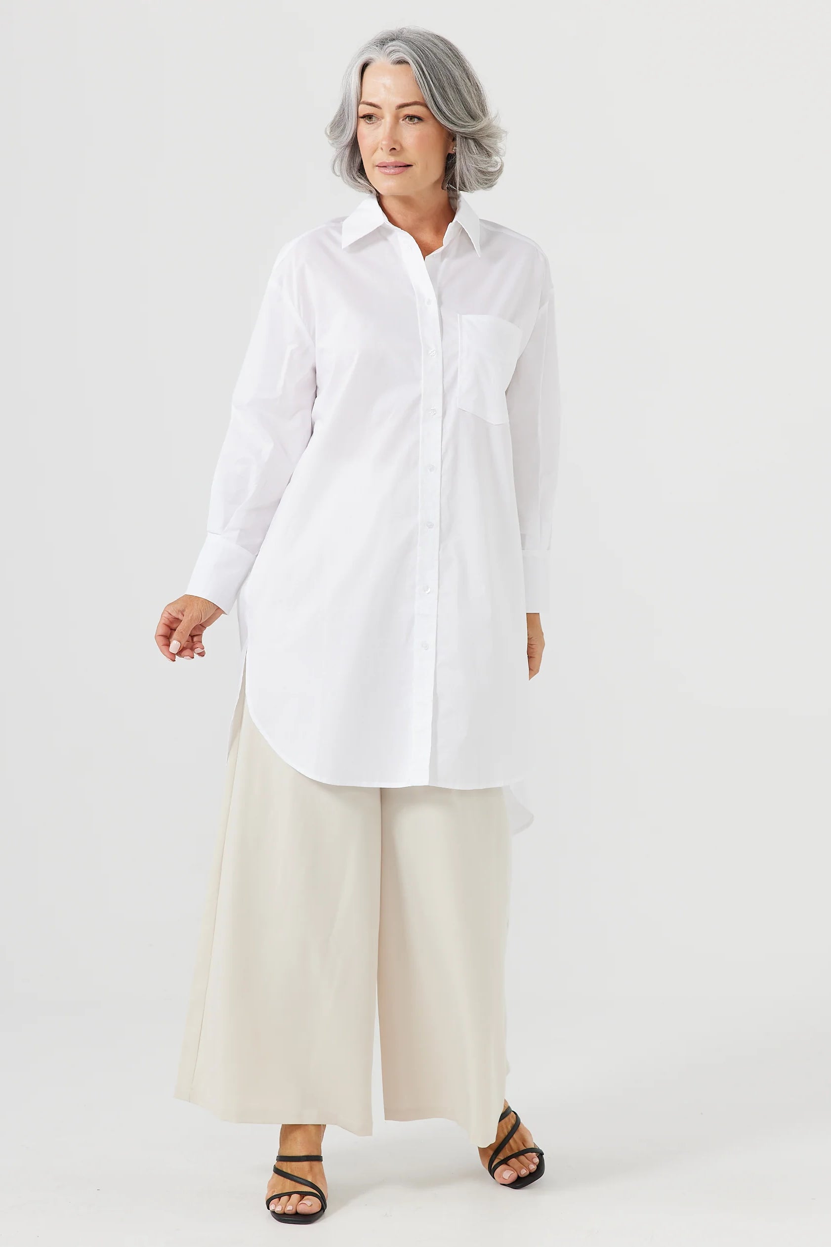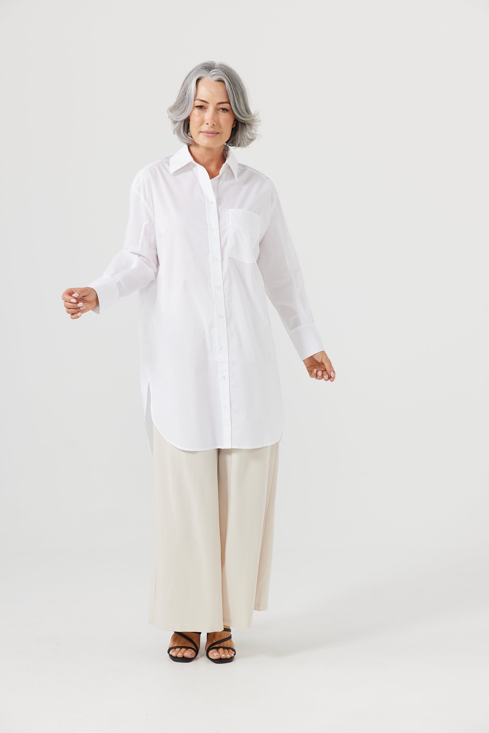 A good white shirt is the key piece to a perfect wardrobe. Take charge like a General in this classic long line over shirt. Elegant design lines make this the most flattering and versatile shirt to grace your wardrobe. Wear it buttoned up, or open as a layering piece.